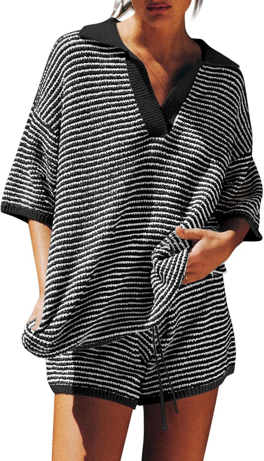 Women Summer 2 Piece Lounge Sets Striped Short Sleeve Tee Shirts Mini Shorts Loungewear Shorts Set Ribbed Pajama Set