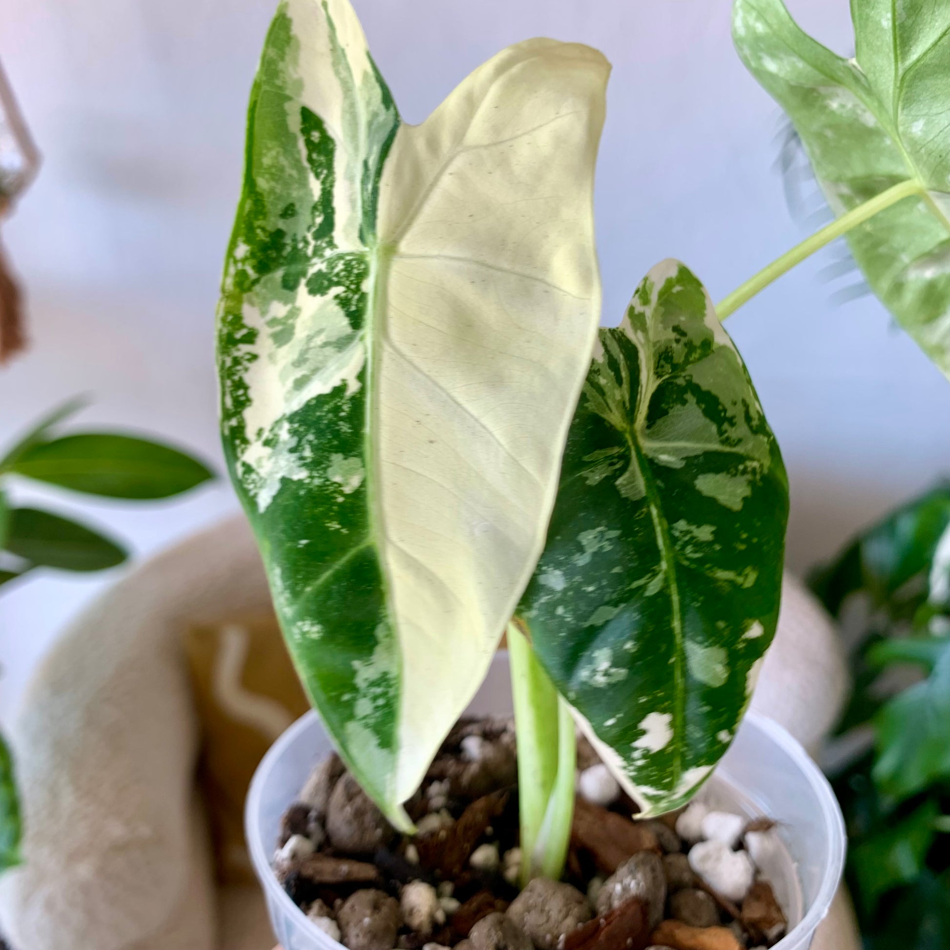 The breathtaking Variegated Alocasia 'Frydek' is a sought-after indoor plant, cherished for its striking mix of variegated colors. It boasts a captivating blend of deep greens, creams, and whites, making it a must-have for avid plant enthusiasts who crave one-of-a-kind and tropical species. The Variegated Frydek is not only a quick grower, but its visual appeal is much appreciated.
