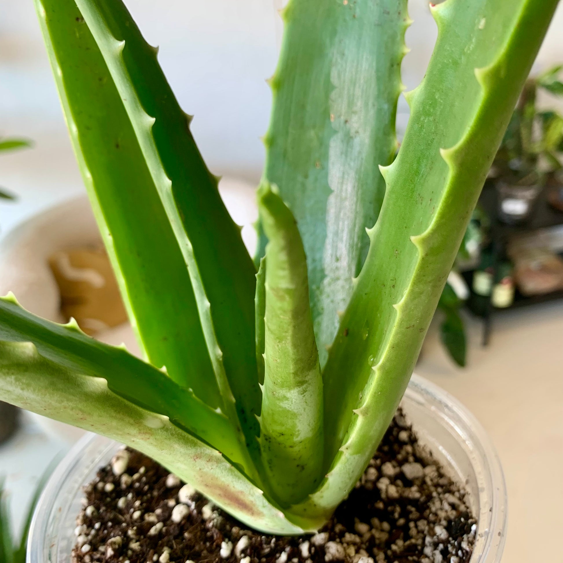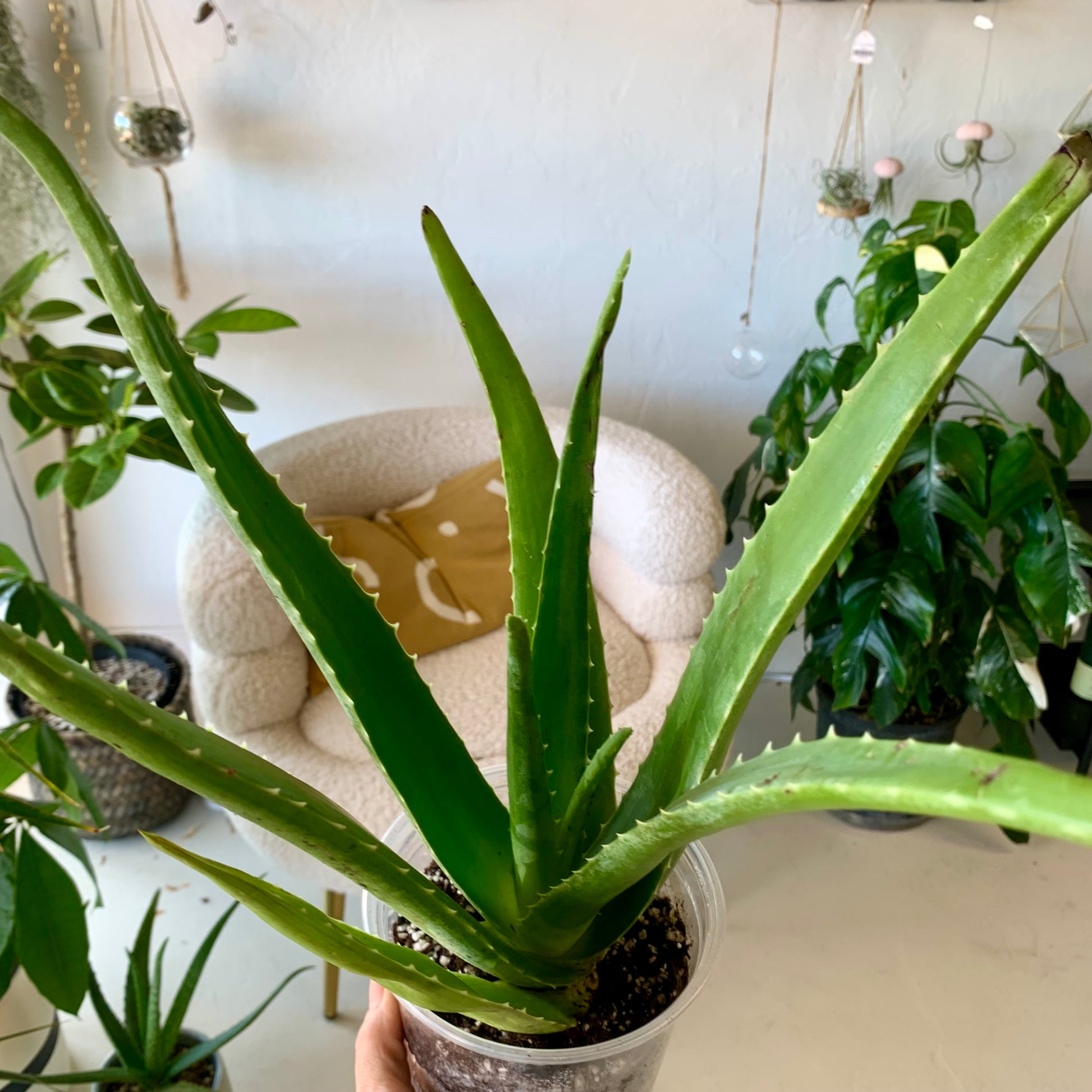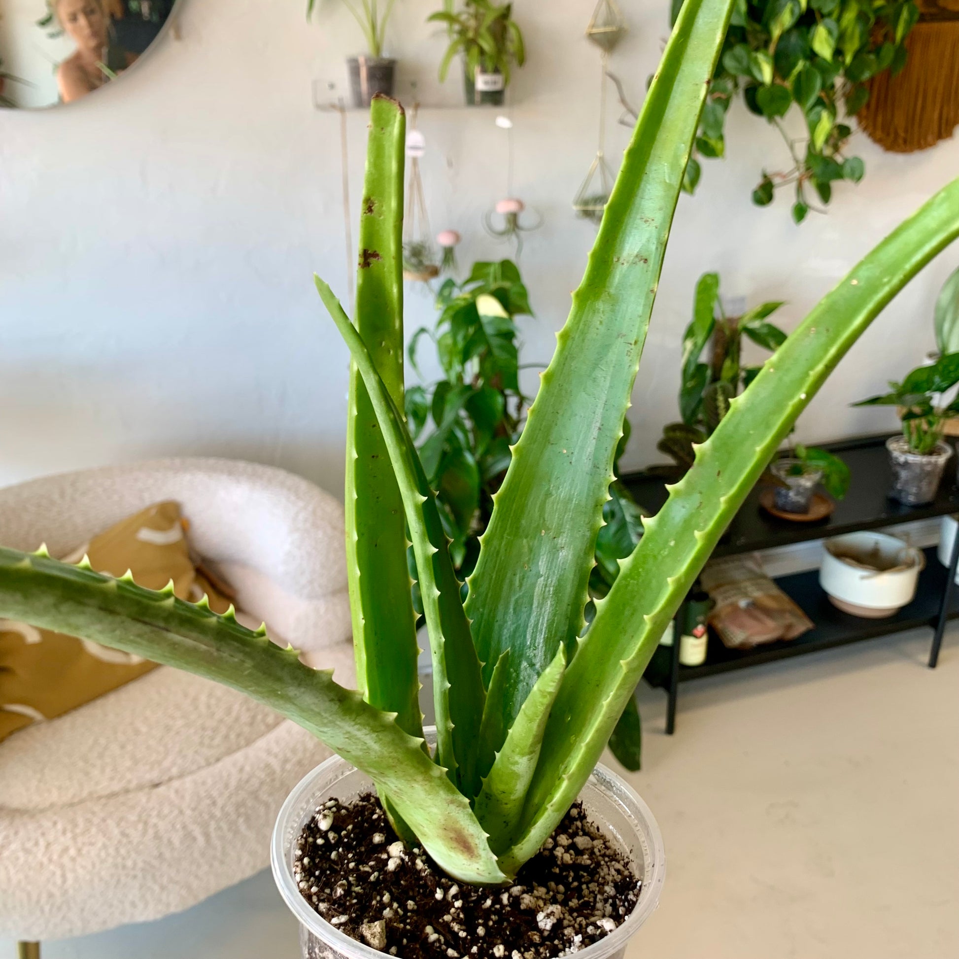 Known for its medicinal and topical properties, Aloe is a fleshy succulent that makes a great houseplant. Its foliage is made up of rigid, serrated spikes that form a rosette. Aloe is most often bright green in color but can have subtle color variations including red tips. Aloe can produce very large and very vibrant orange flowers but will reproduce via offsets.