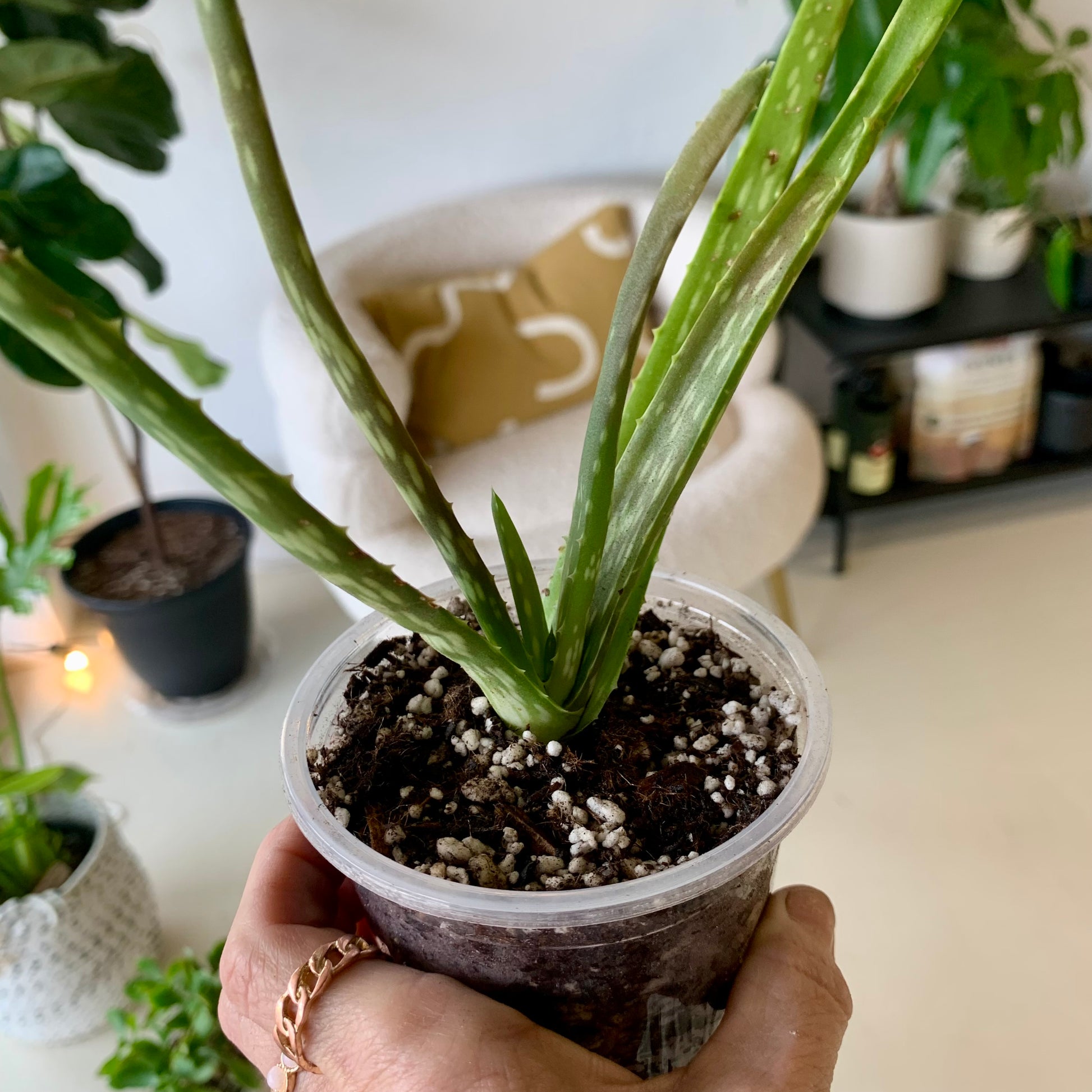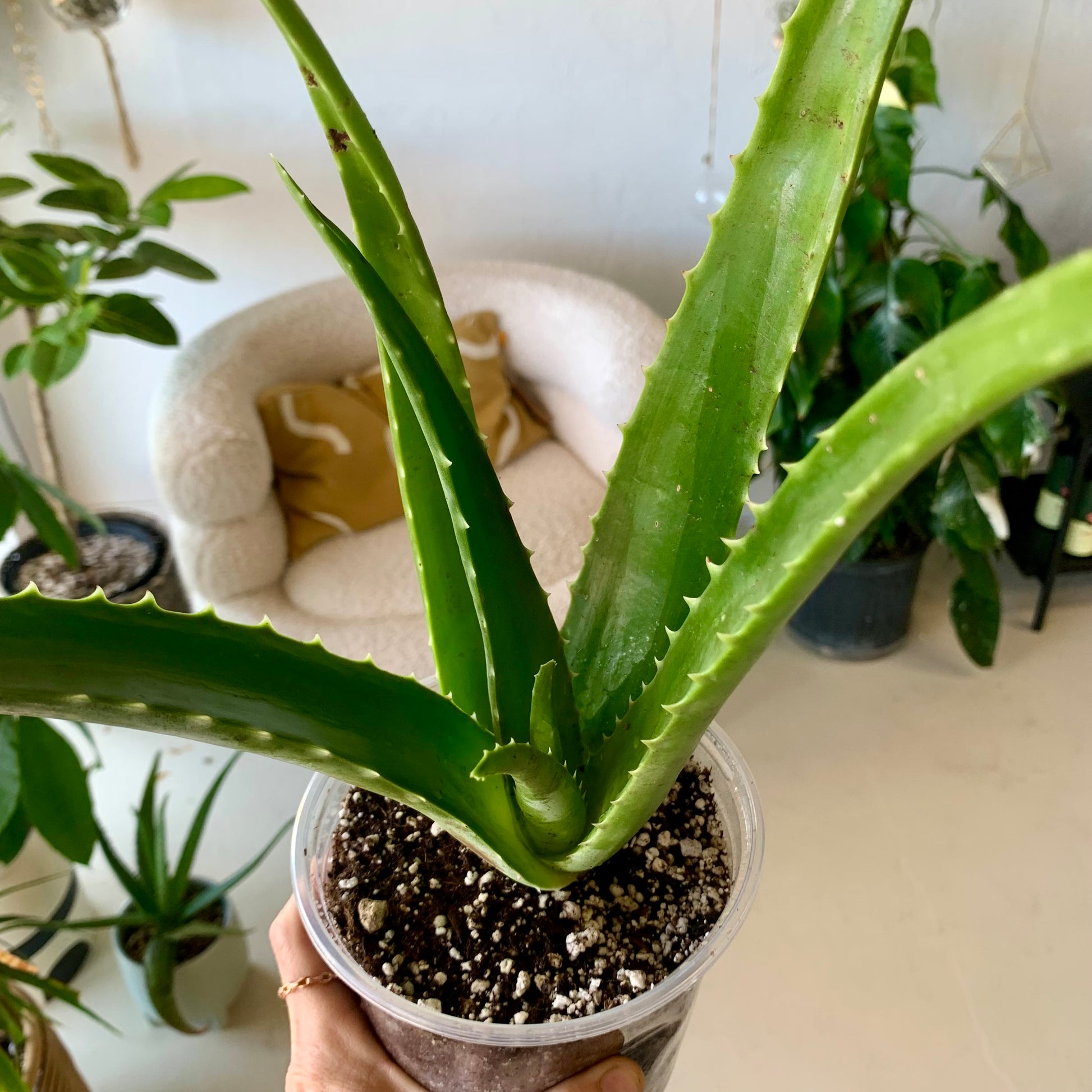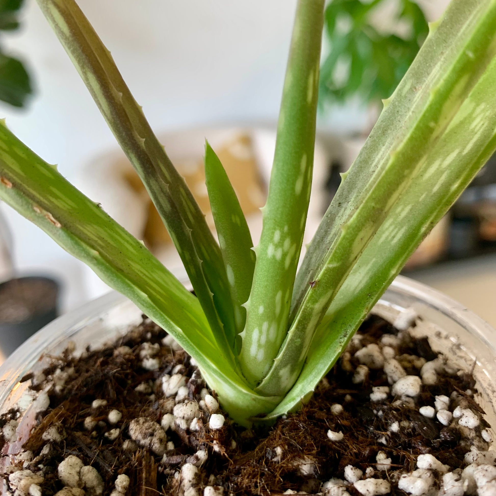 Known for its medicinal and topical properties, Aloe is a fleshy succulent that makes a great houseplant. Its foliage is made up of rigid, serrated spikes that form a rosette. Aloe is most often bright green in color but can have subtle color variations including red tips. Aloe can produce very large and very vibrant orange flowers but will reproduce via offsets.