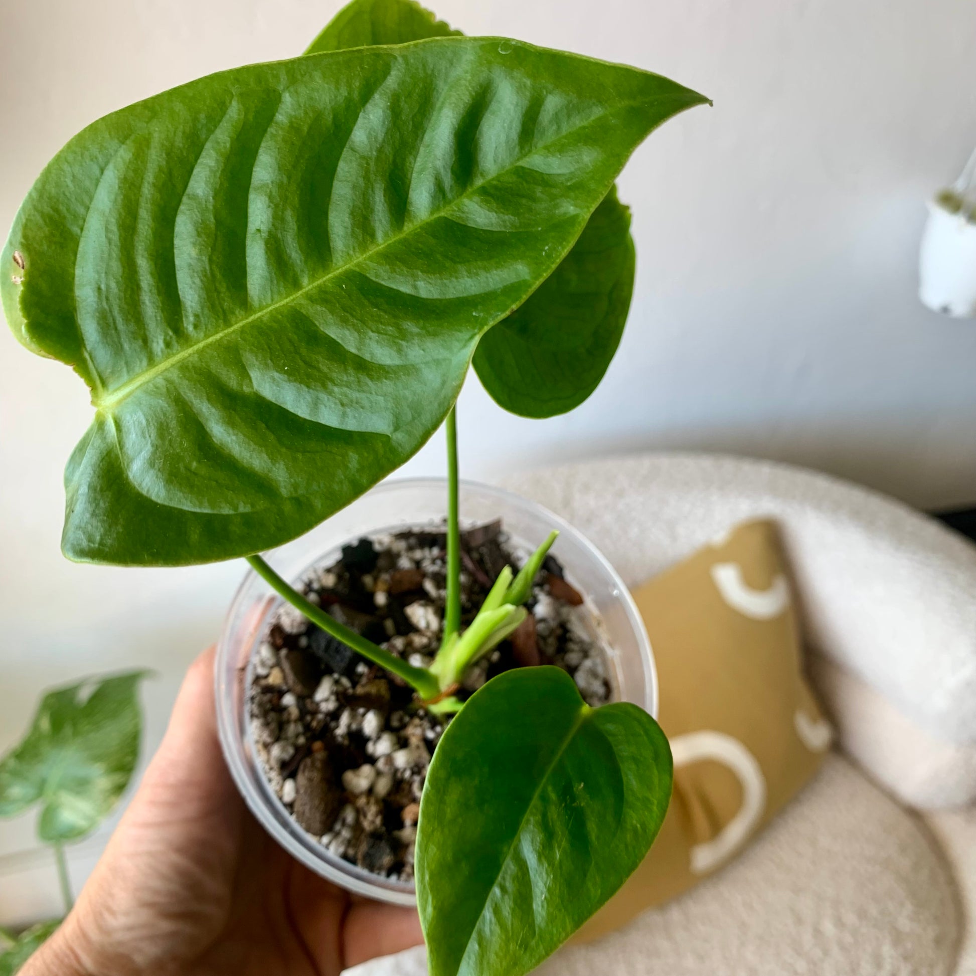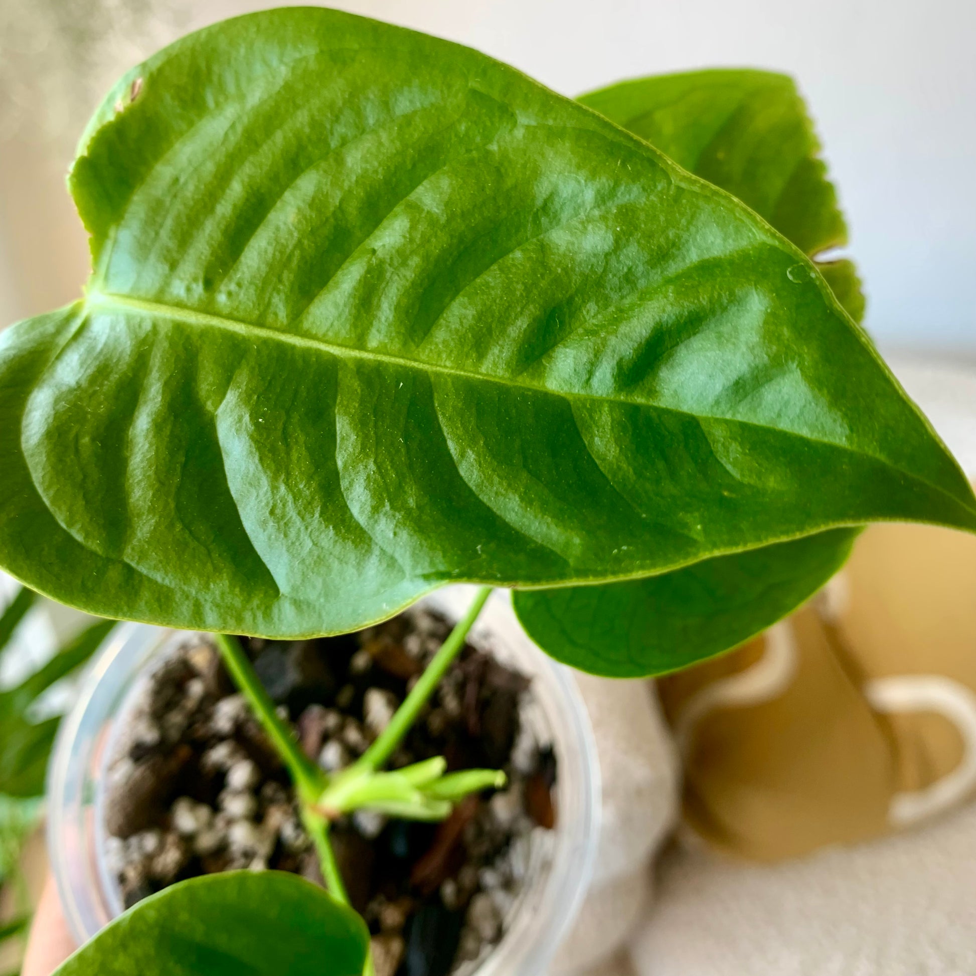 Often referred to as "The King", Anthurium veitchii produces some of the most spectacular leaves in the genus.  They can achieve lengths of over 3' and a spectacular long rippled leaves that have pleated texture that reflects light in such a way that they seem otherworldly.