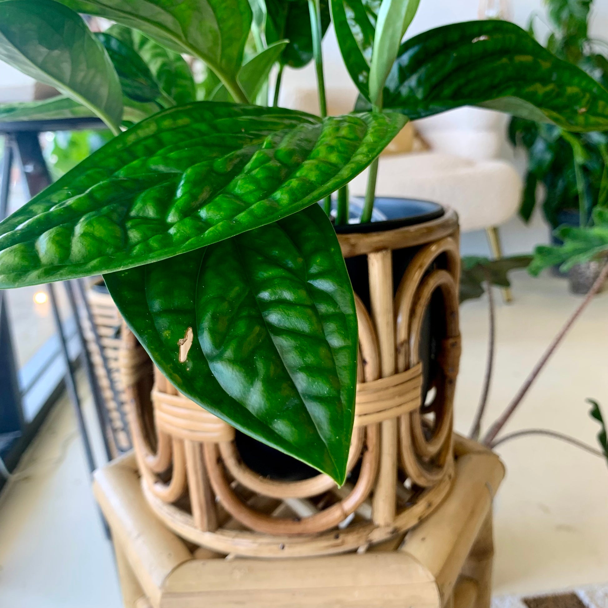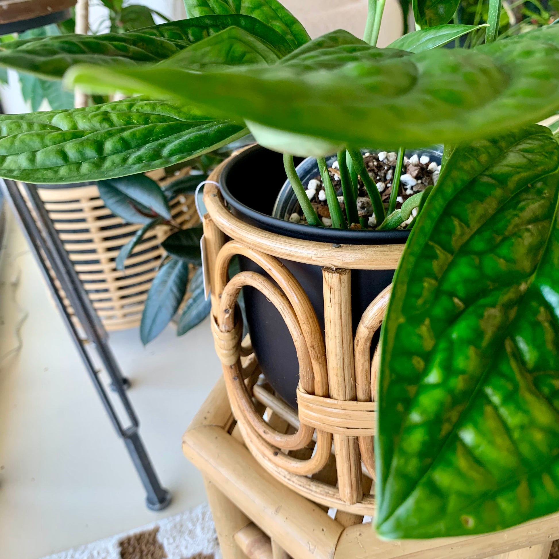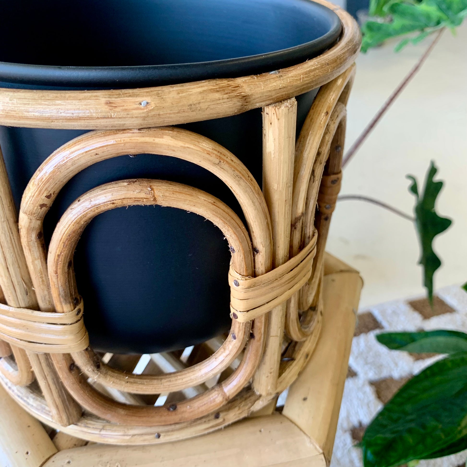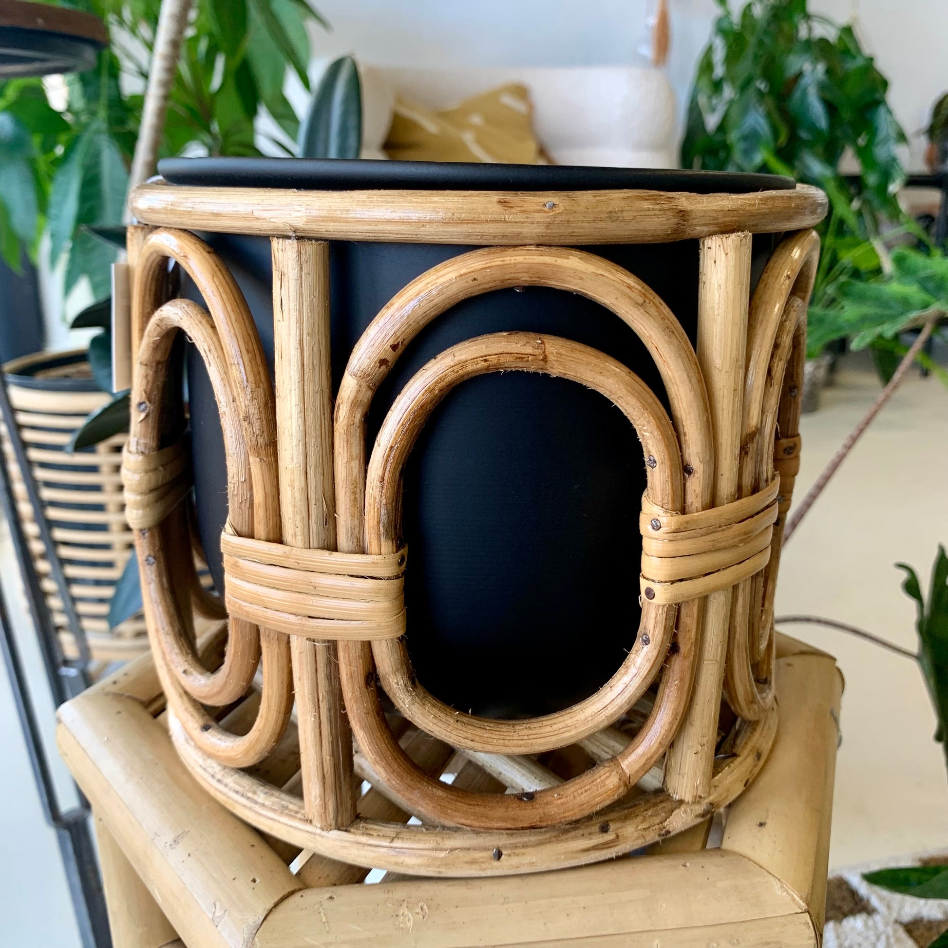 Elevate your indoor plant game with the Boca Planter. The sleek metal pot is perfectly complemented by the rattan cover, featuring a repeating oval pattern that exudes boho vibes. Bring a touch of nature and style to any room in your home with this must-have planter!