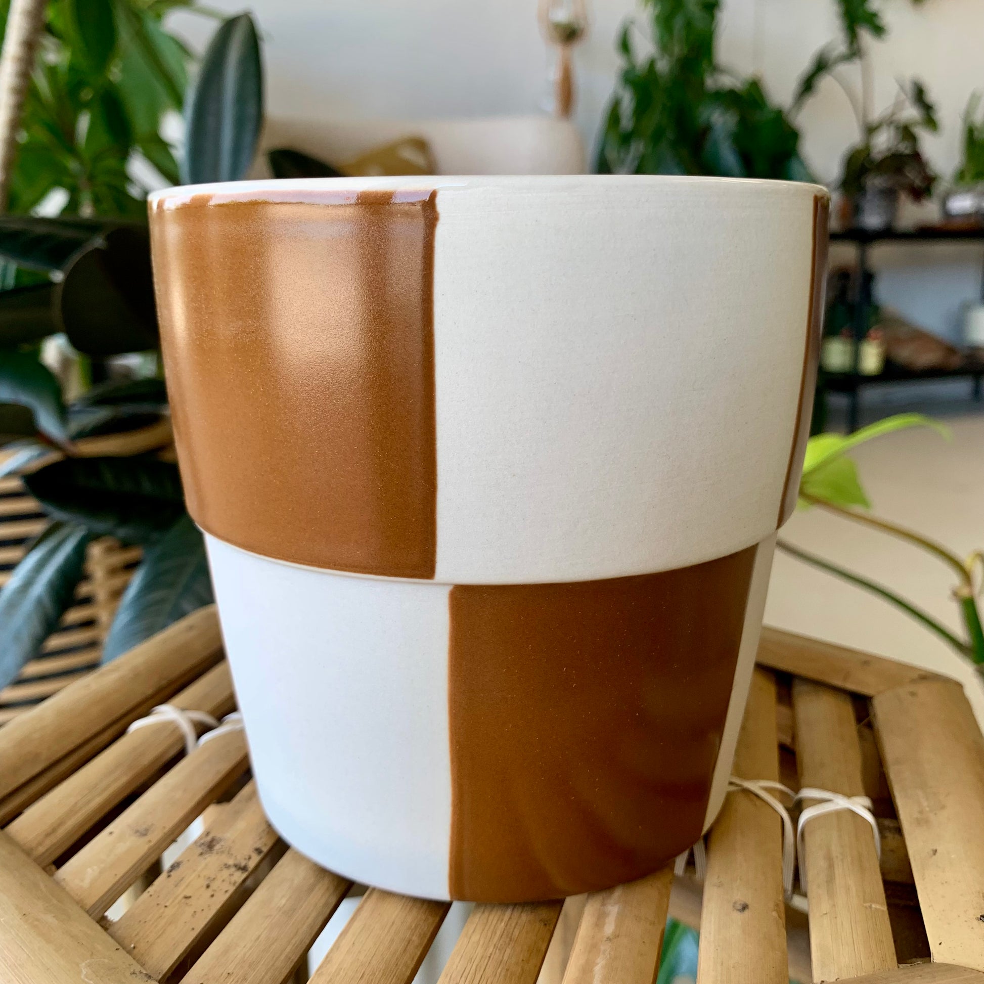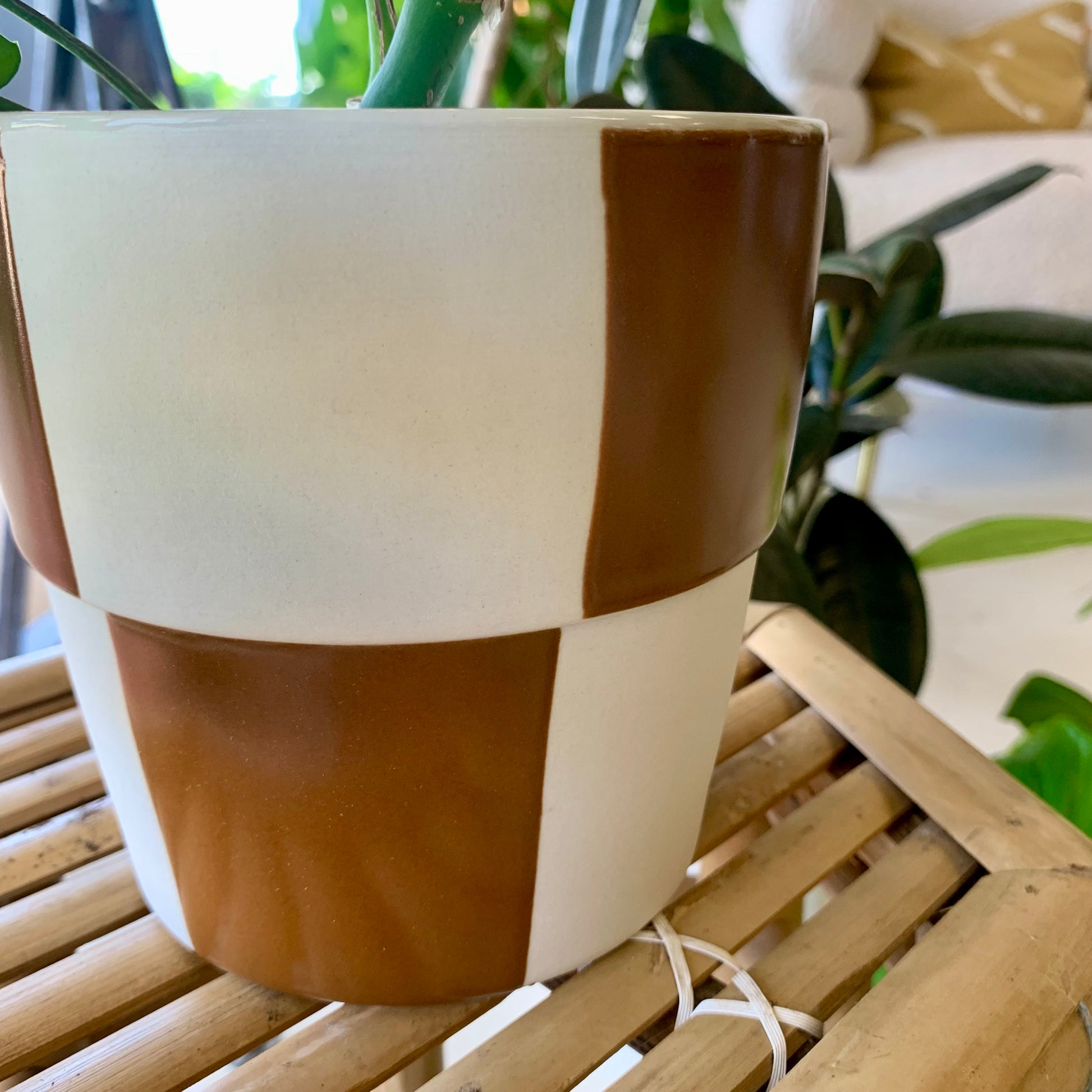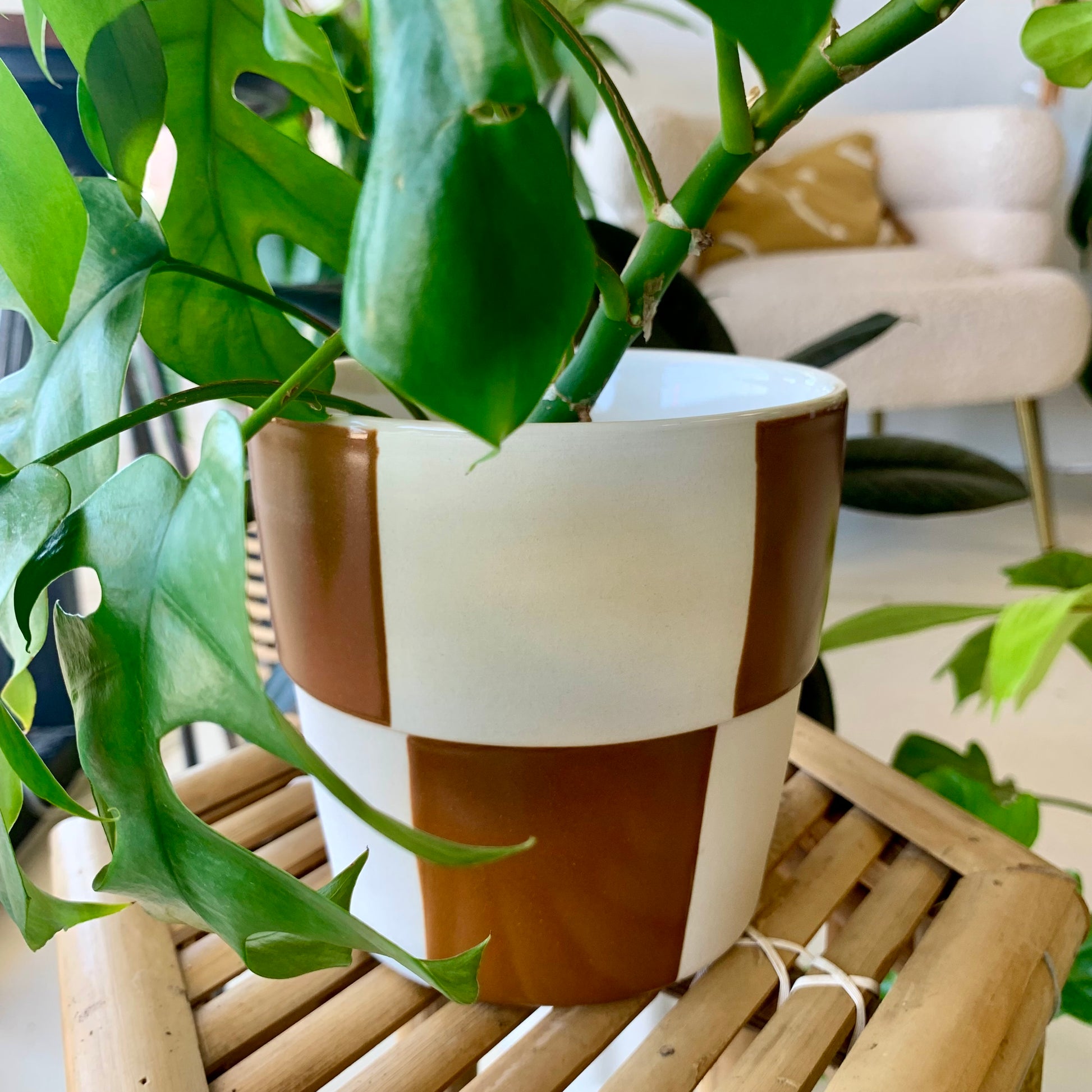 Checkerboard is taking the decor & fashion world by storm with its reimagined look. Add a plant to this hand painted brown & cream stoneware clay Checkerboard Pot & layer with other interesting items to give decor a finished look.