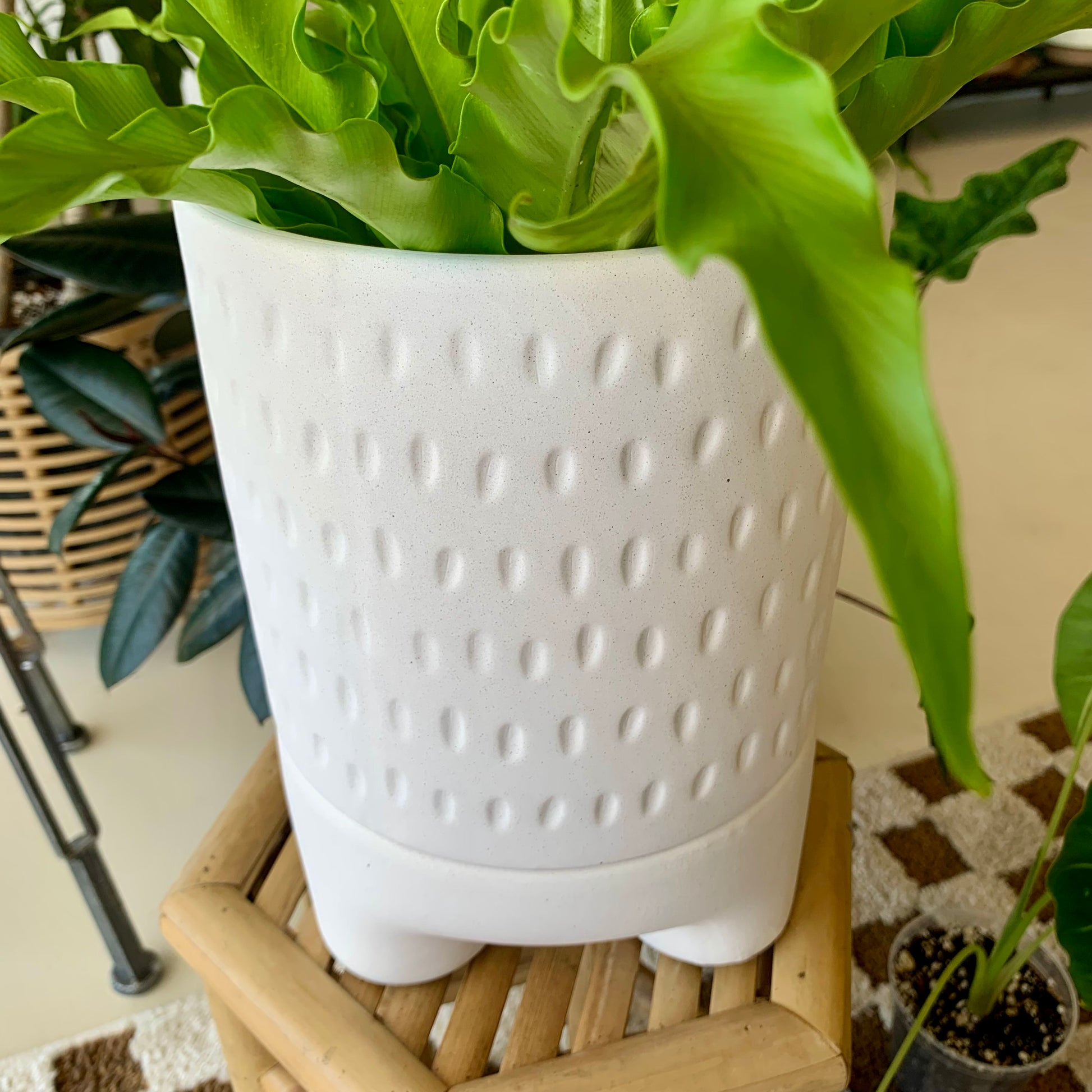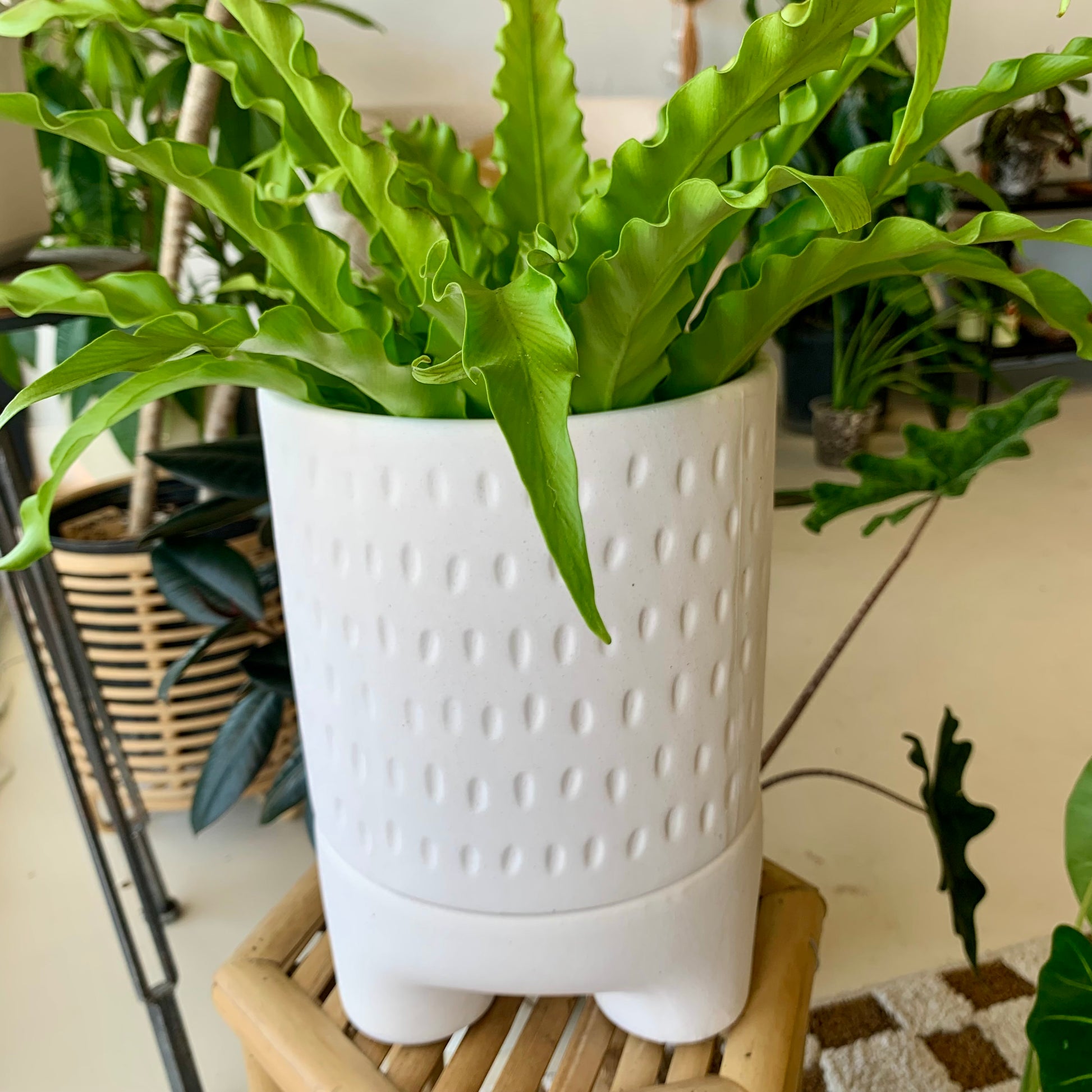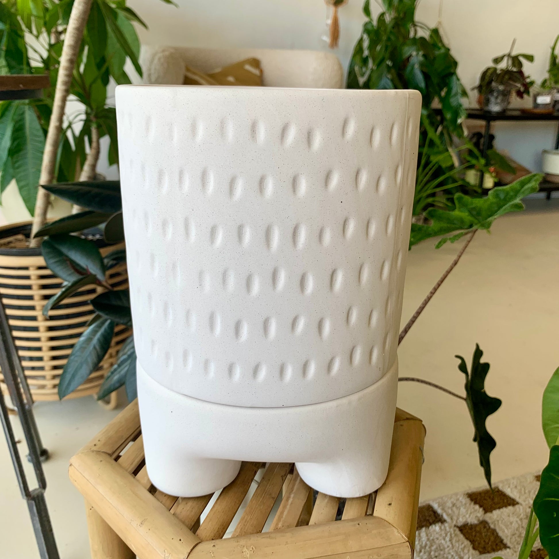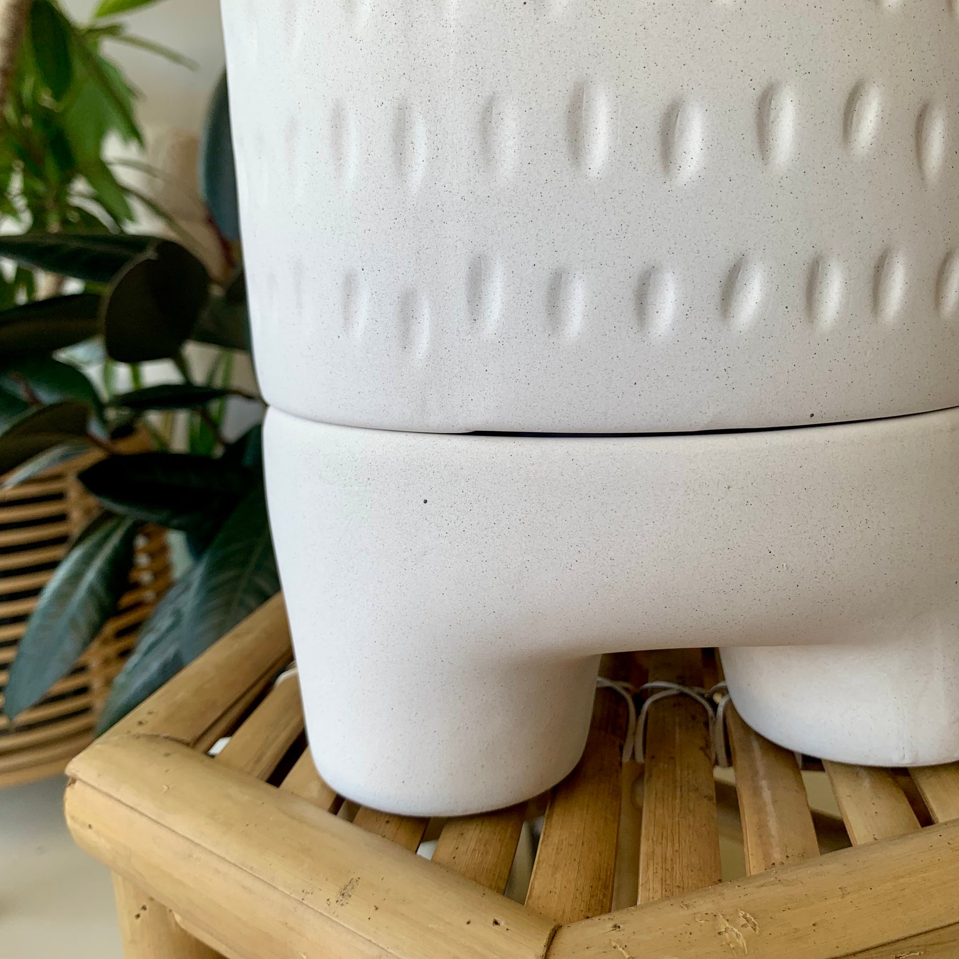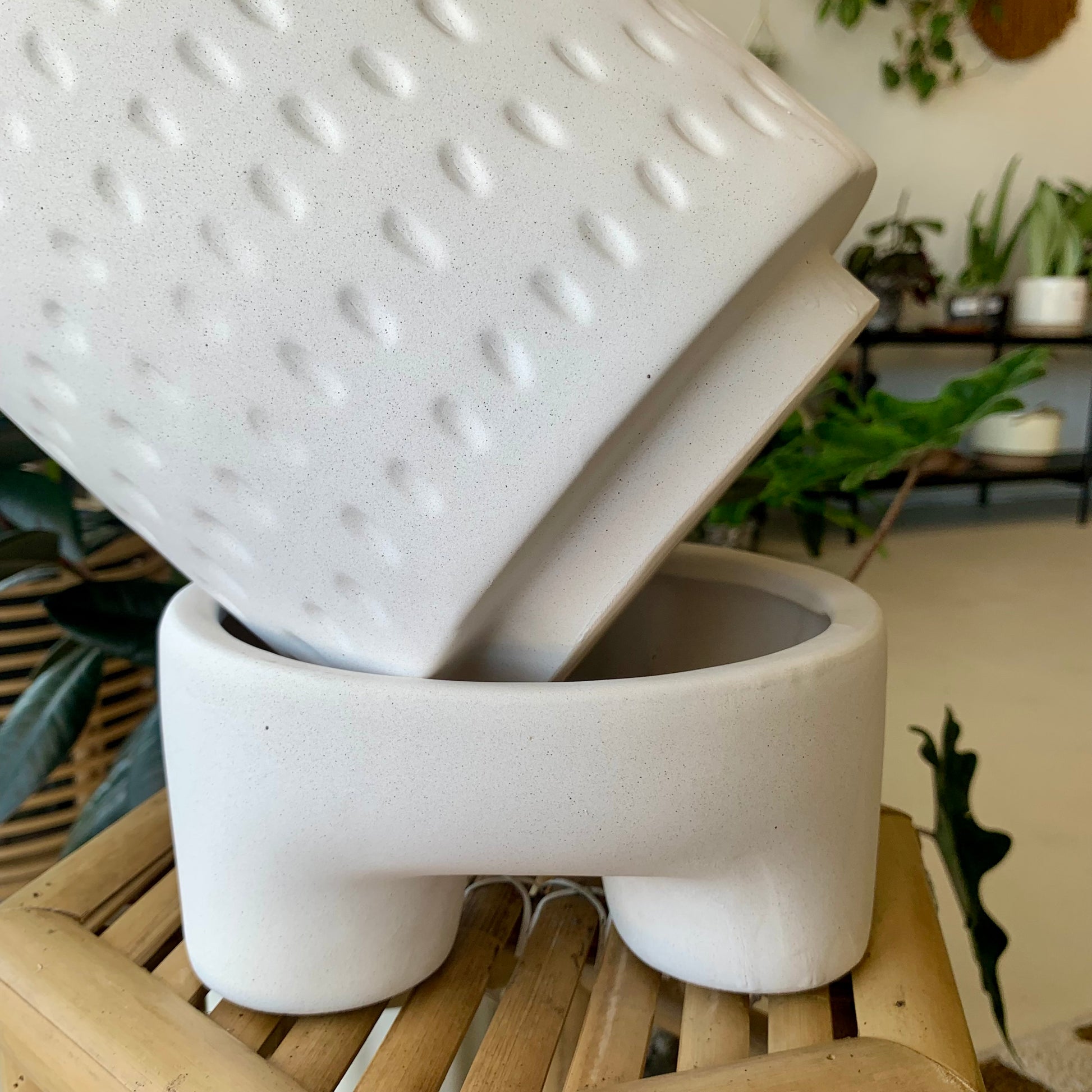 Transform your home into a modern oasis with the elegant and distinct design of our footed white planter. Embrace your individuality and stand out from the crowd with this one-of-a-kind piece. Elevate your space and make a bold statement with this must-have addition to your decor.