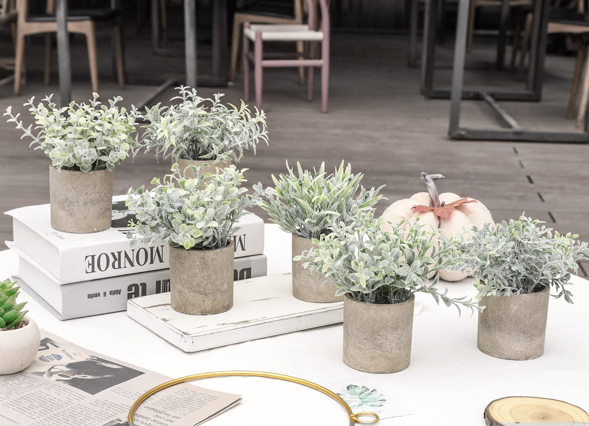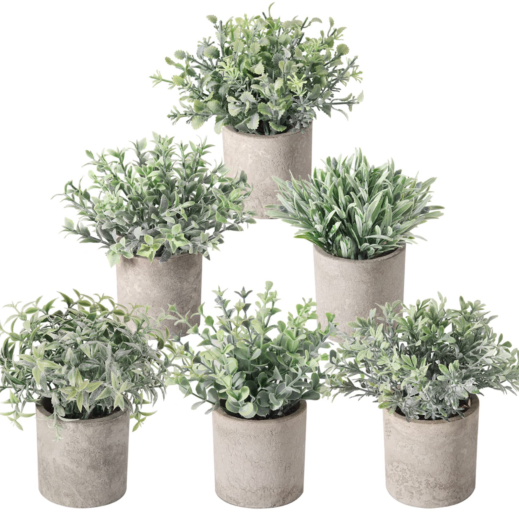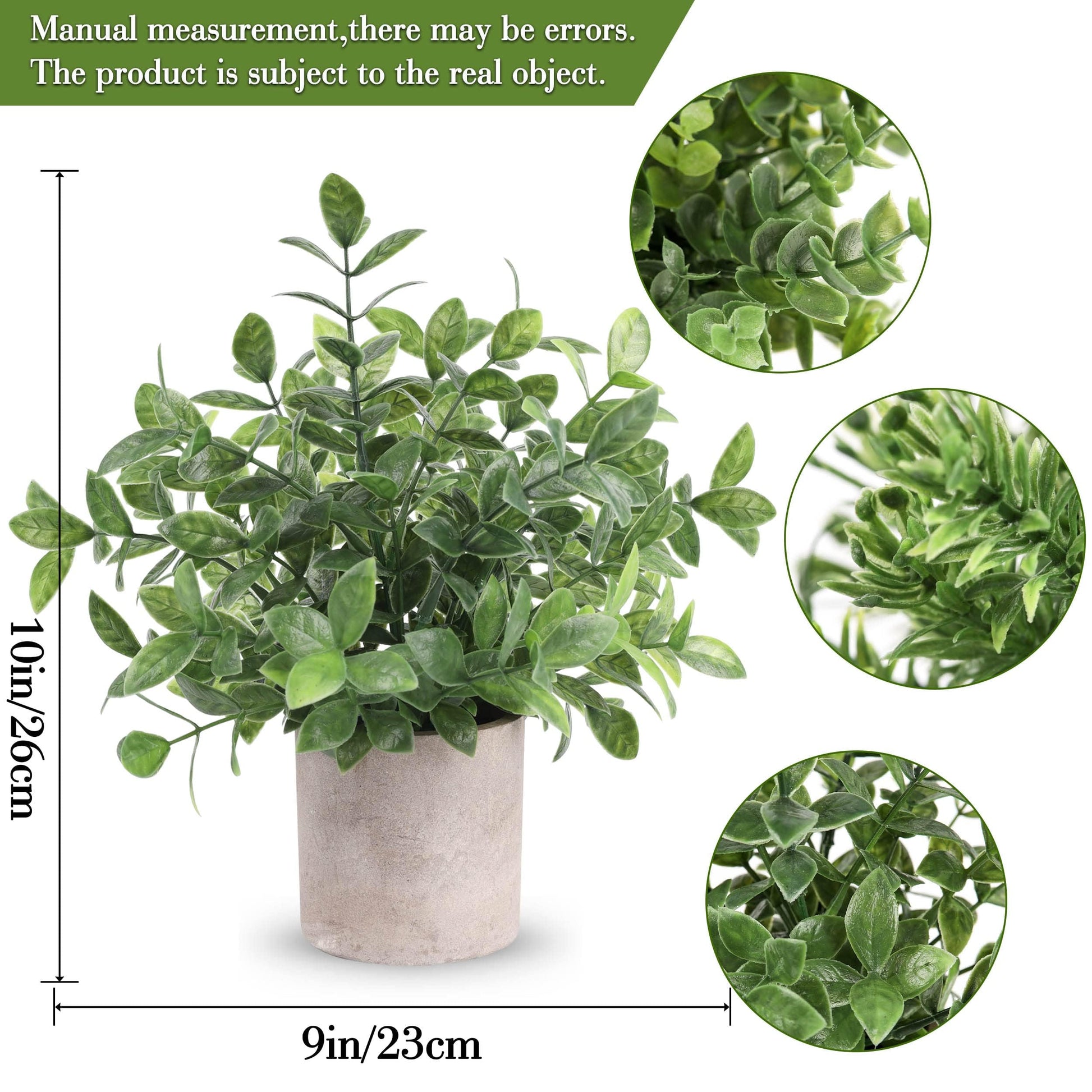 - Durable Material: Our mini potted artificial plants indoor have eucalyptus leaves that are made of plastic. The pot is made of good paper pulp, please do not put it in the water