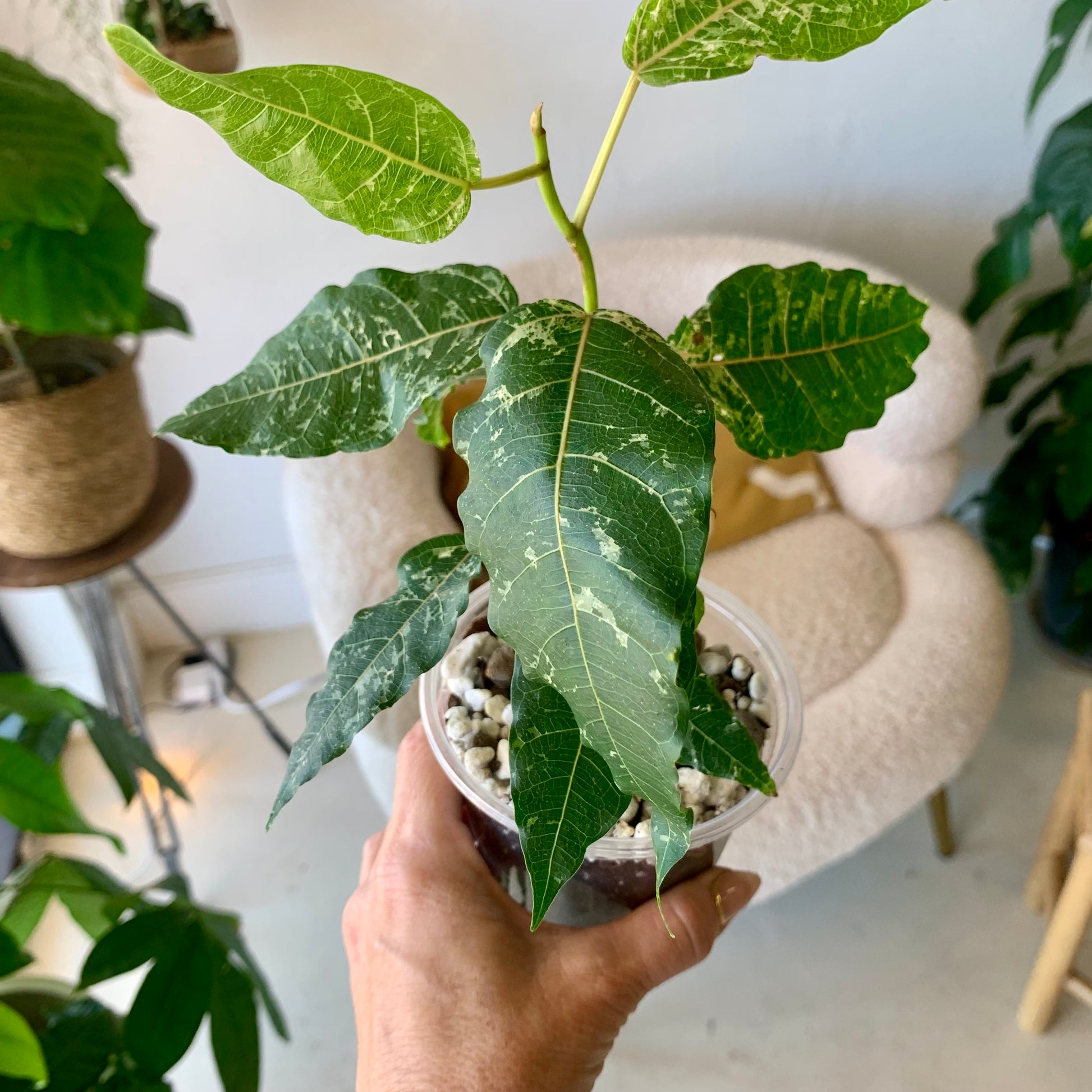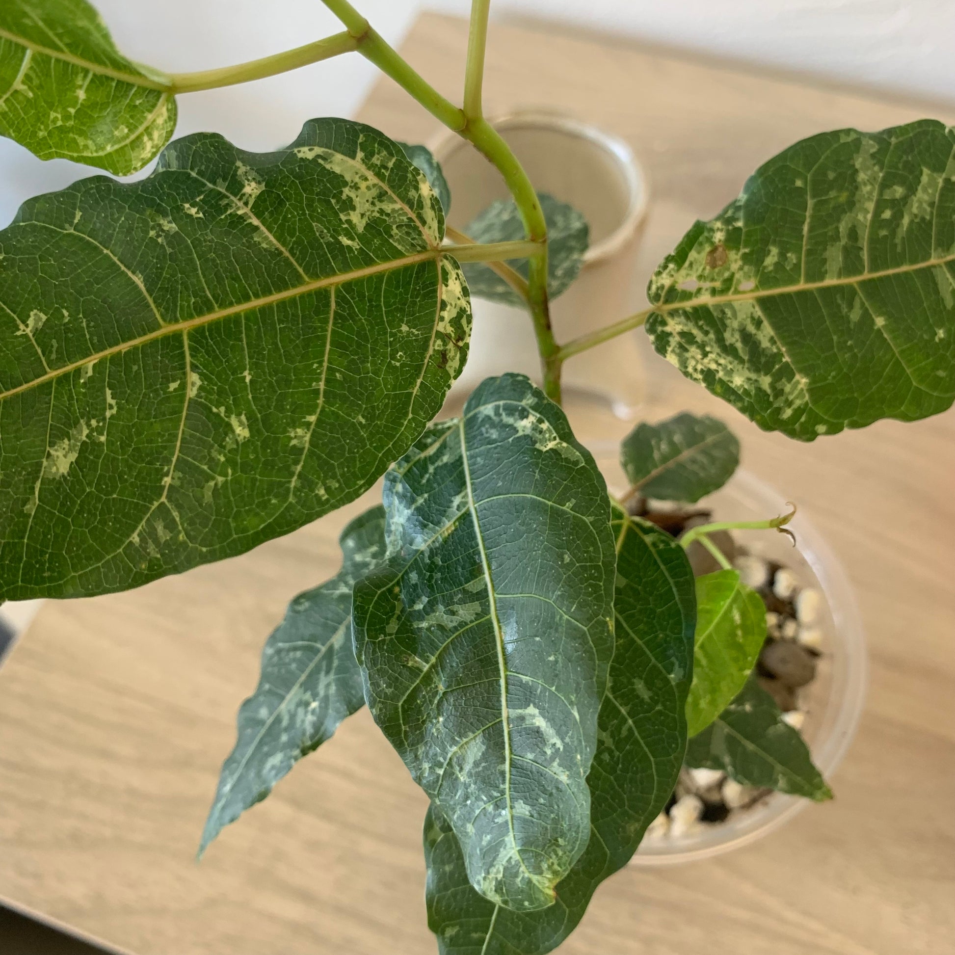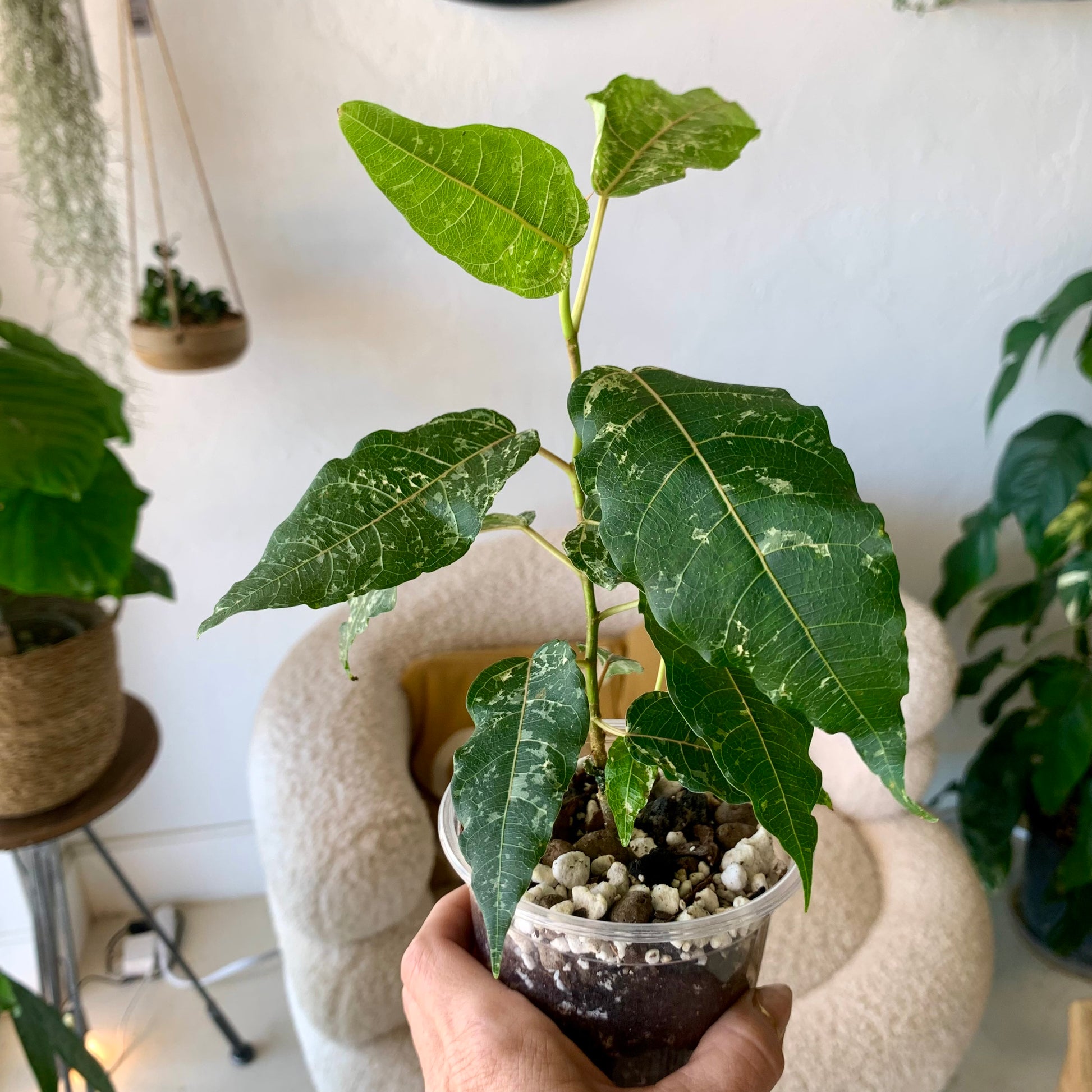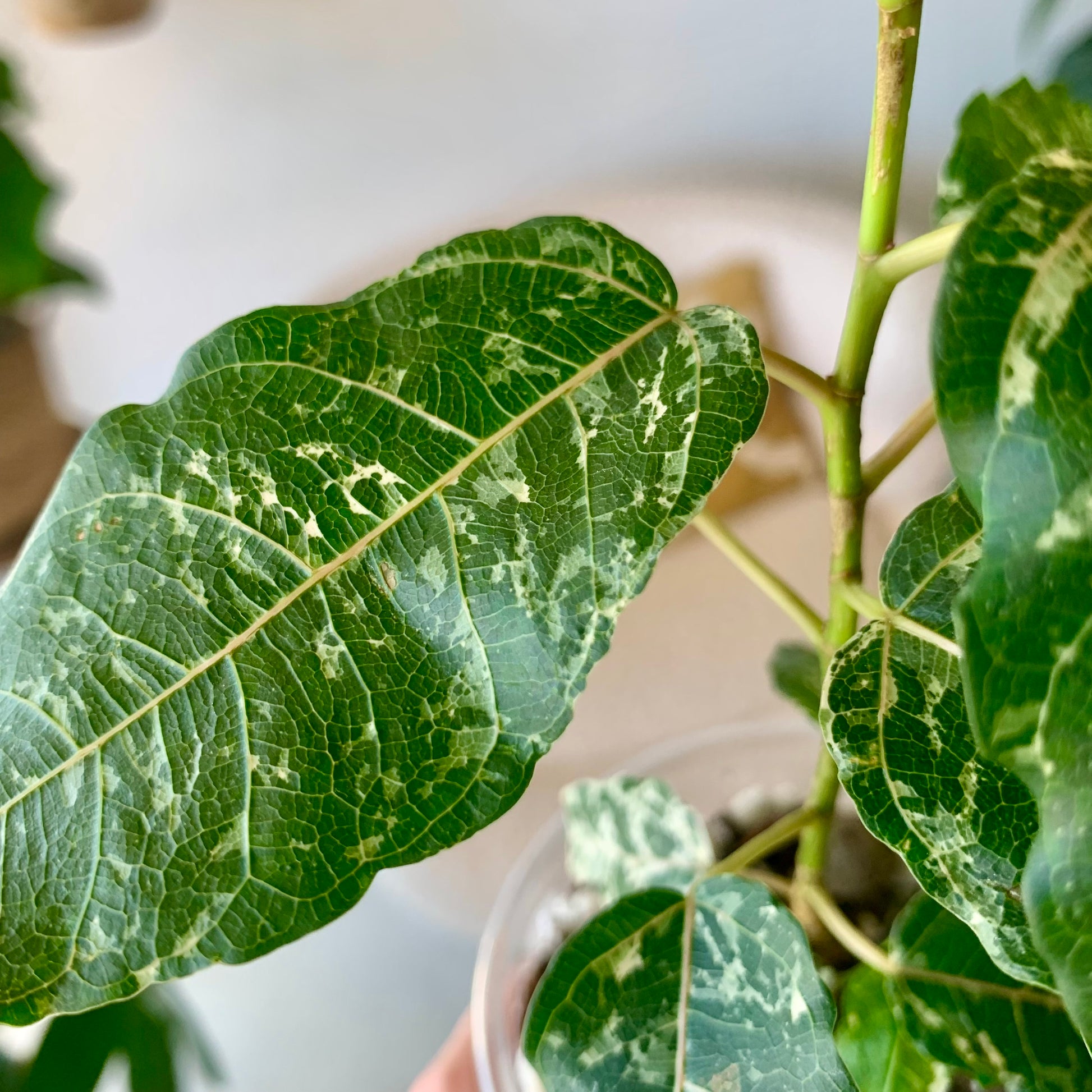 Ficus aspera, also known as the mosaic fig or clown fig, is a unique variegated ficus that is native to Vanuatu in the South Pacific. It boasts broad green leaves with striking white splashes and bears non-edible fruit in the summer, ranging in colors from cream and green to pink
