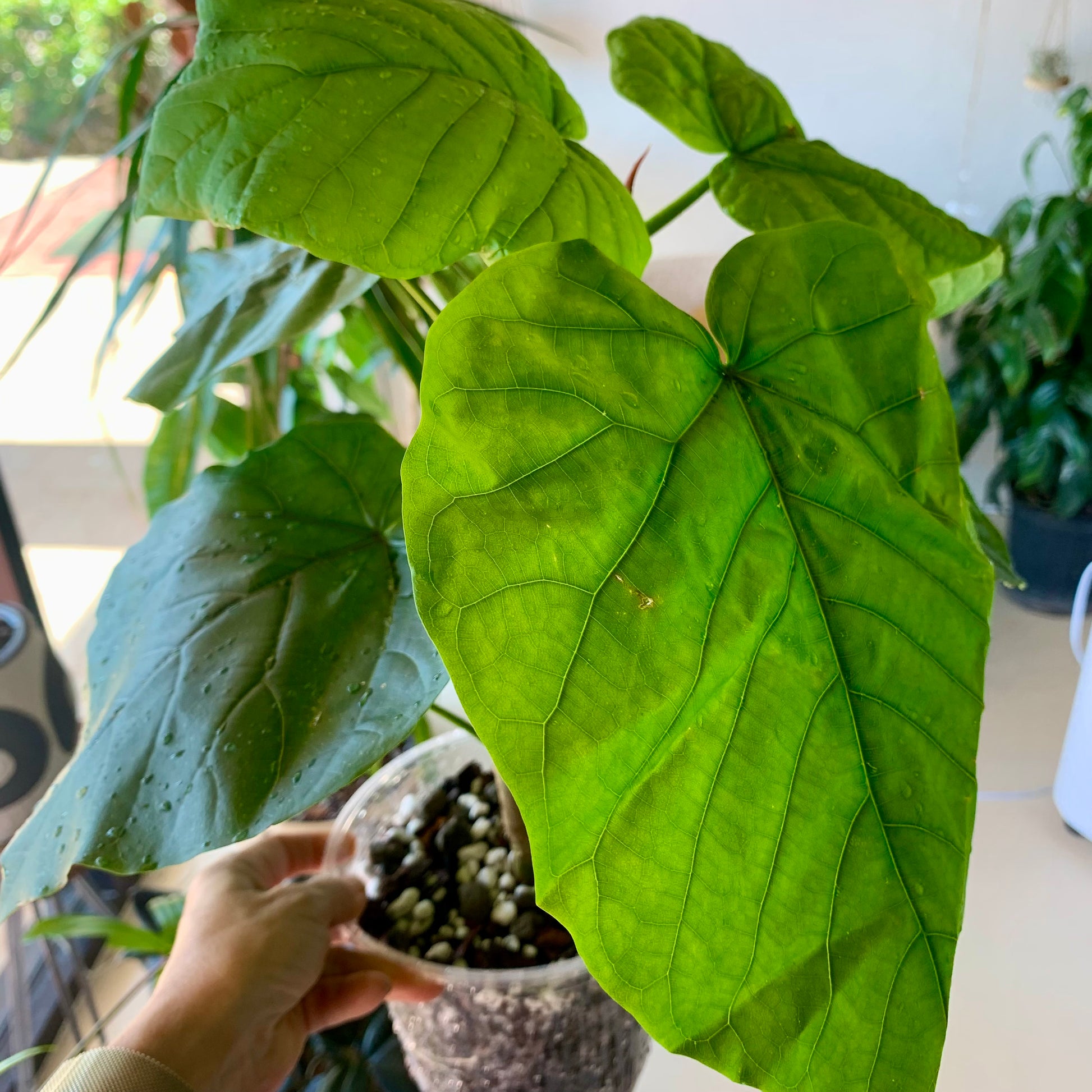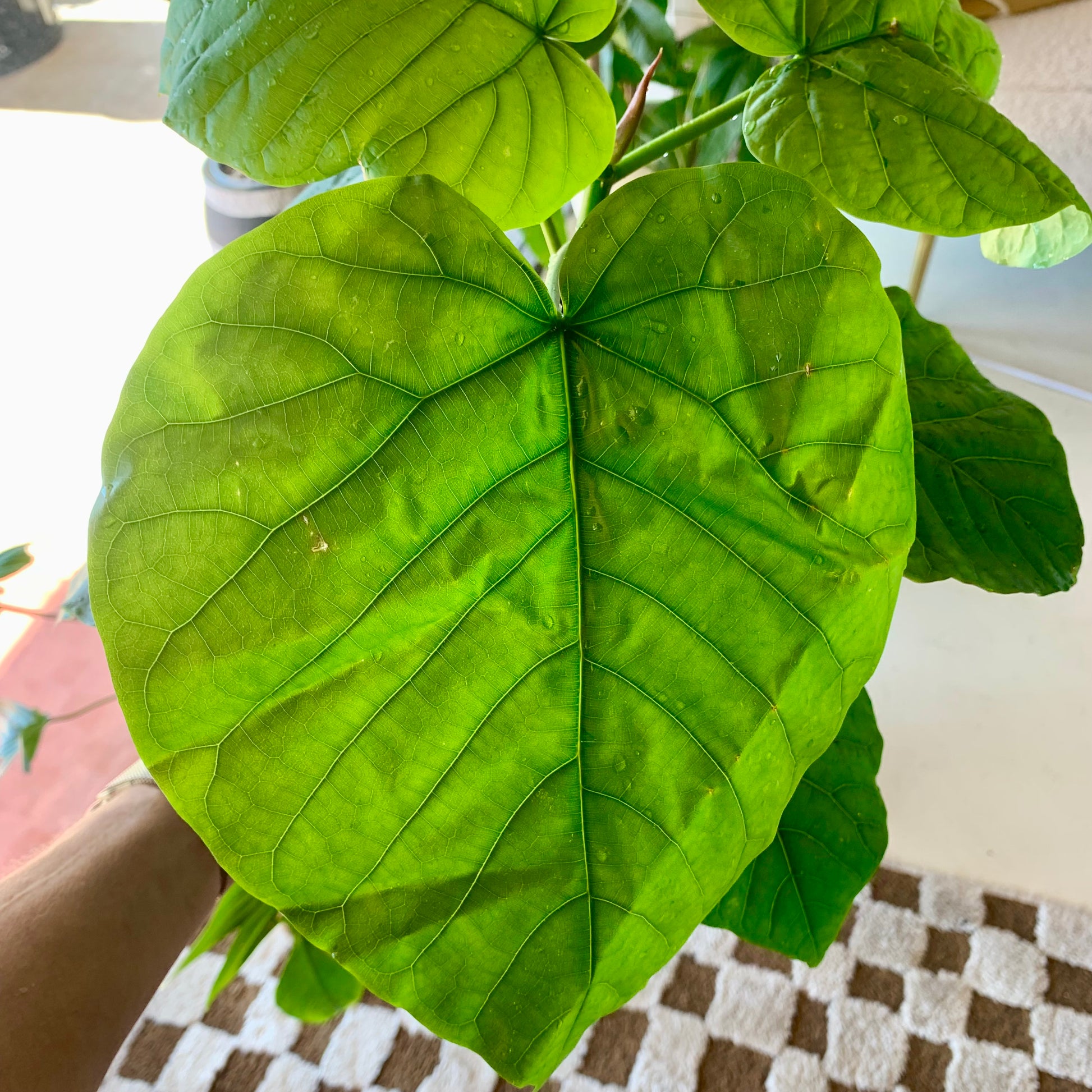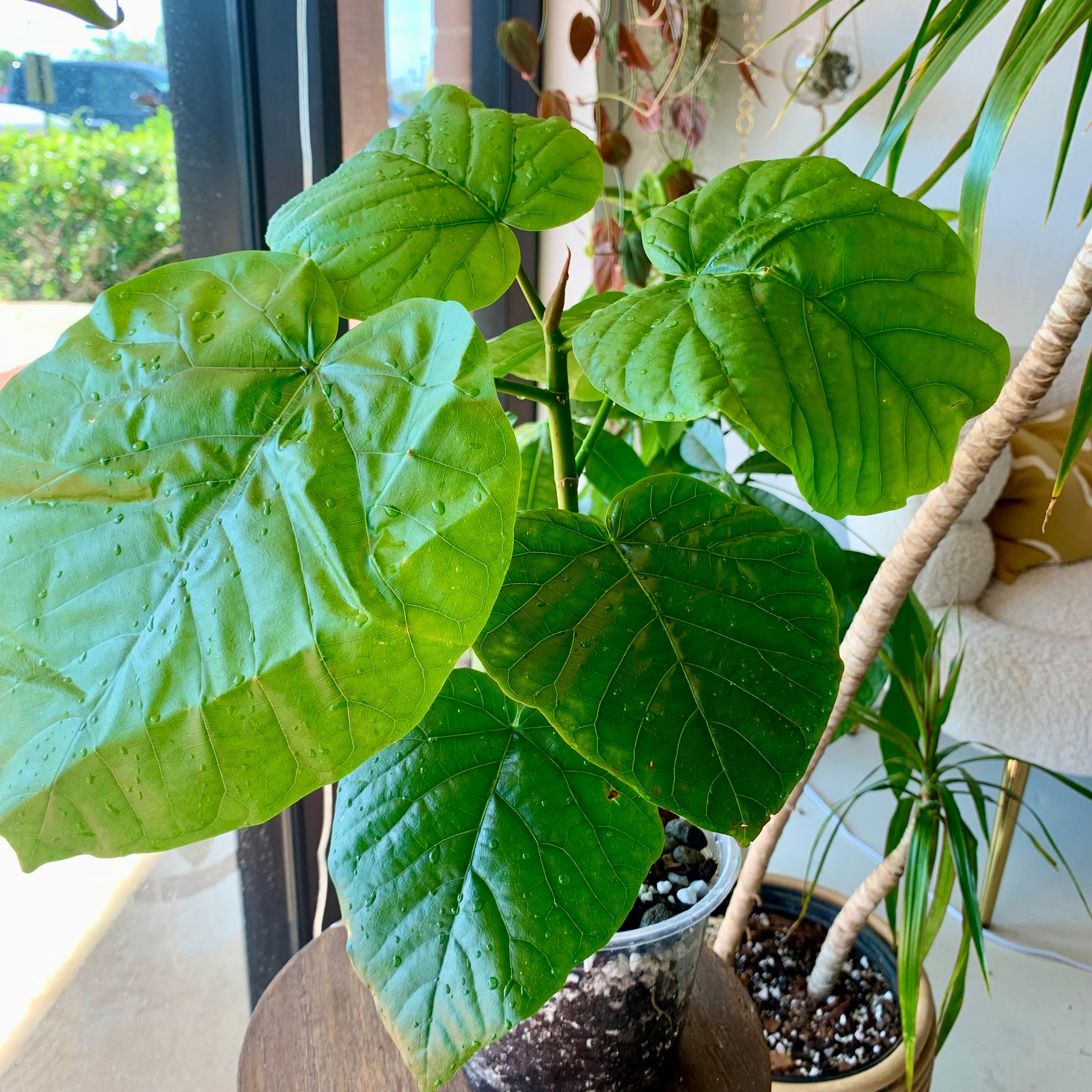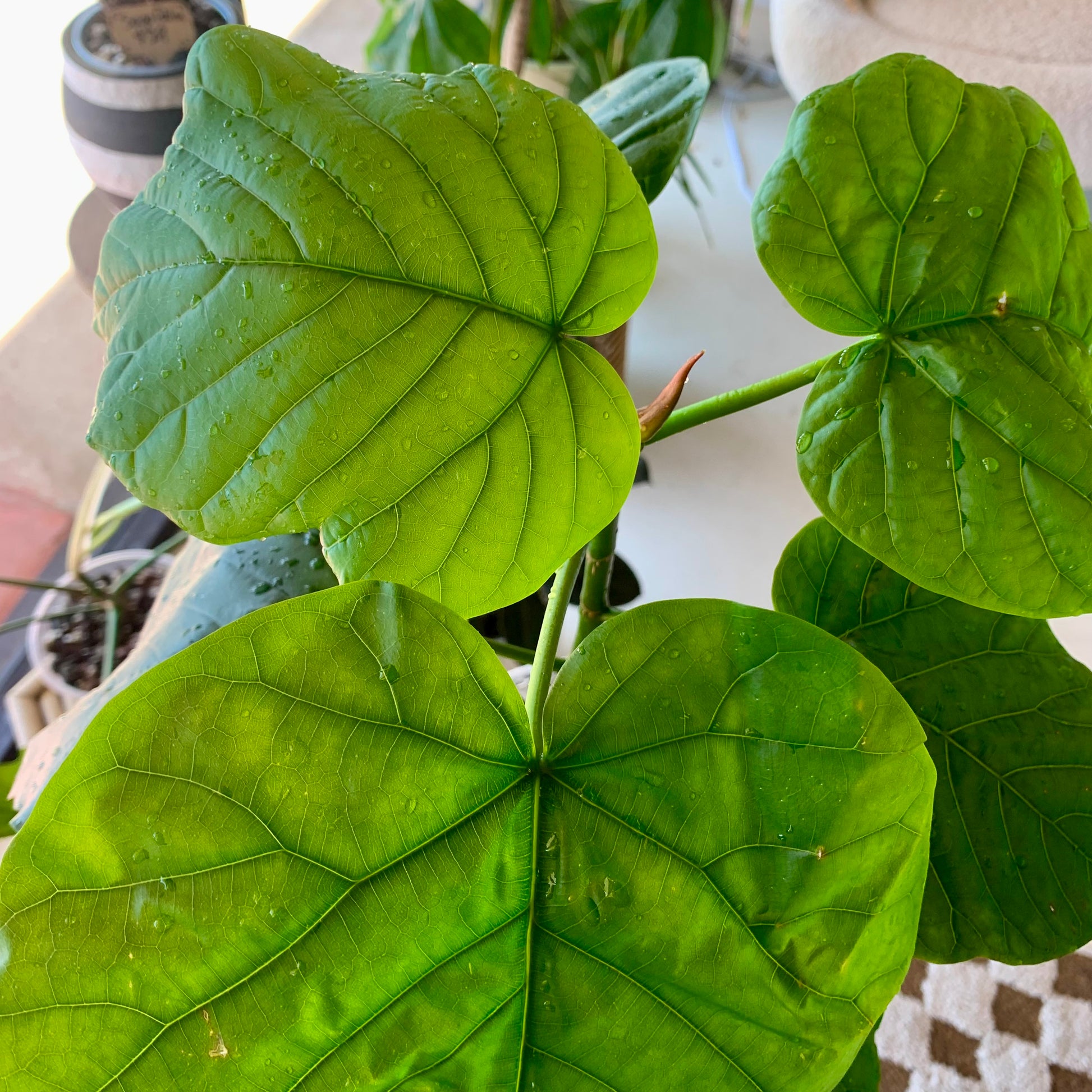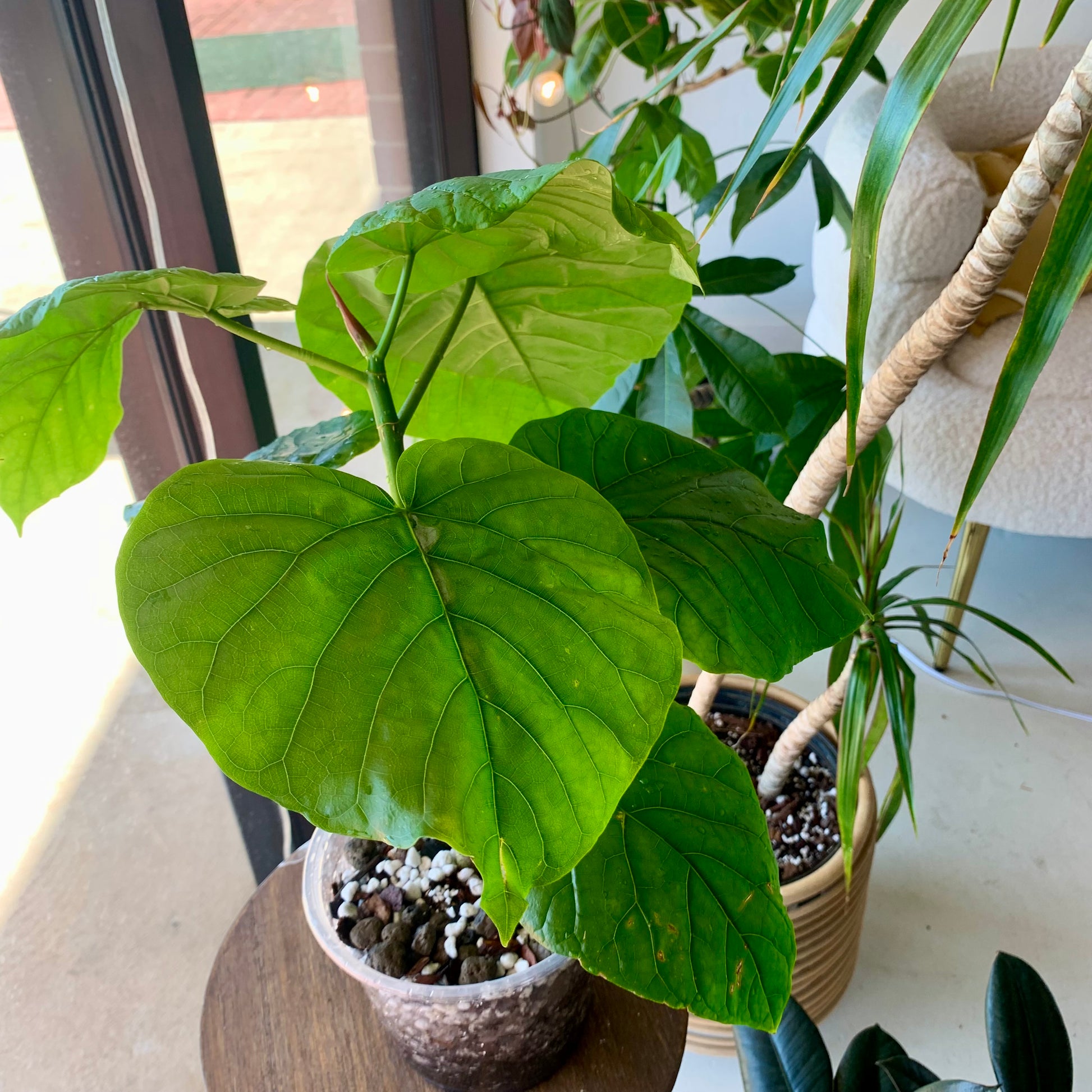 Ficus Umbellata shares similarities with its relative, the fiddle leaf fig, in its large, waxy leaves and thin trunk. However, its heart-shaped leaves have a slighter thinner texture, and its petioles are delicate and elongated.
