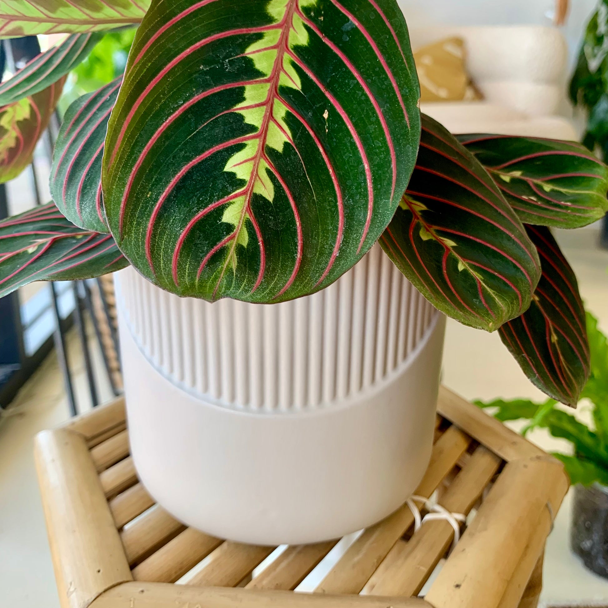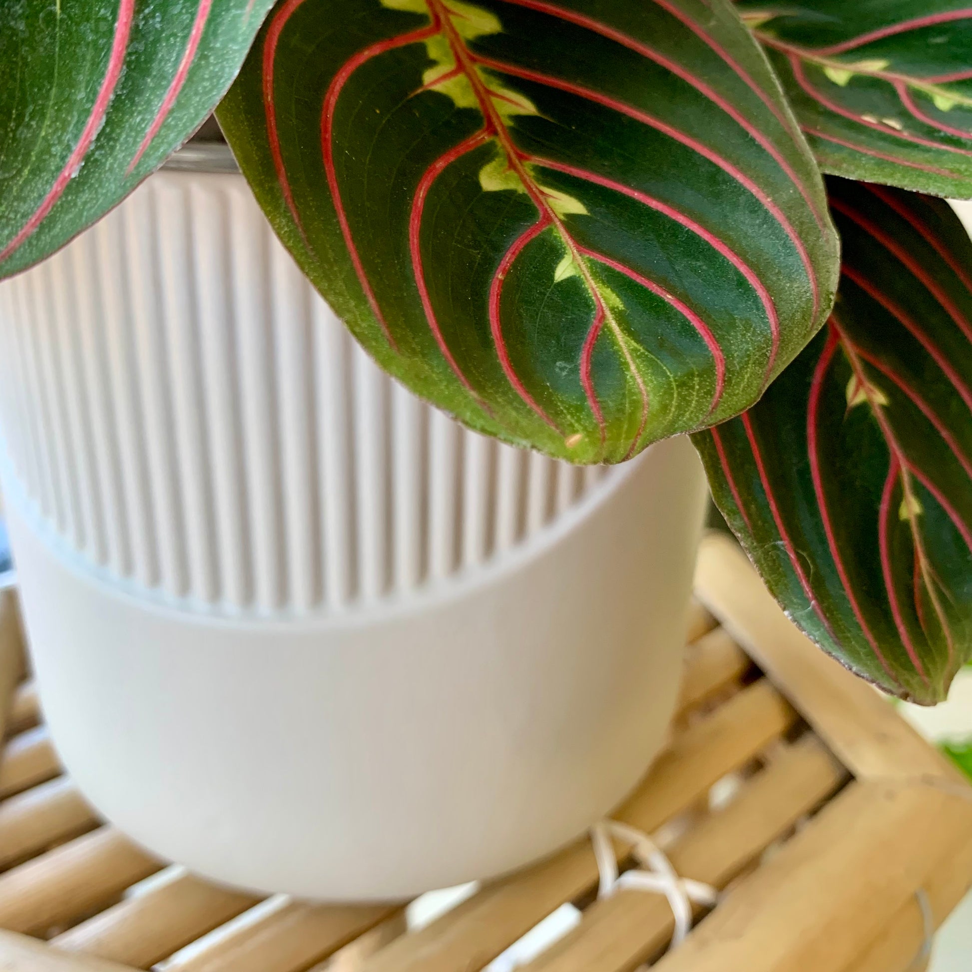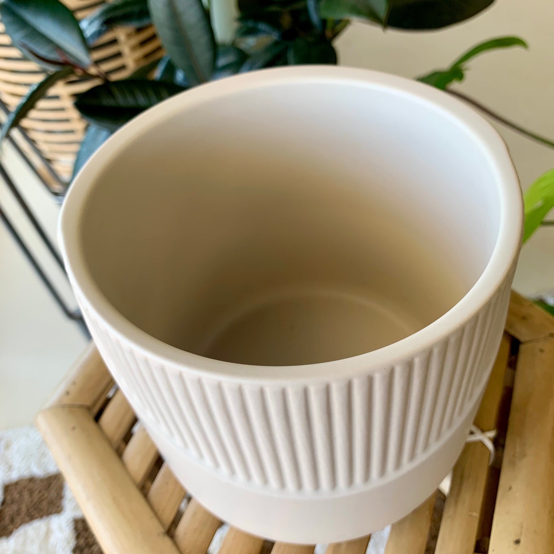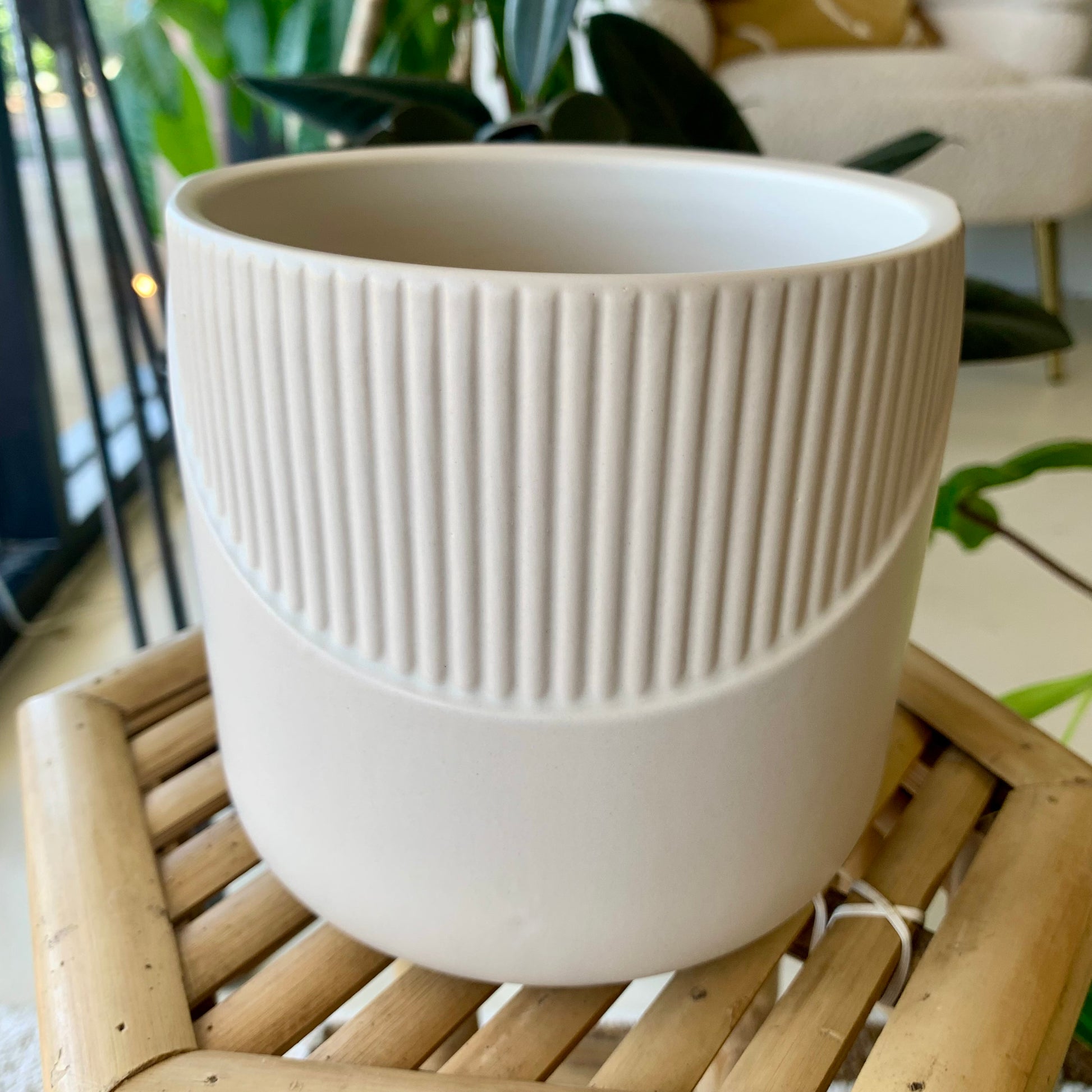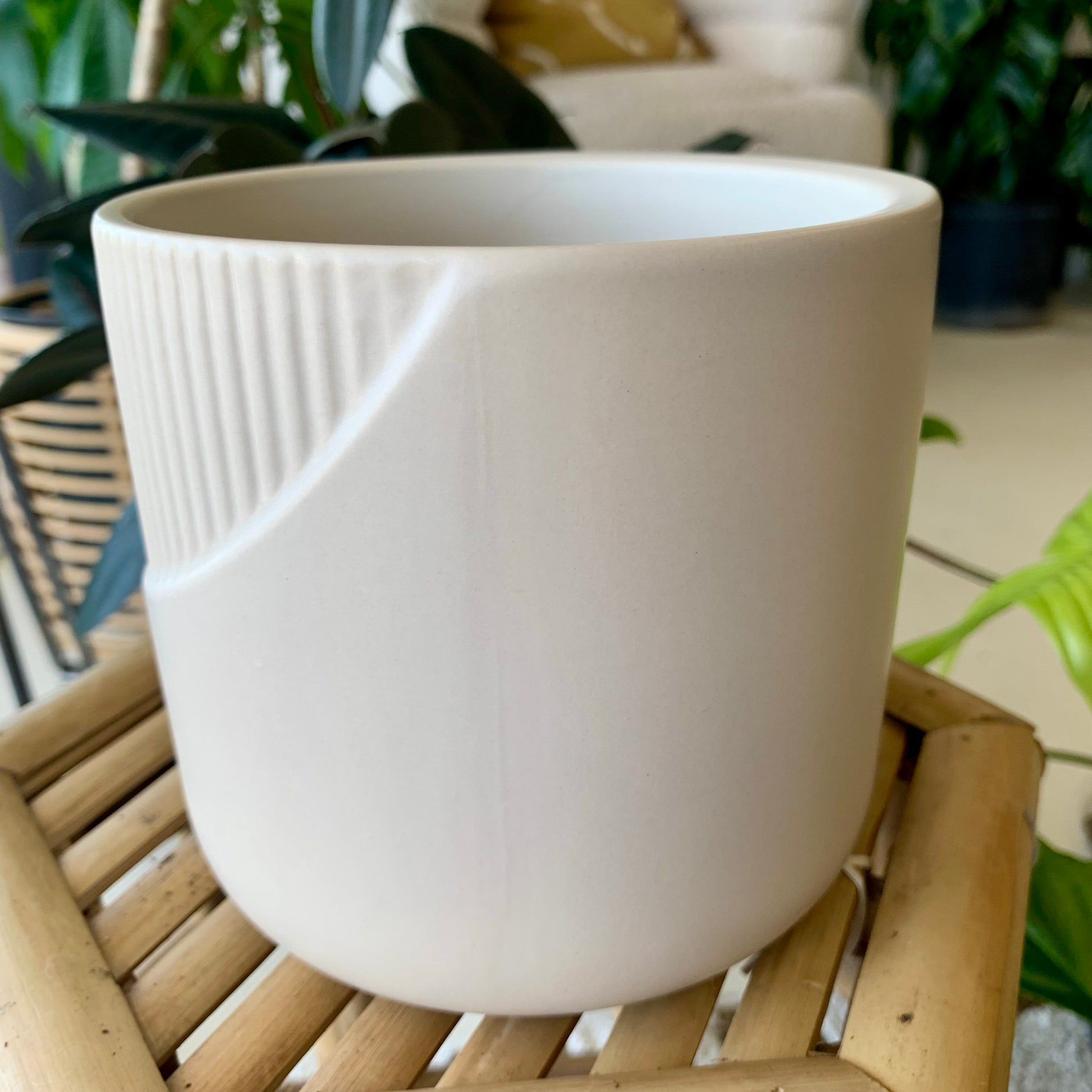 The Halen Pot’s simple lines showcase its cut-out pattern, called out by a clean off-white glaze. A statement-making pot, perfect for a console table or bookcase.