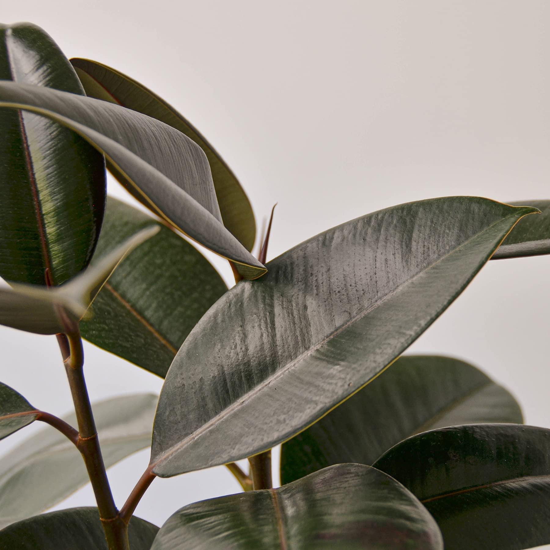 Botanical Name: Ficus elastica Common Name(s): Rubber Plant, Rubber Tree, Rubber Fig Description: Native to India and Southeast Asia, the Ficus elastica 'Burgundy' is perfect for those looking for a small indoor tree with thick, leathery, glossy, dark green leaves and pink to purplish stipules. In the wild, it grows up to around 200ft tall, and its roots are used in India to form living bridges. It won't do well in low light spaces, so place in bright indirect light. Water to keep soil moist at all times. Ficus elastica is a source of latex that is toxic to the skin, and poisonous if taken internally, so pet-owners and those allergic to latex should be cautious.