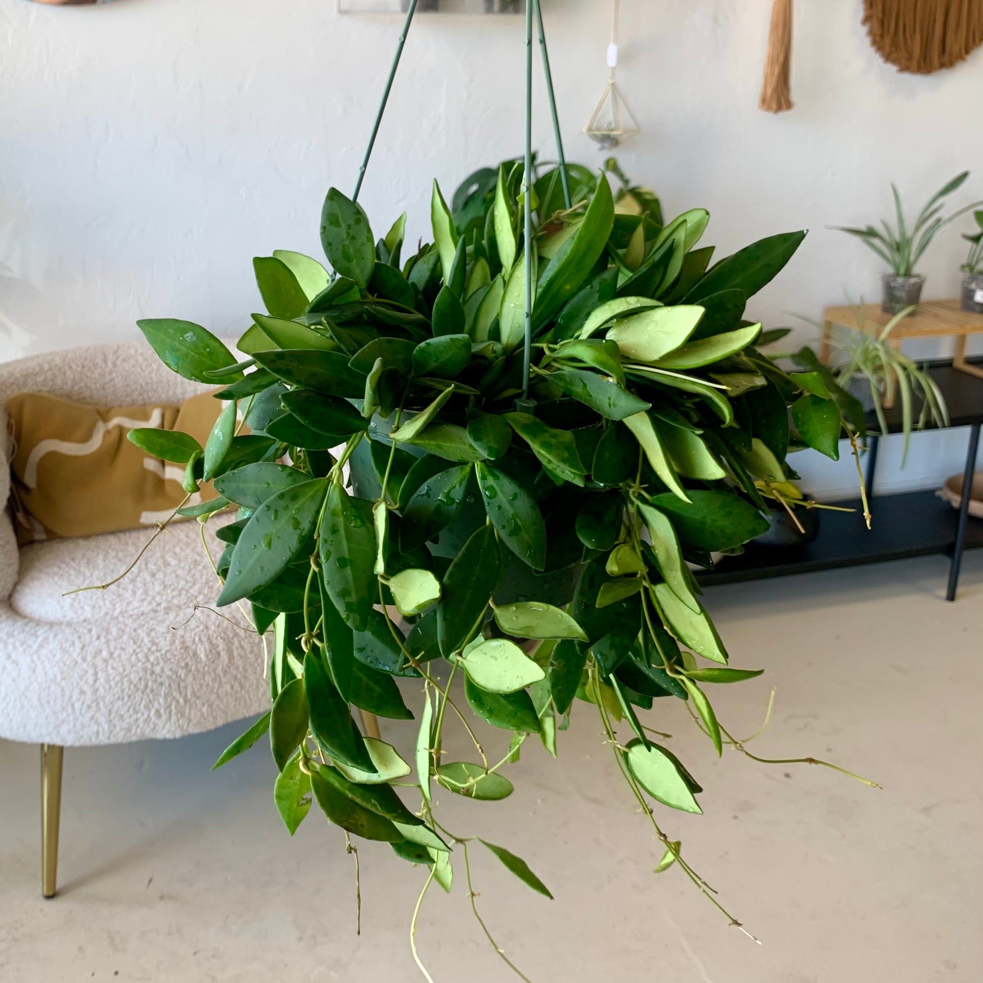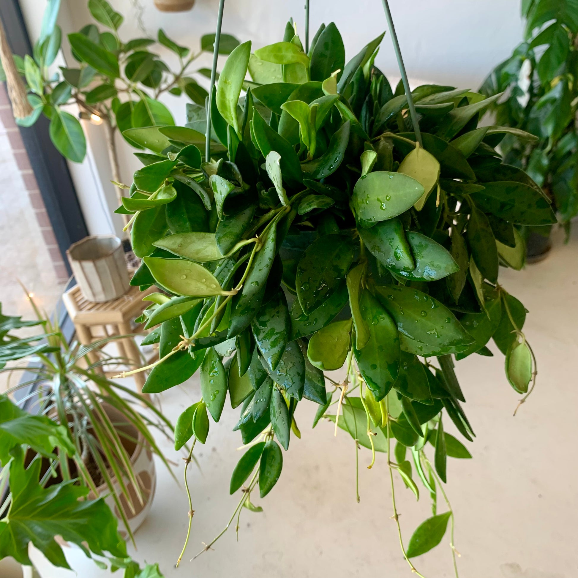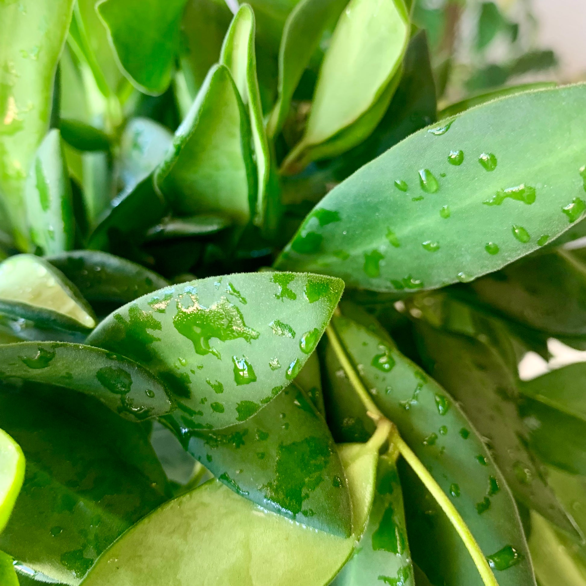 The Hoya Burtoniae is a long trailing plant with small leaves that have a slightly velvet-like texture. Hoyas need bright, indirect light, humidity and a light touch when it comes to watering. Select a place that gets bright, indirect light. Don’t let their waxy foliage fool you. They are not succulent and can’t take harsh afternoon light. They will grow in lower light situations but it’s unlikely they will bloom.