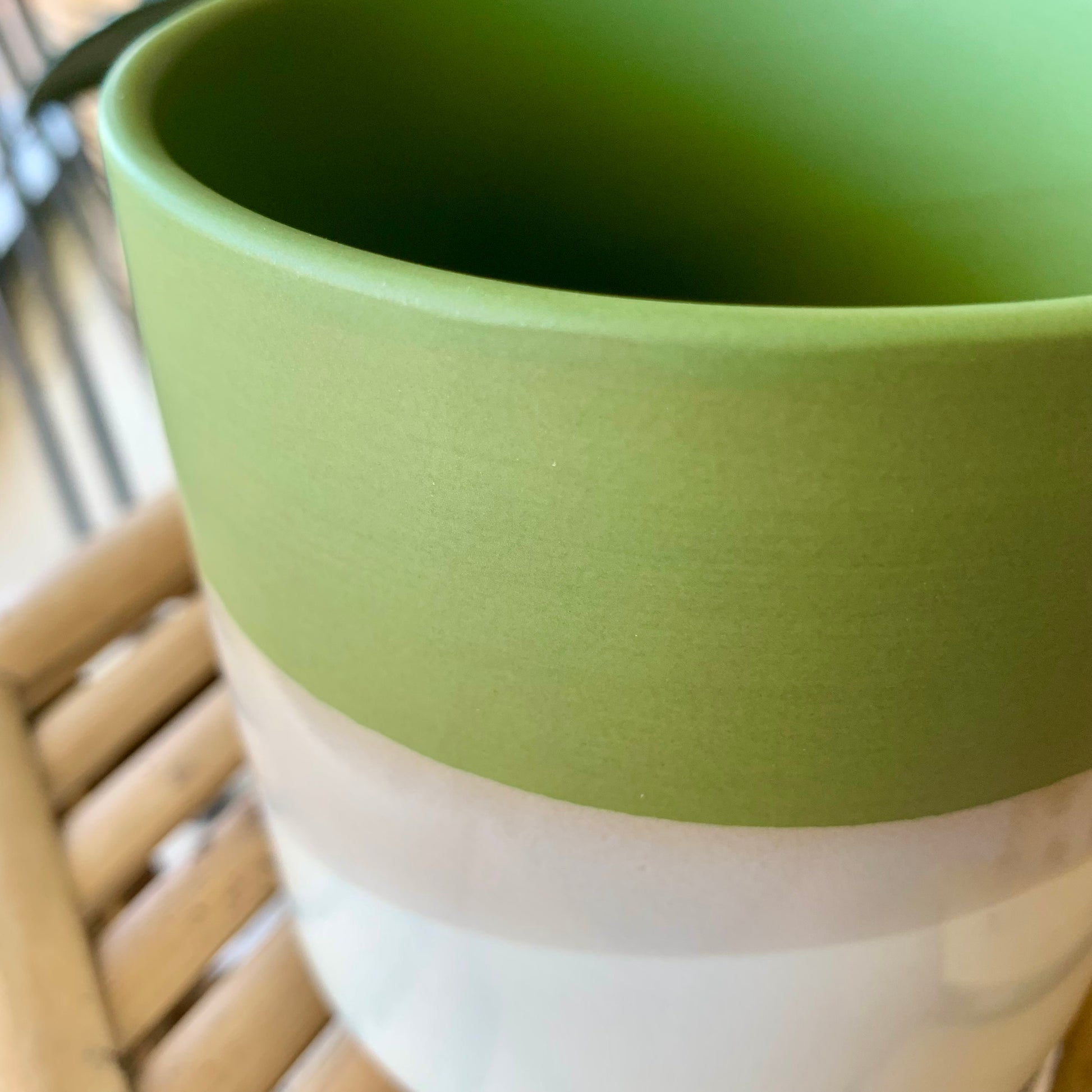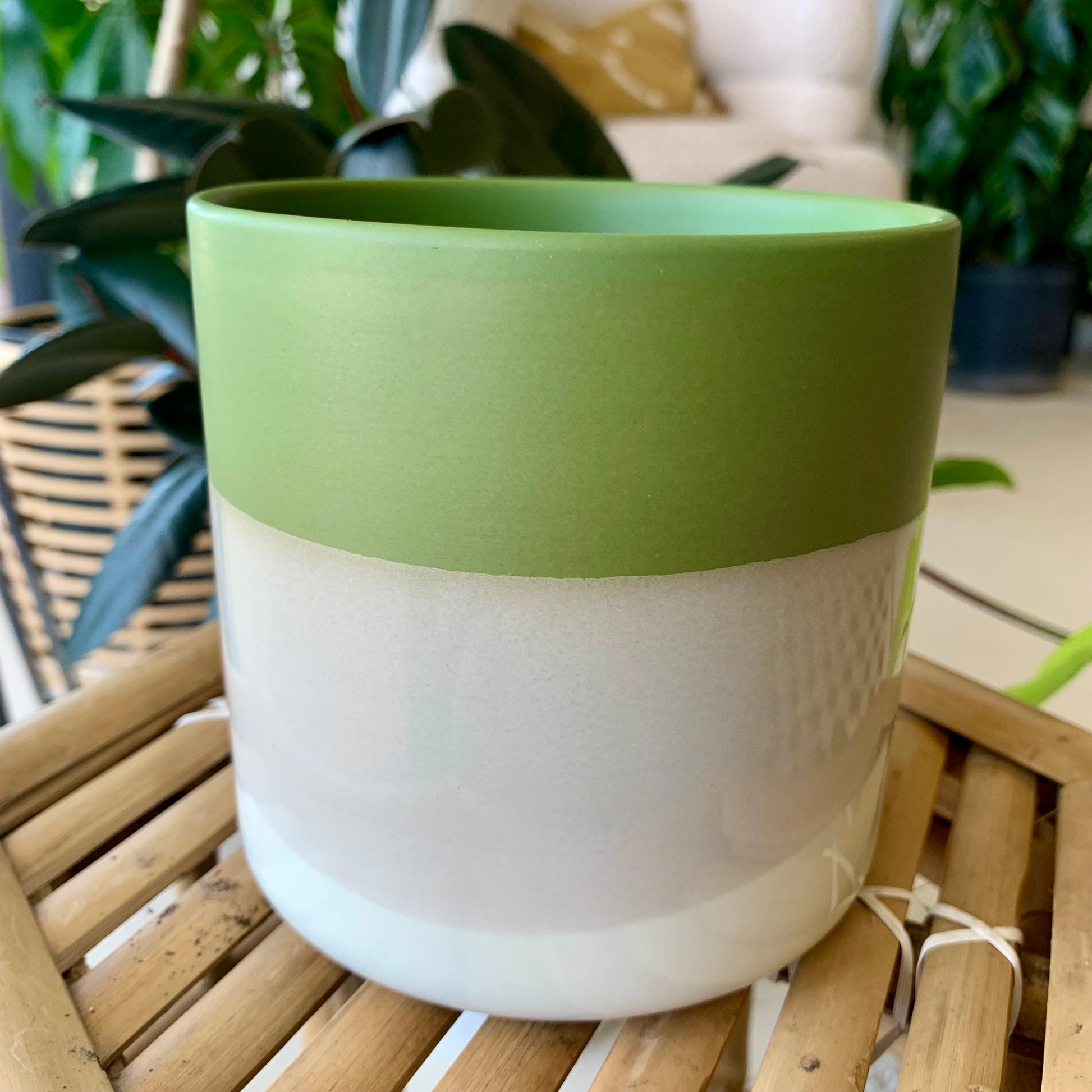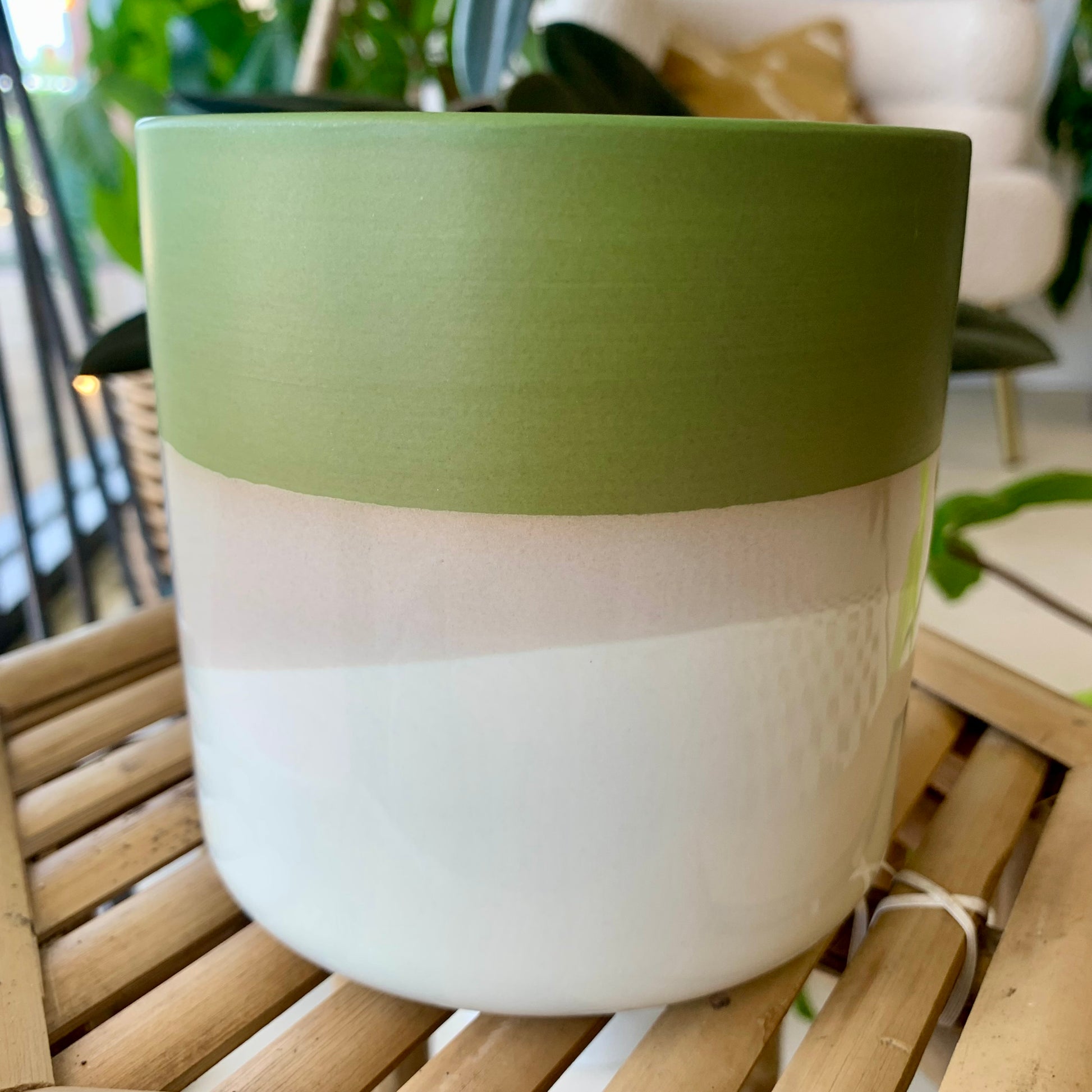 The color story of the ceramic Lauris Pot is as beautiful to behold as the plants that will fill it. The smooth matte finish of green, gray & white color blocking creates a rich, earthy look. Plant a succulent, or pop in a bouquet to enhance the green.