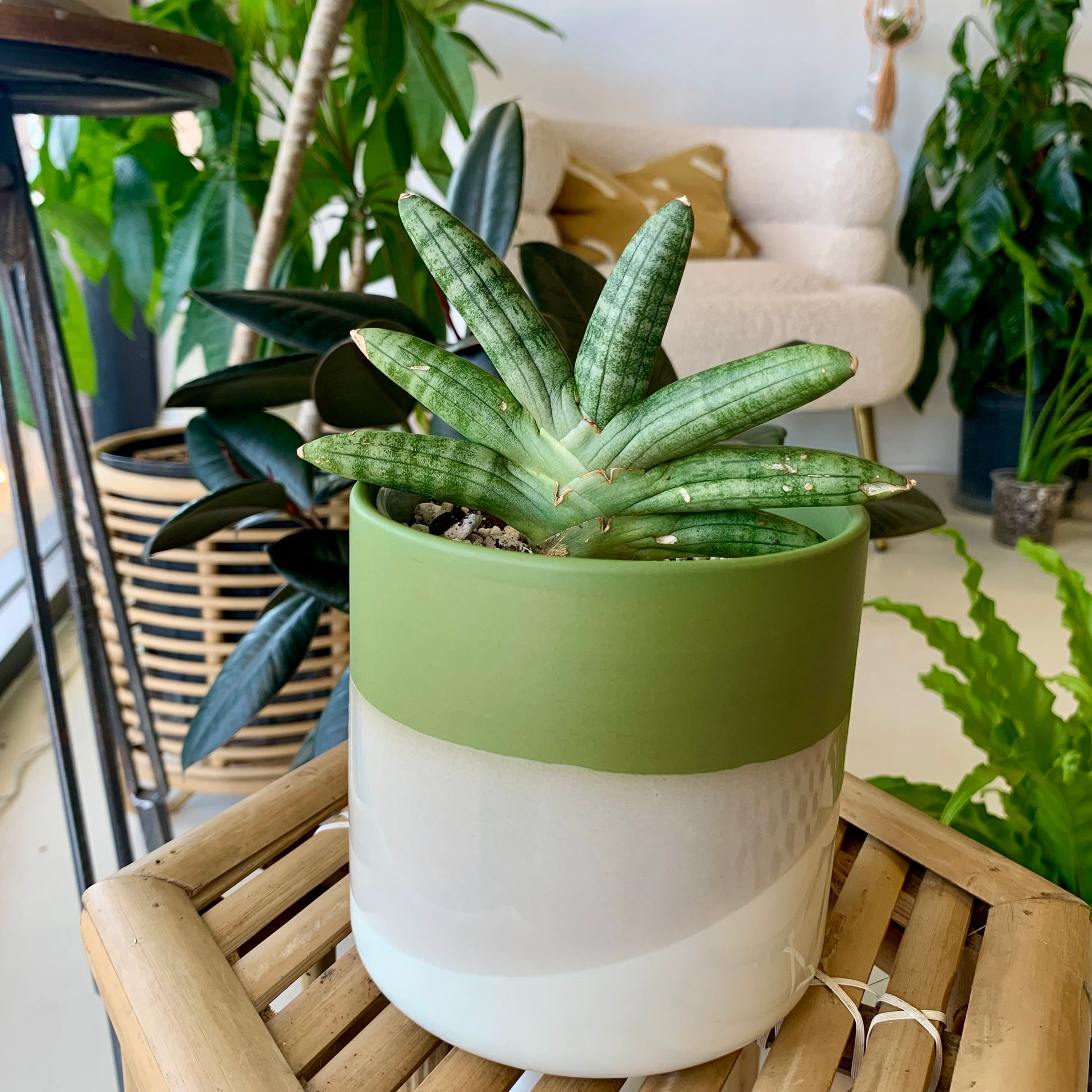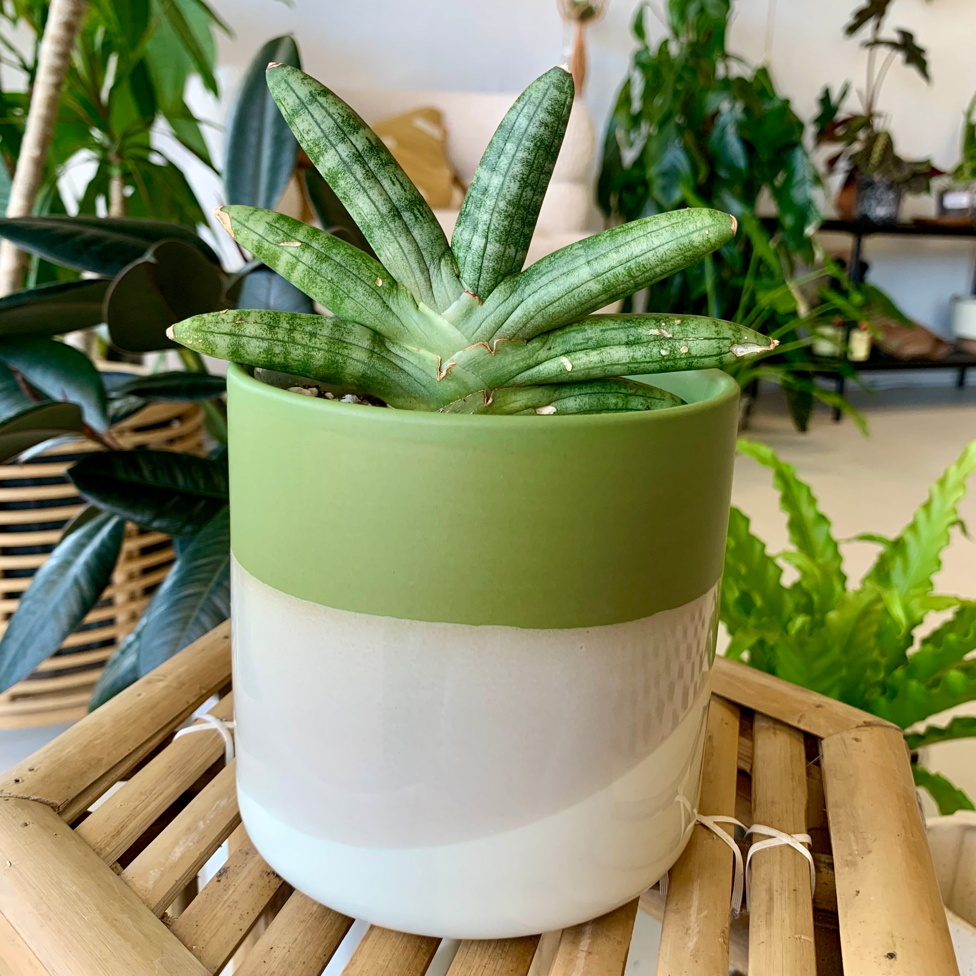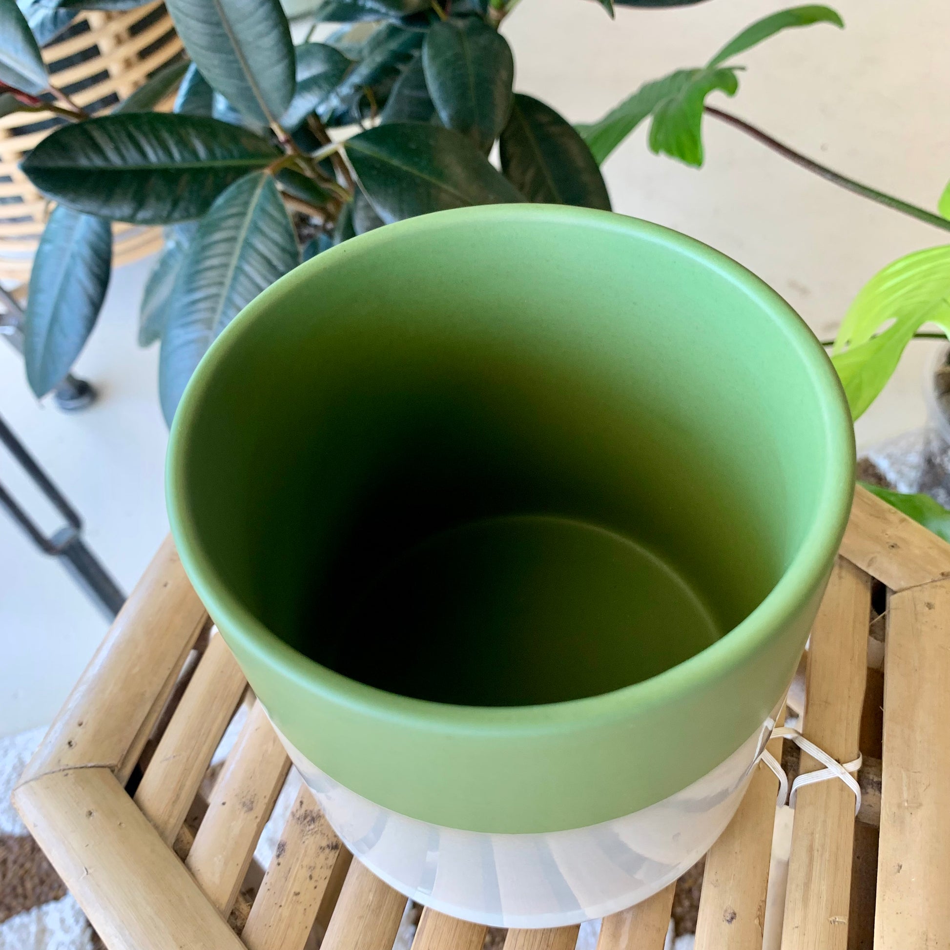 The color story of the ceramic Lauris Pot is as beautiful to behold as the plants that will fill it. The smooth matte finish of green, gray & white color blocking creates a rich, earthy look. Plant a succulent, or pop in a bouquet to enhance the green.