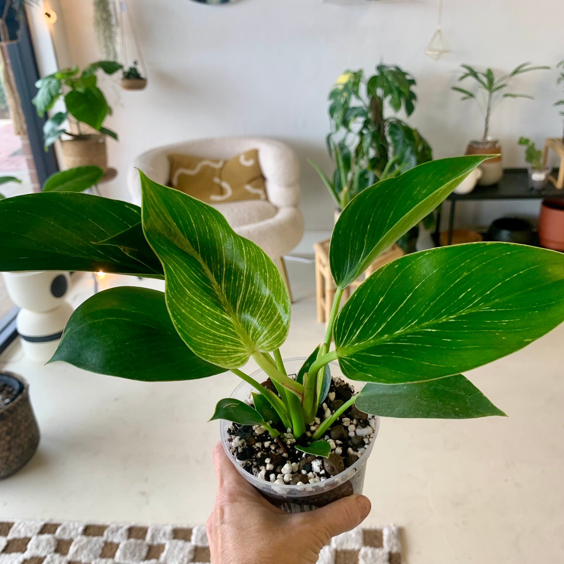 Hundreds of philodendron species exist, and these houseplants have won the hearts of many for their steadfastness and striking, glossy-green foliage. Setting this rare mutation of the Philodendron 'Rojo Congo' hybrid apart is the one-of-a-kind creamy white or yellow streaks on its leaves.