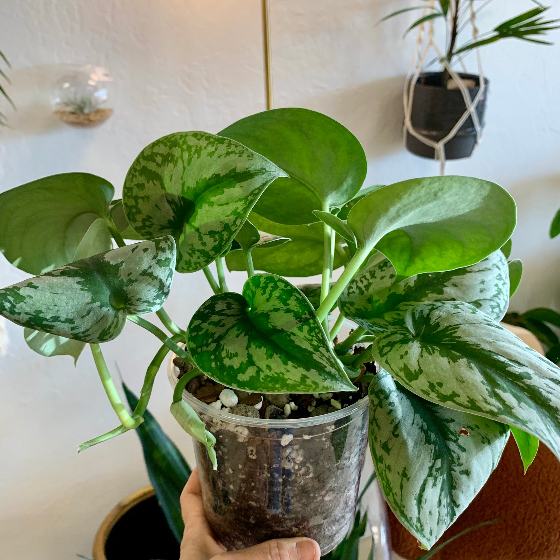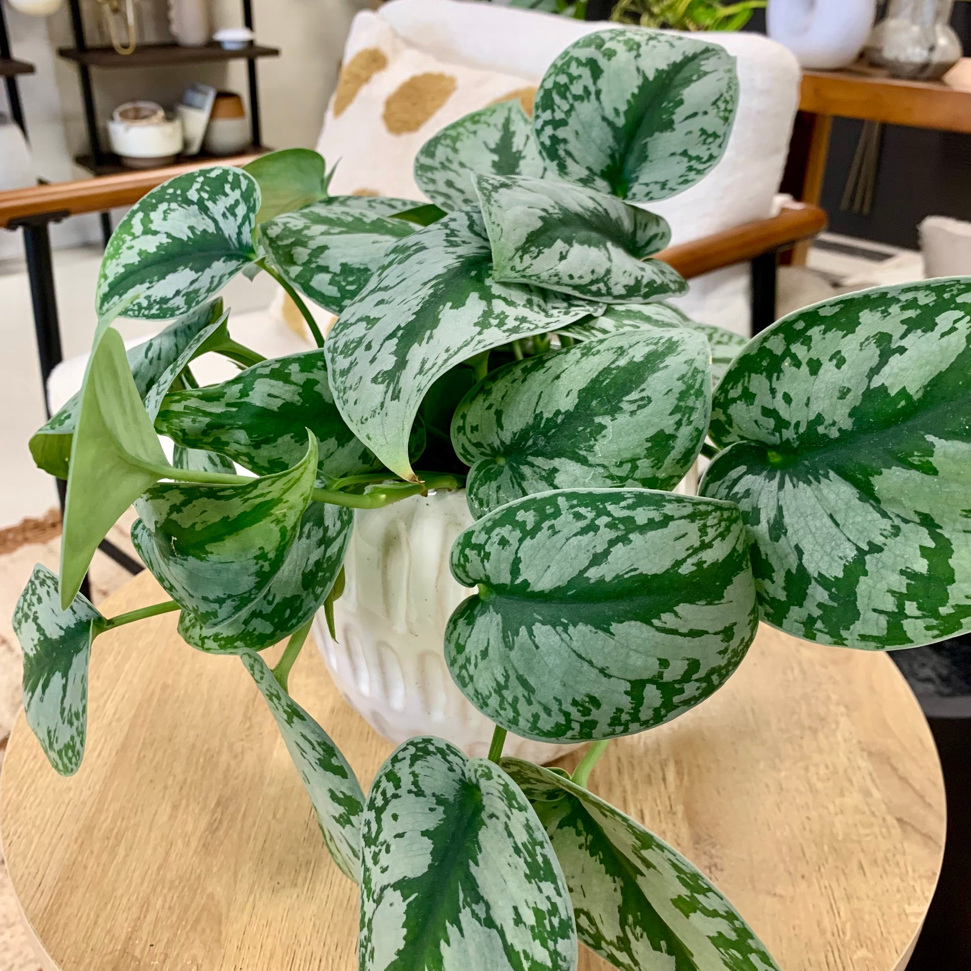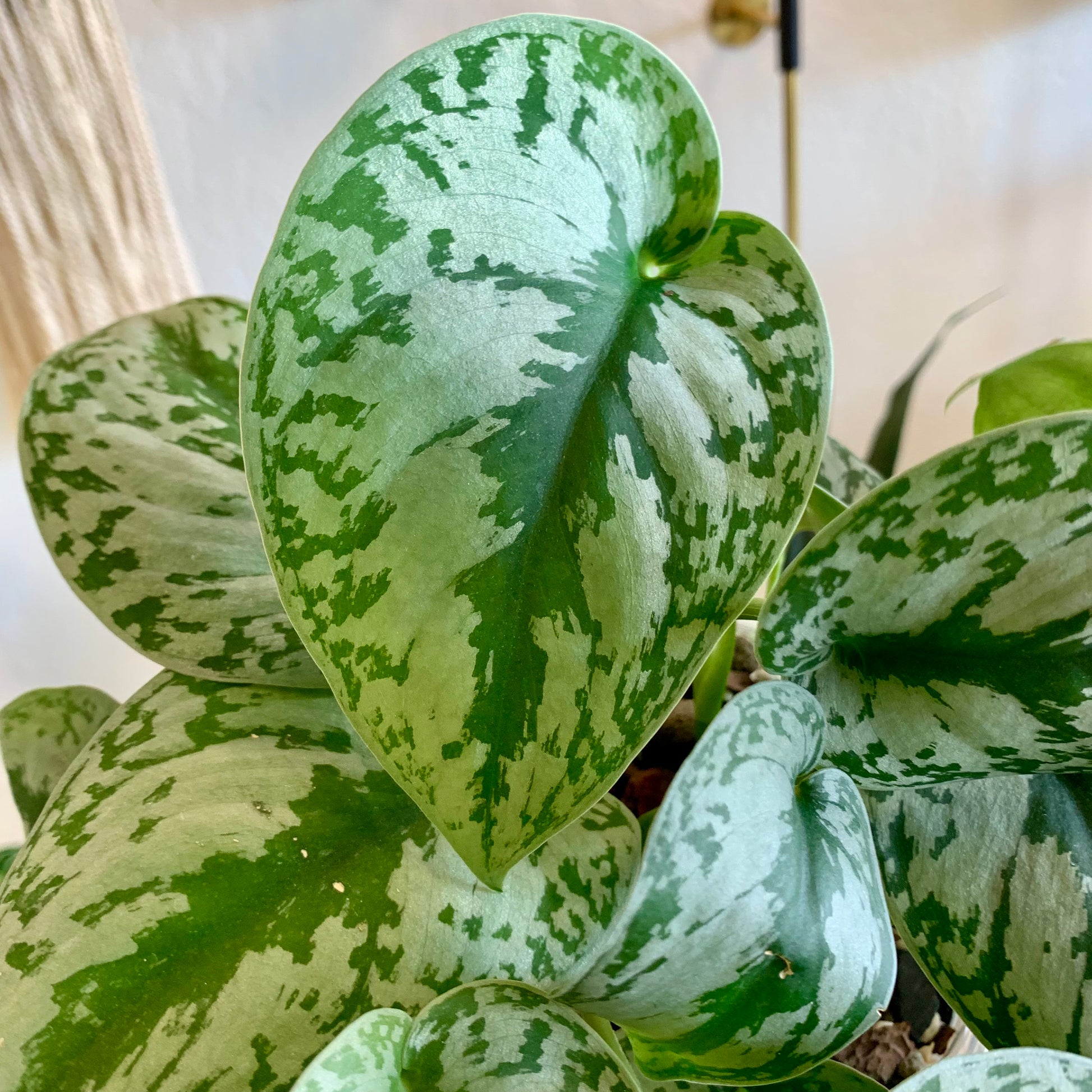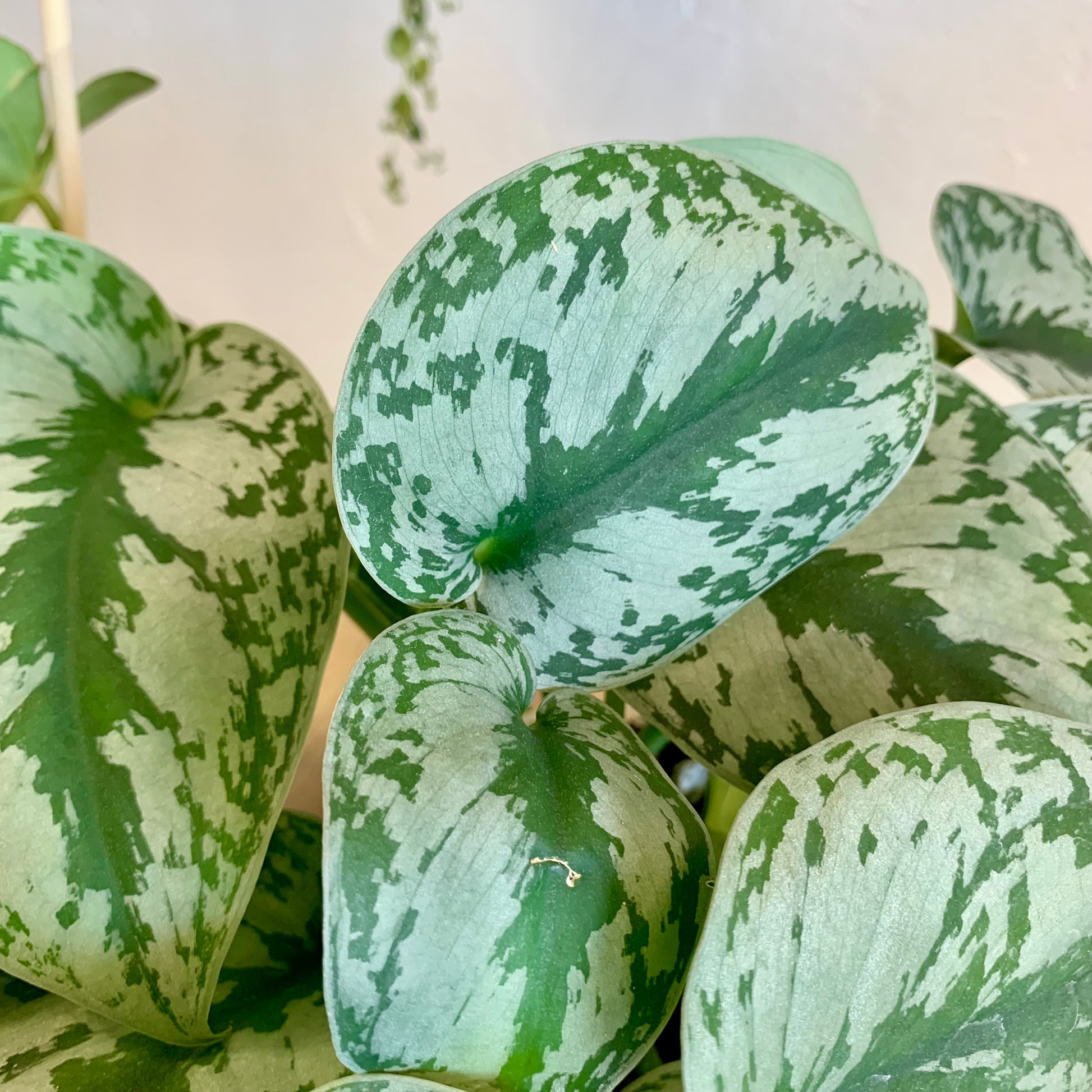 Scindapsus Pictus "Silver Splash" is a trailing and vining plant with leaves that are a beautiful green with silver slashes and a soft velvety feel.