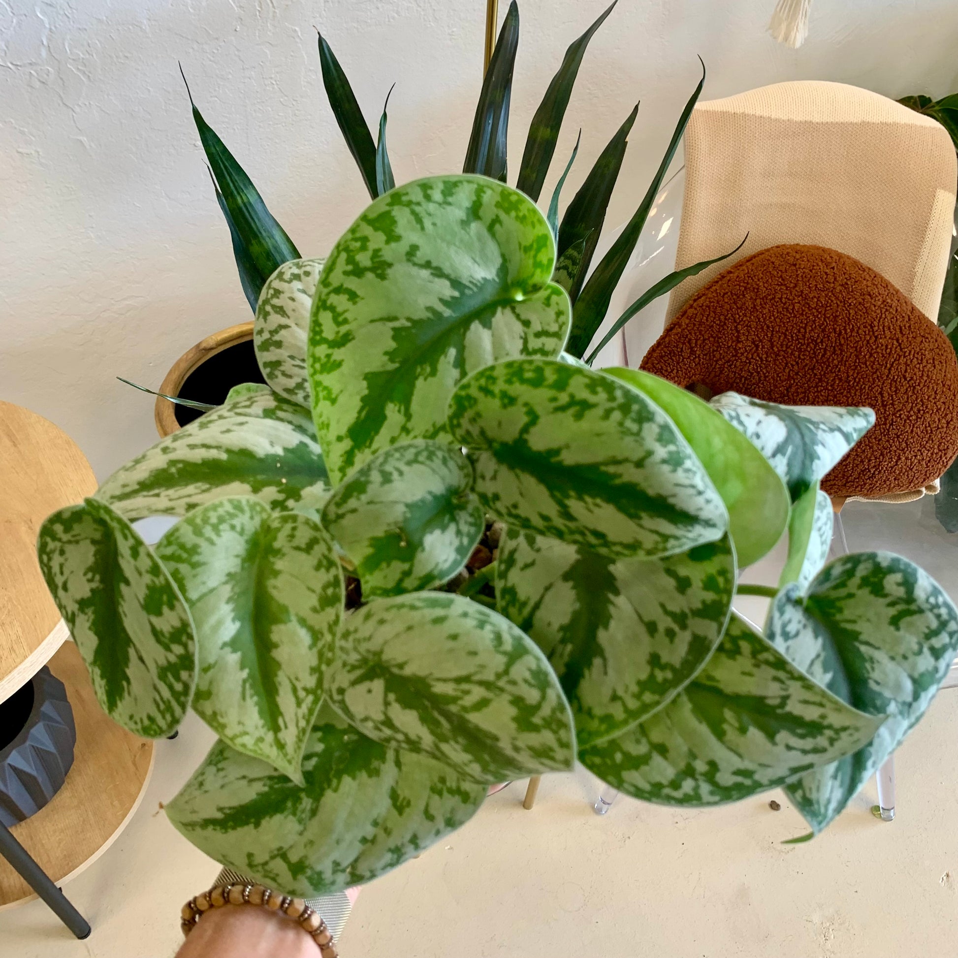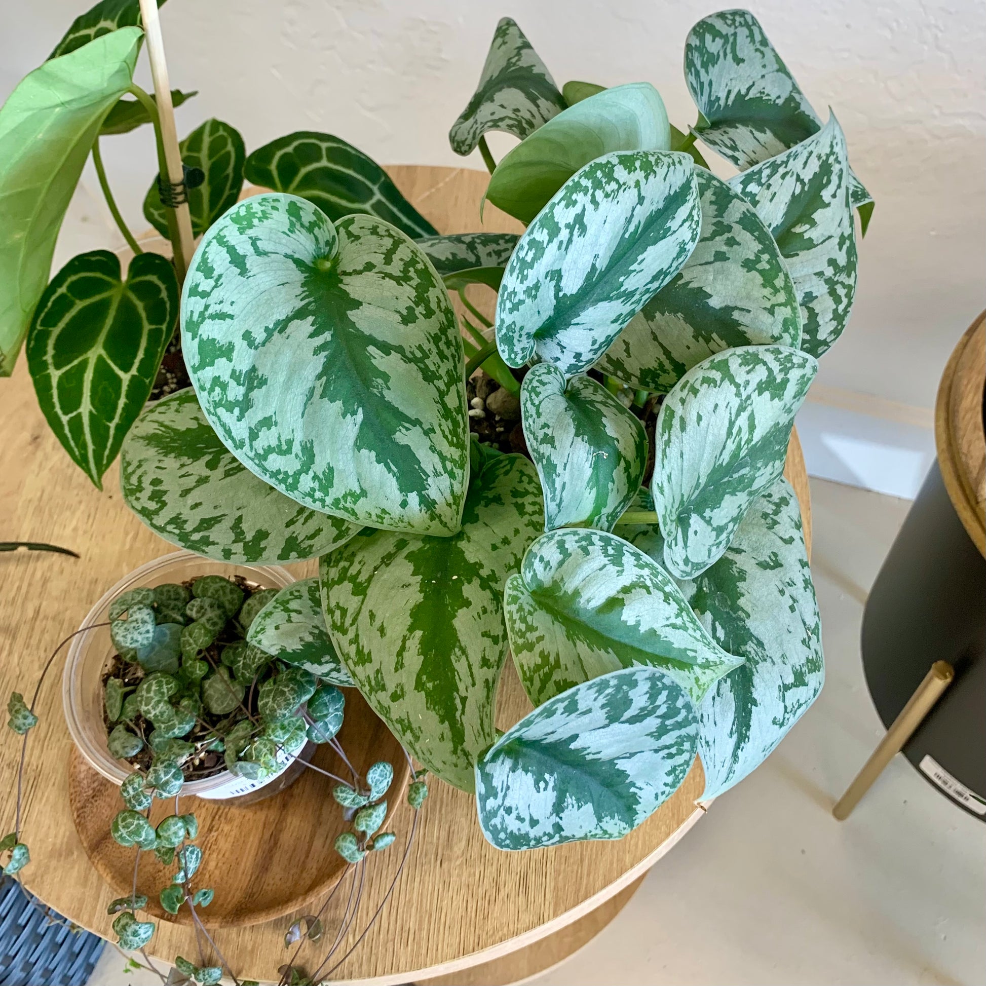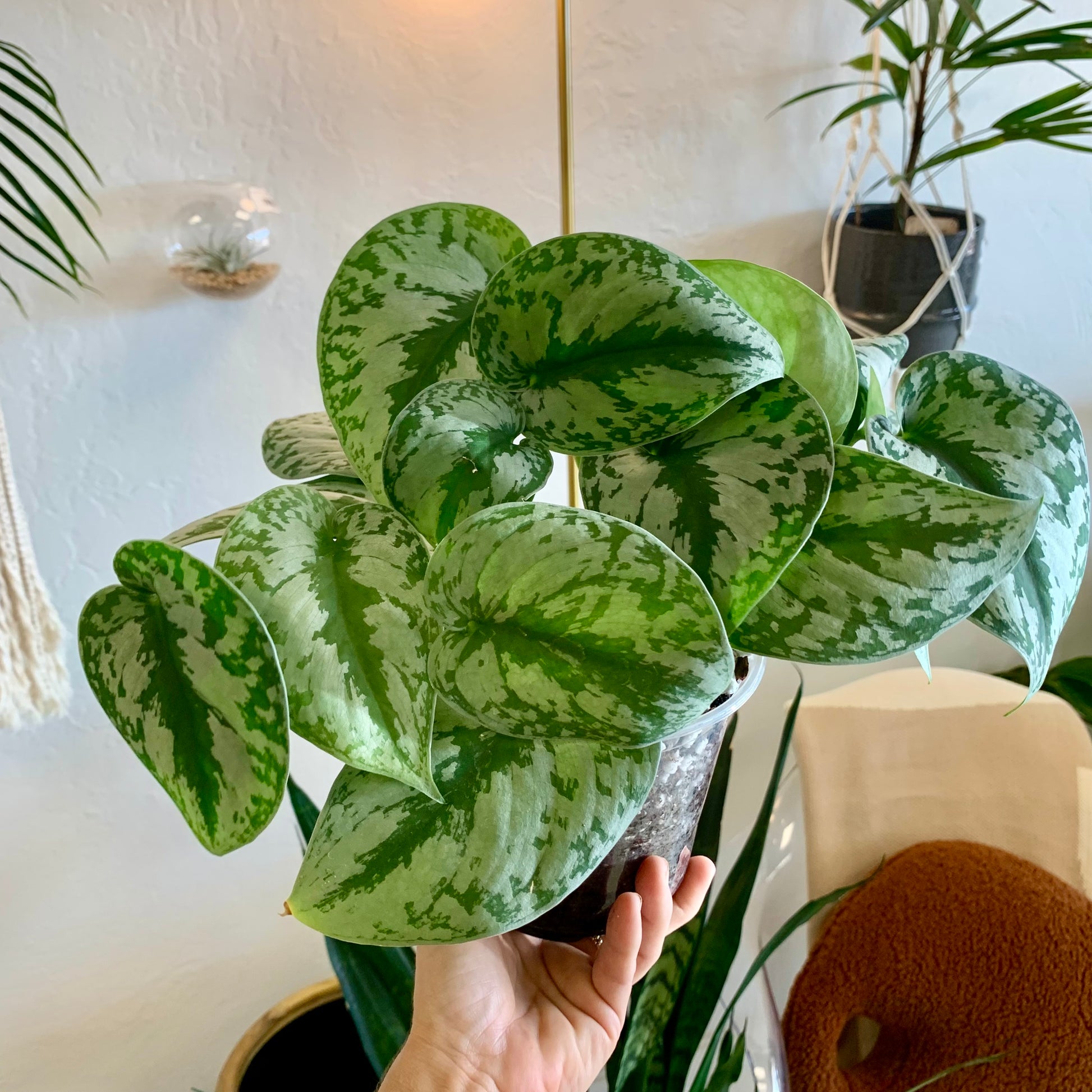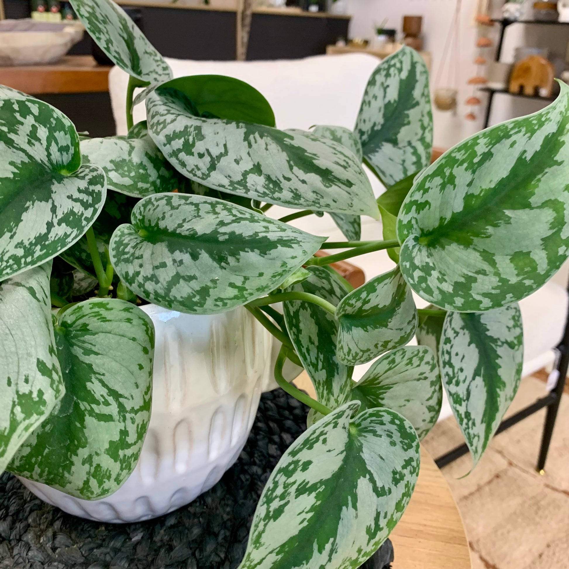 Scindapsus Pictus "Silver Splash" is a trailing and vining plant with leaves that are a beautiful green with silver slashes and a soft velvety feel.