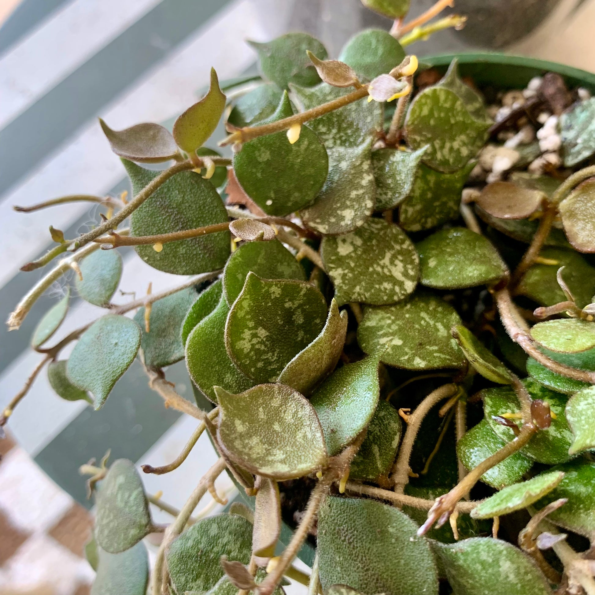 Once you meet the Hoya curtisii, you won't be able to get this vining beauty out of your thoughts. Delicate spade-shaped leaves come to a point and dangle from thick stems. The green leaves are dappled with silver specs for a unique look. This tiny leaf Wax Plant (Hoya) is low-maintenance and does well with a lot of bright indirect light and even some morning direct sun.