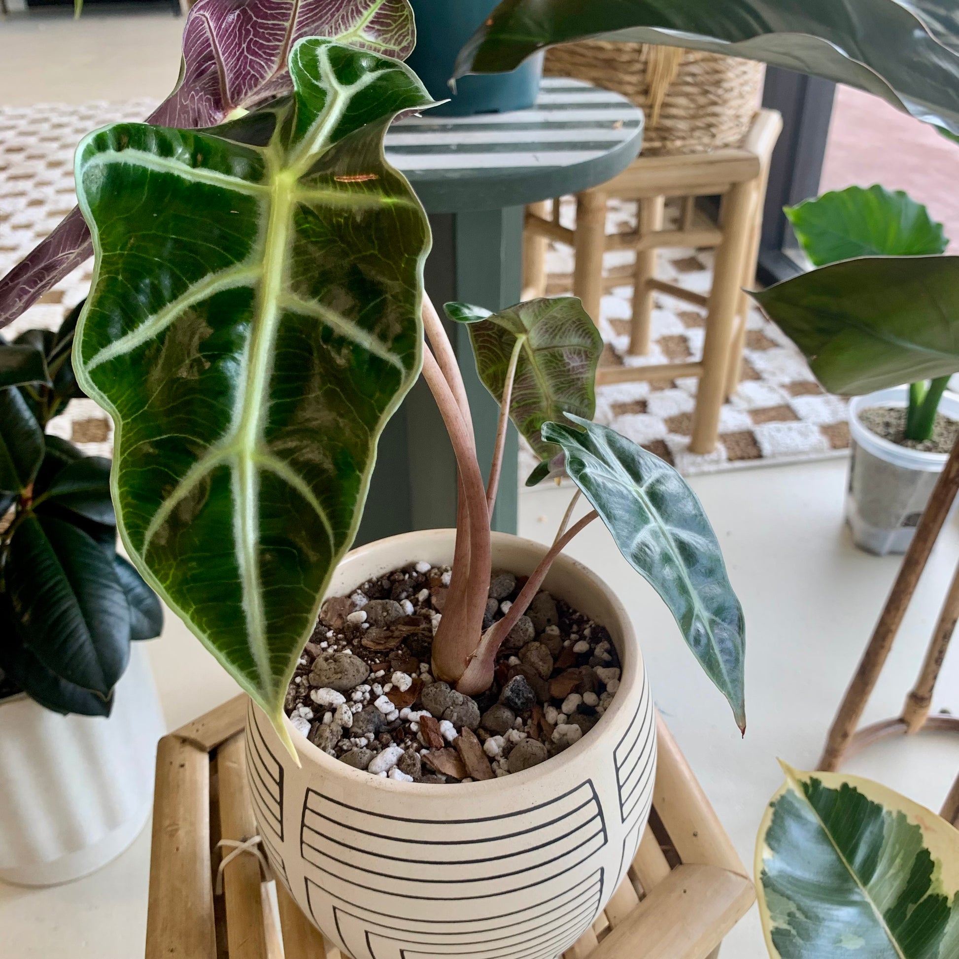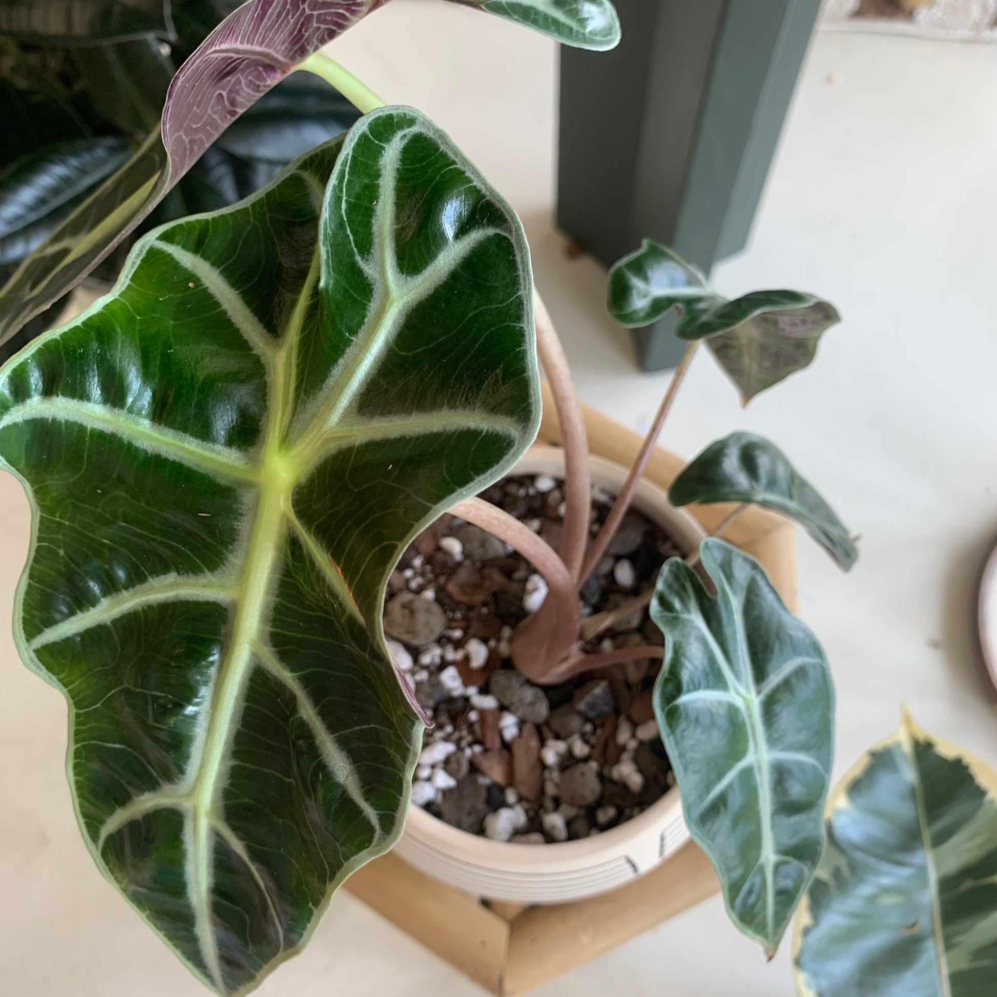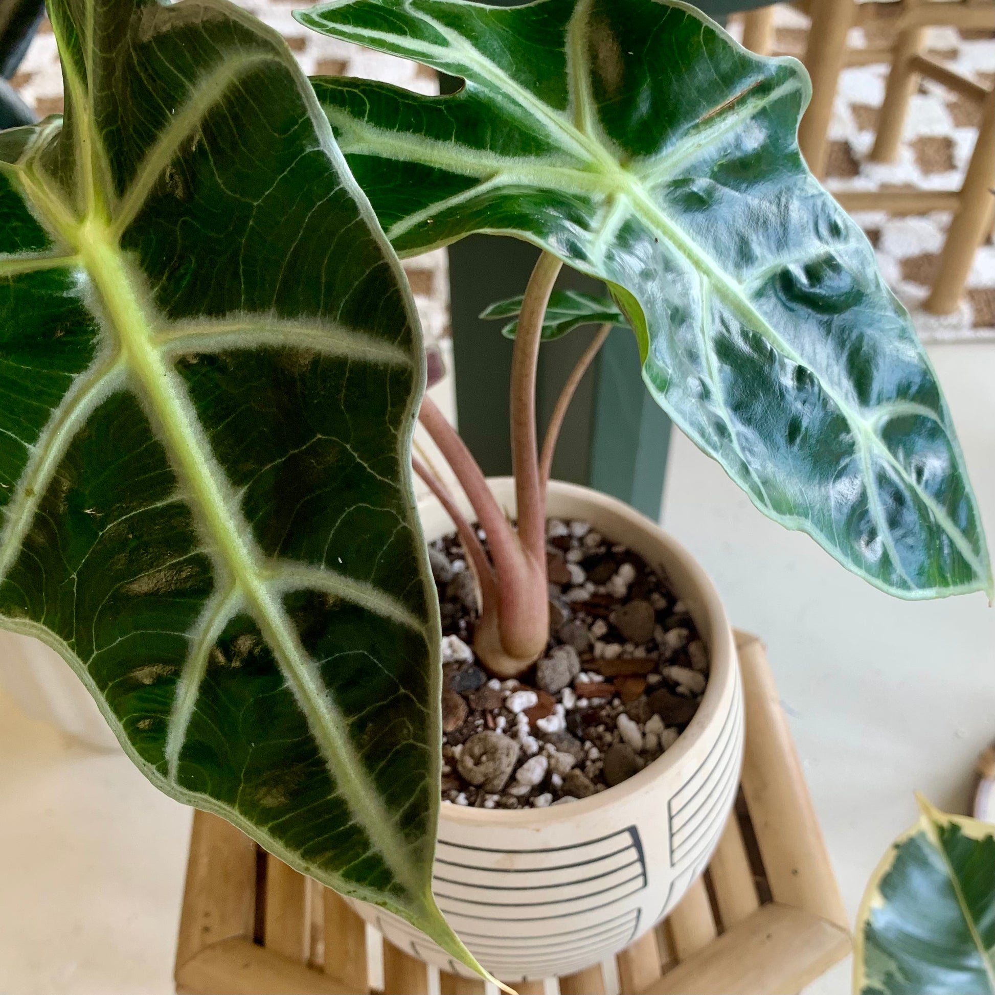 Alocasia Polly, upon first glance, will certainly leave you wondering how nature makes such weird and wonderful creatures! Its thick, textured leaves have a deep green to almost black hue, which makes a bold contrast to the pale green of its vein pattern. Its large elongated leaves, with their signature scalloped edges, make this plant really stand out, and gives it that tropical feel it is known for.