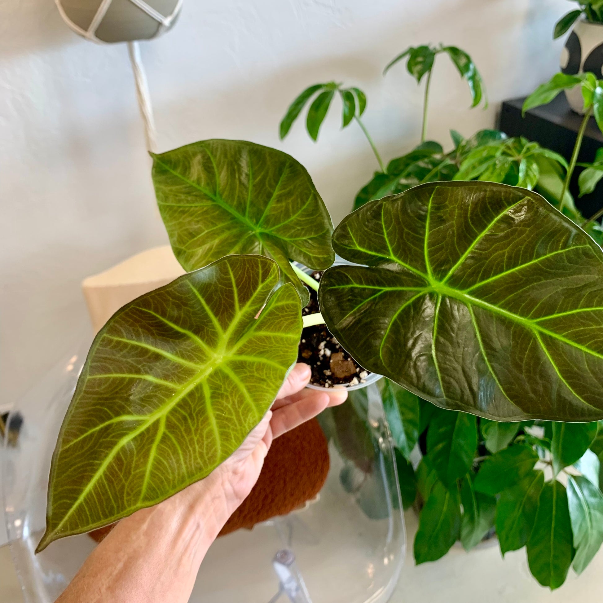 Alocasia ‘Regal Shield’ is a beautiful tropical perennial with large, sprawling leaves that can flourish in both outdoor and indoor settings. This elephant ear plant may occasionally produce white or green flowers, but its true beauty lies in its beautiful large foliage.  Regal Shield will thrive in warm, moist environments with partial sunlight. Please note that all parts of this plant, like others in the Alocasia genus, are toxic to both pets and humans.