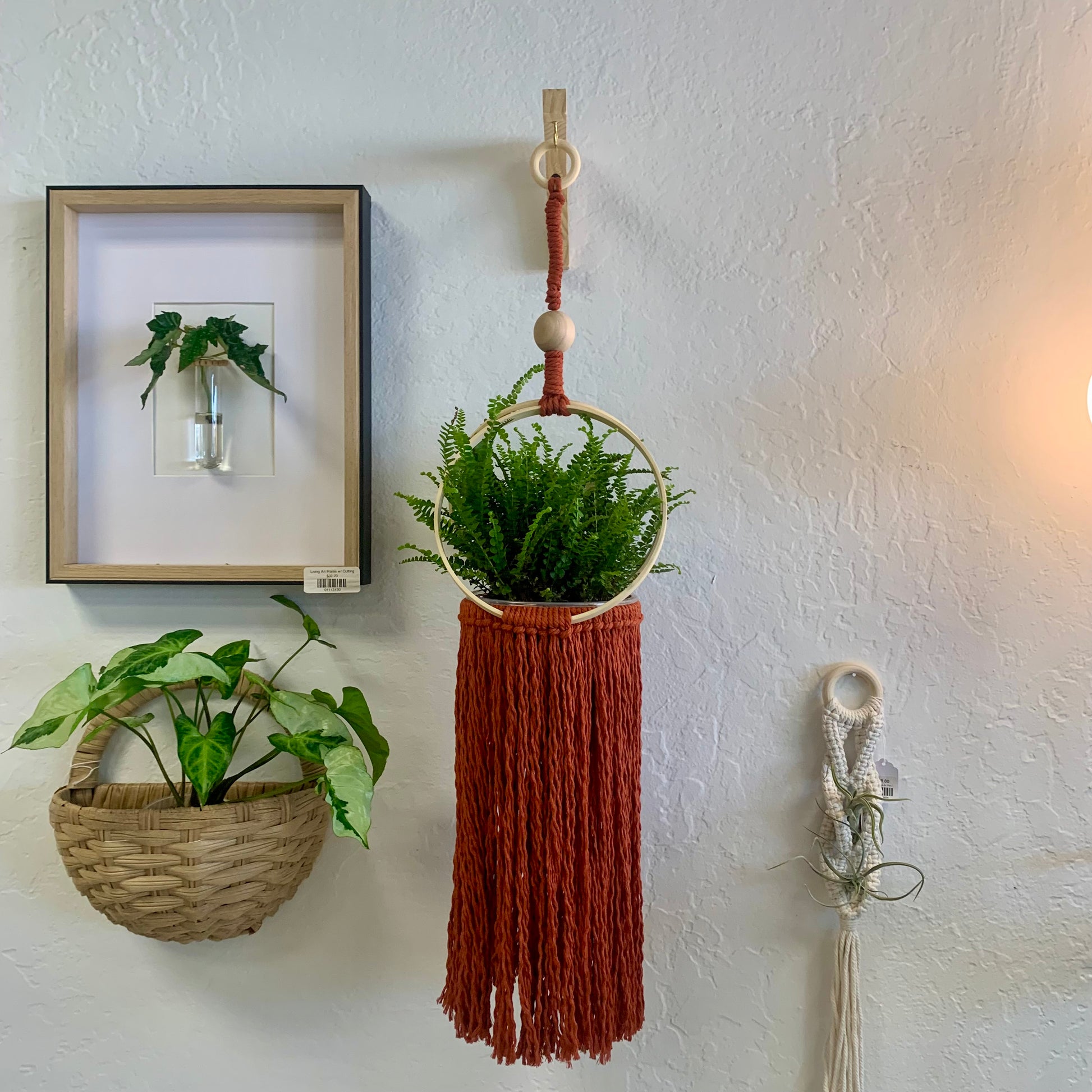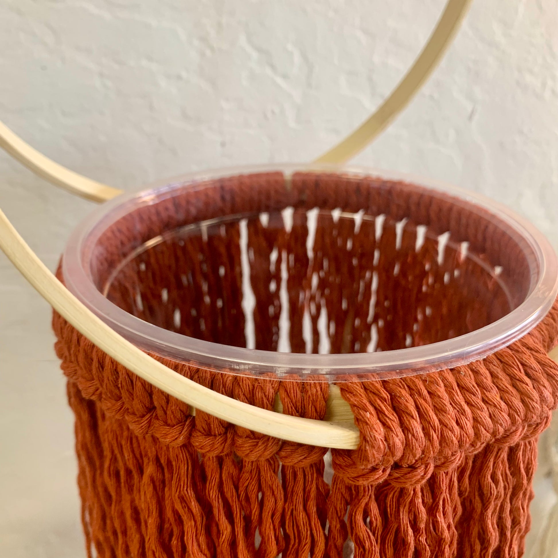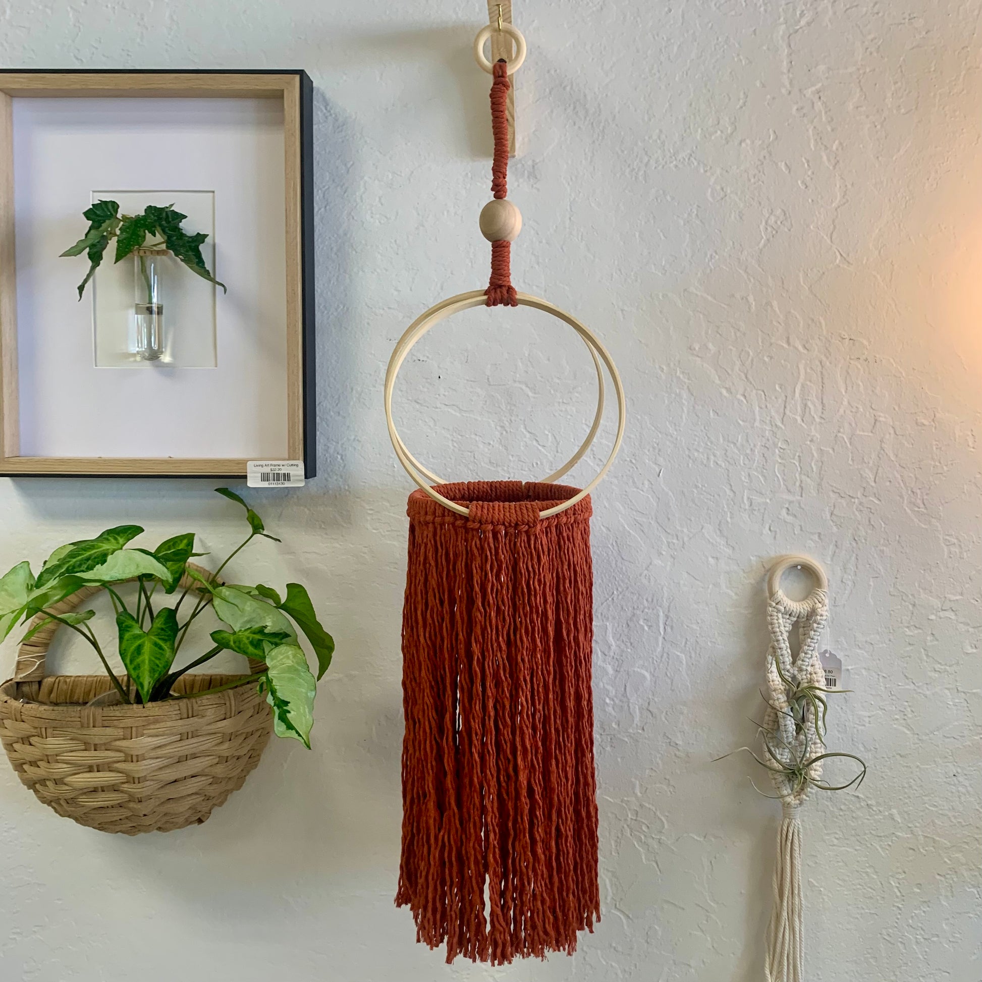 This product features a unique handcrafted design that will make a statement in any space. Made from materials, including a bold rust-colored macrame and wood rings, this cascading plant hanger is both functional and visually appealing. The wood ring makes for easy hanging, offering a convenient and stylish way to showcase your plants. Add this one-of-a-kind piece to your collection today.