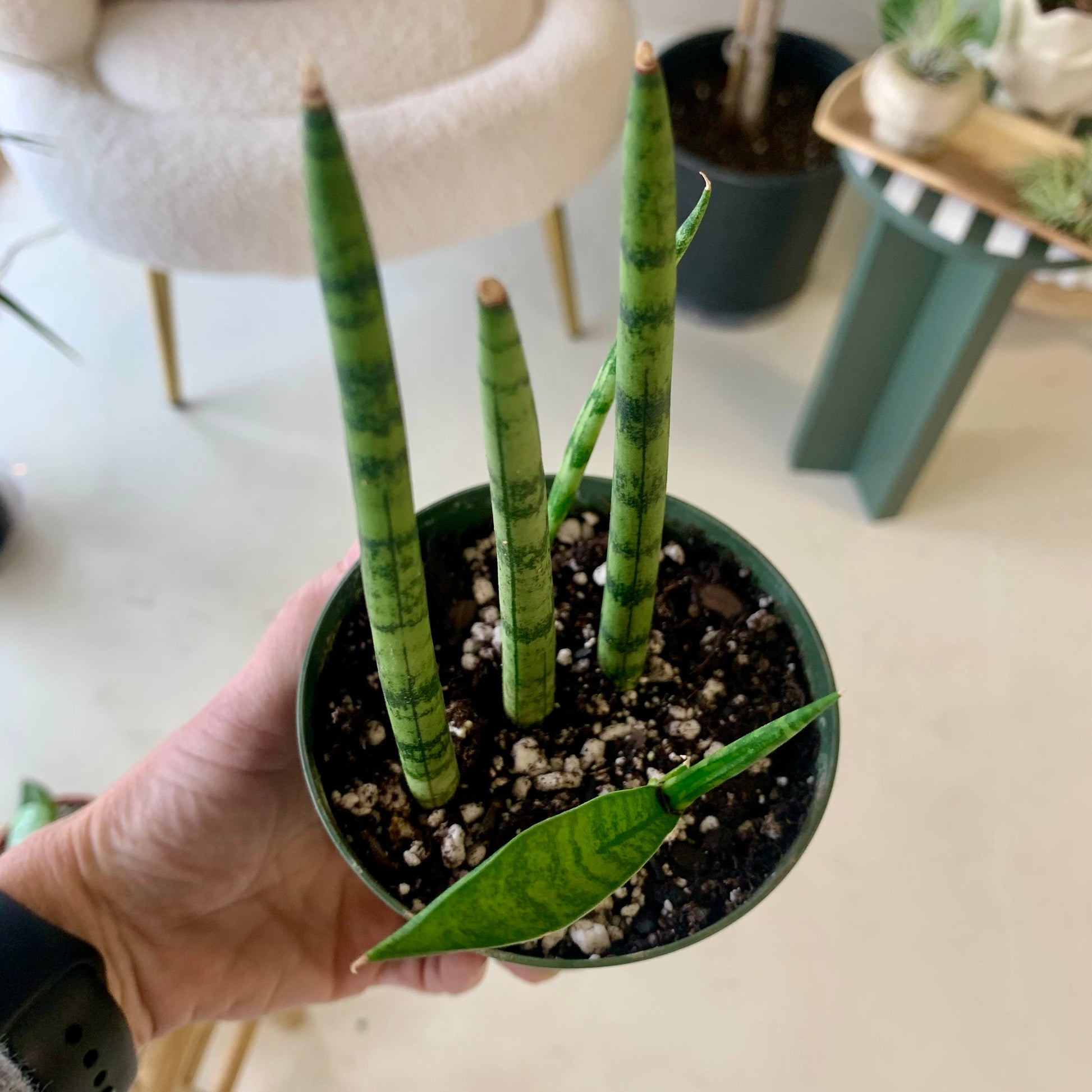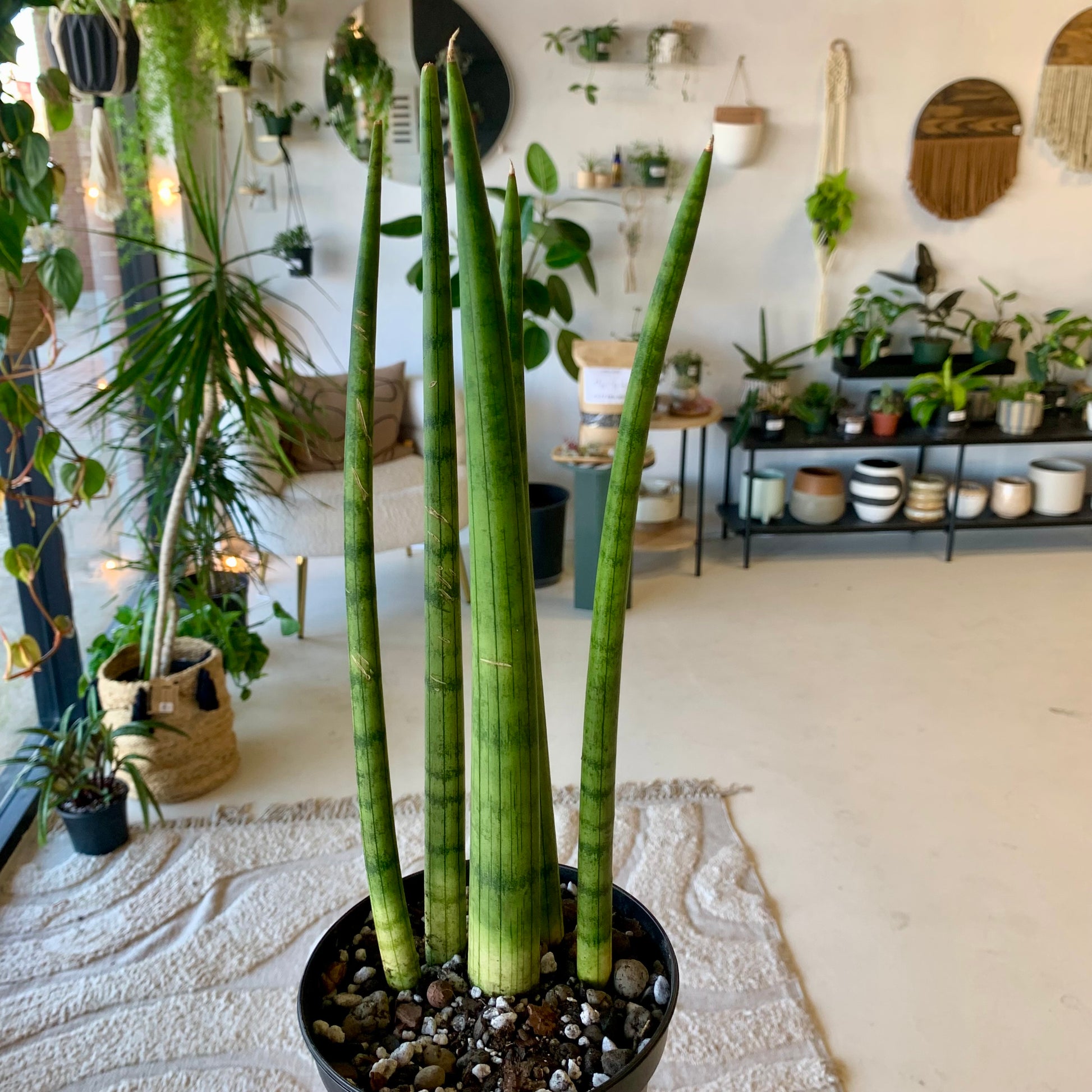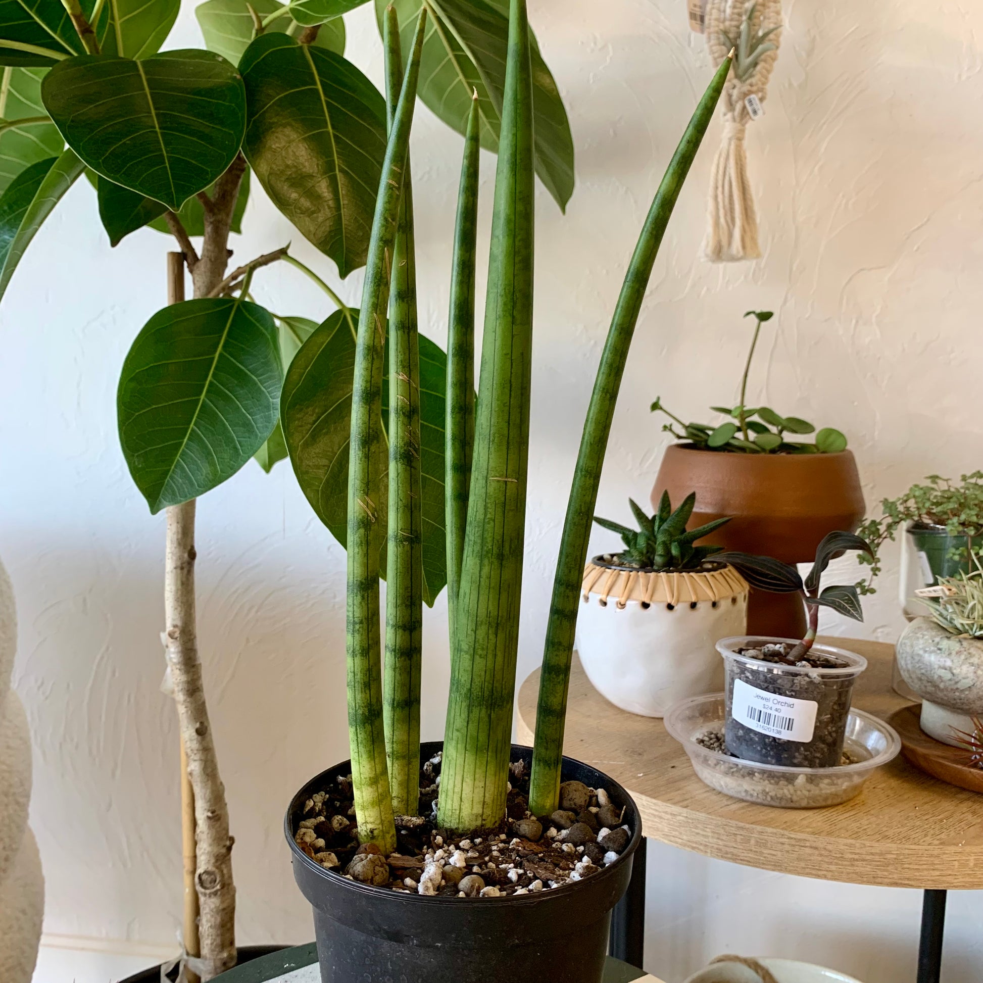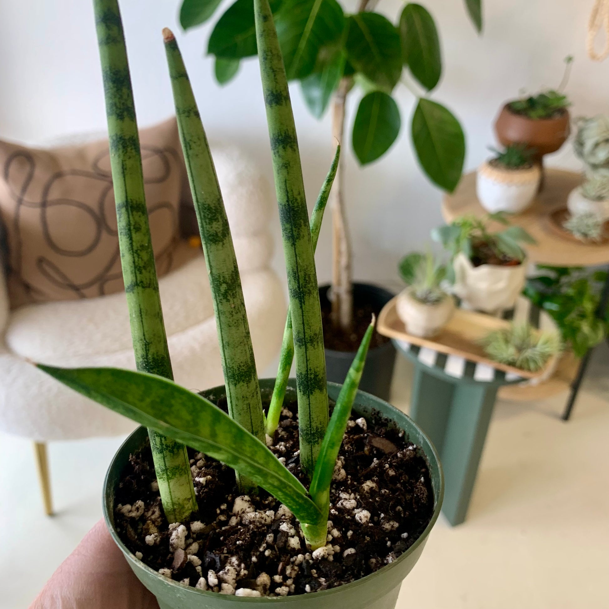 This Sansevieria cylindrica, or Cylindrical Snake Plant, is an easy-care house plant with dark gray-green foliage and upright habit. It offers moderate air purifying benefits in average humidity and temperature environments between 65-80 degrees. With low water requirements and minimal maintenance, it is perfect for busy lifestyles. Its slow-growing and will eventually reach 18-36 inches mature height and 1.5-2 feet spread.