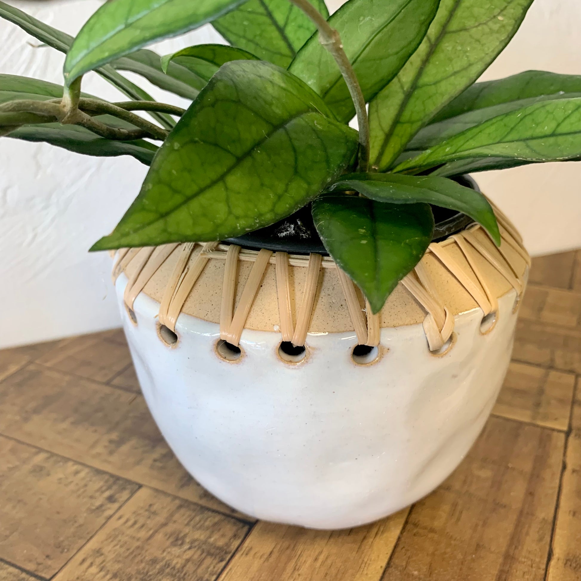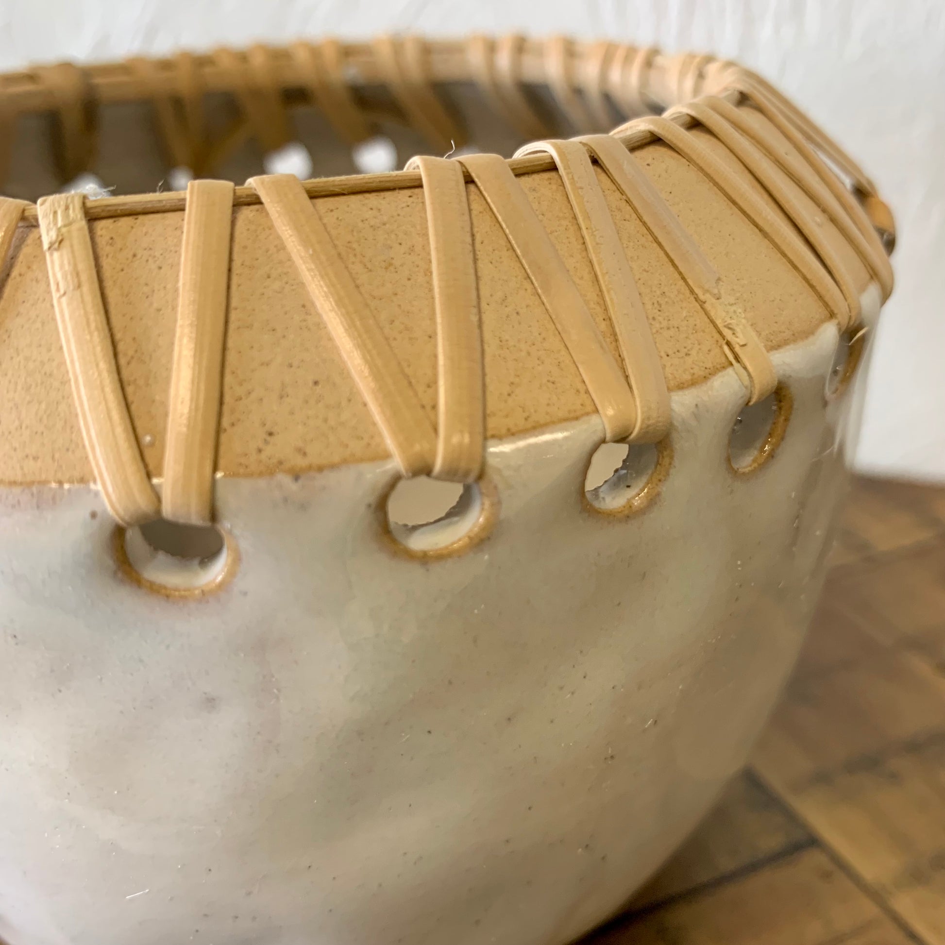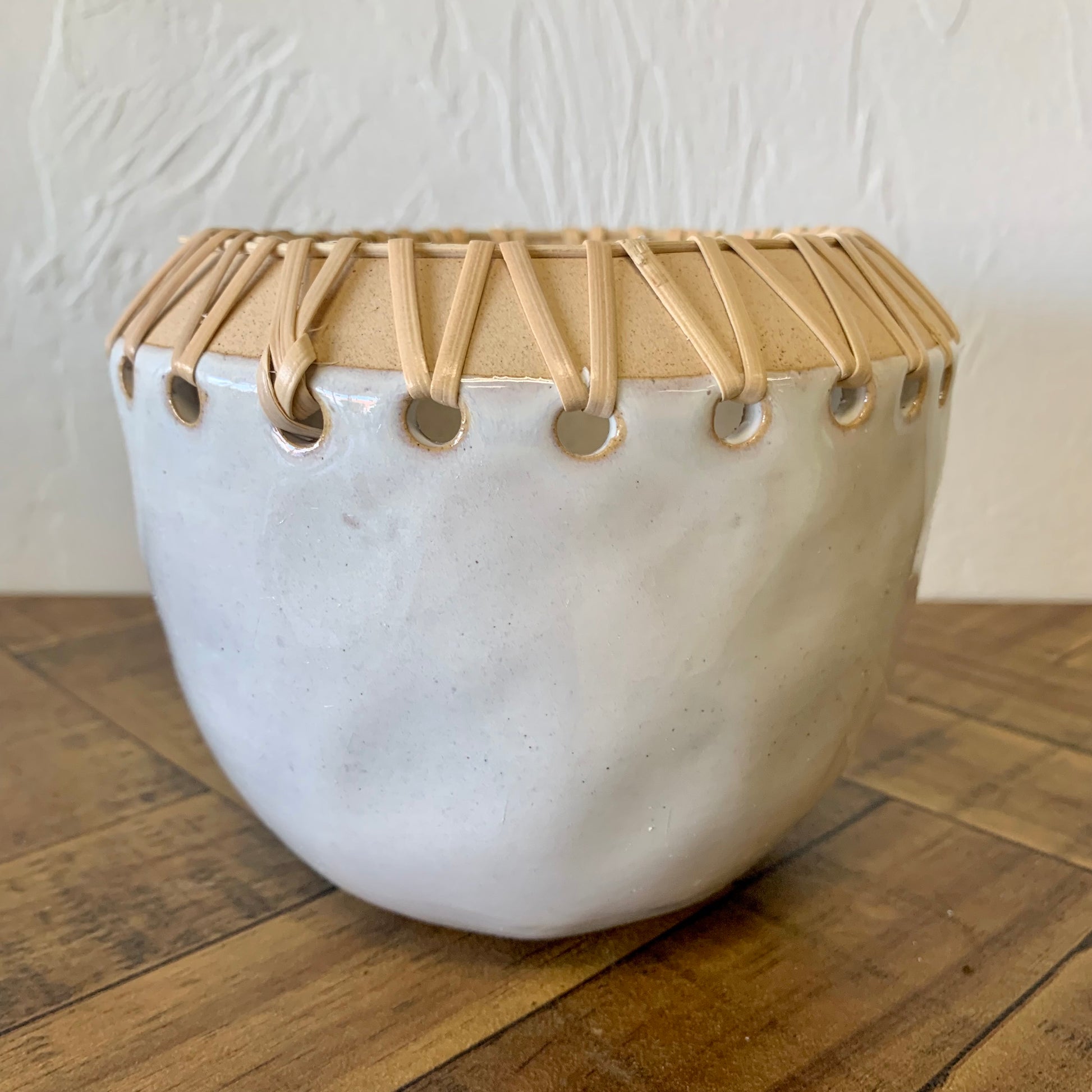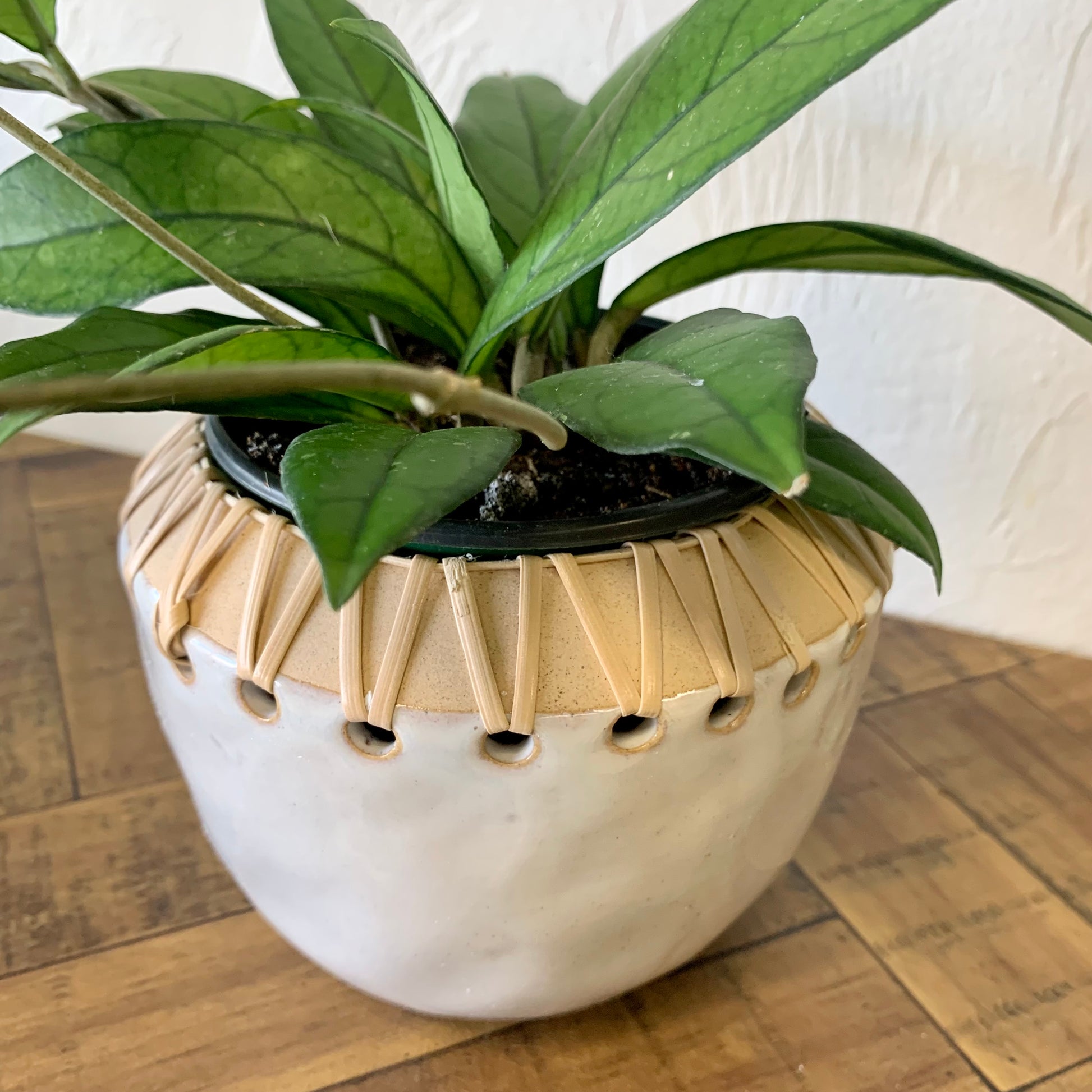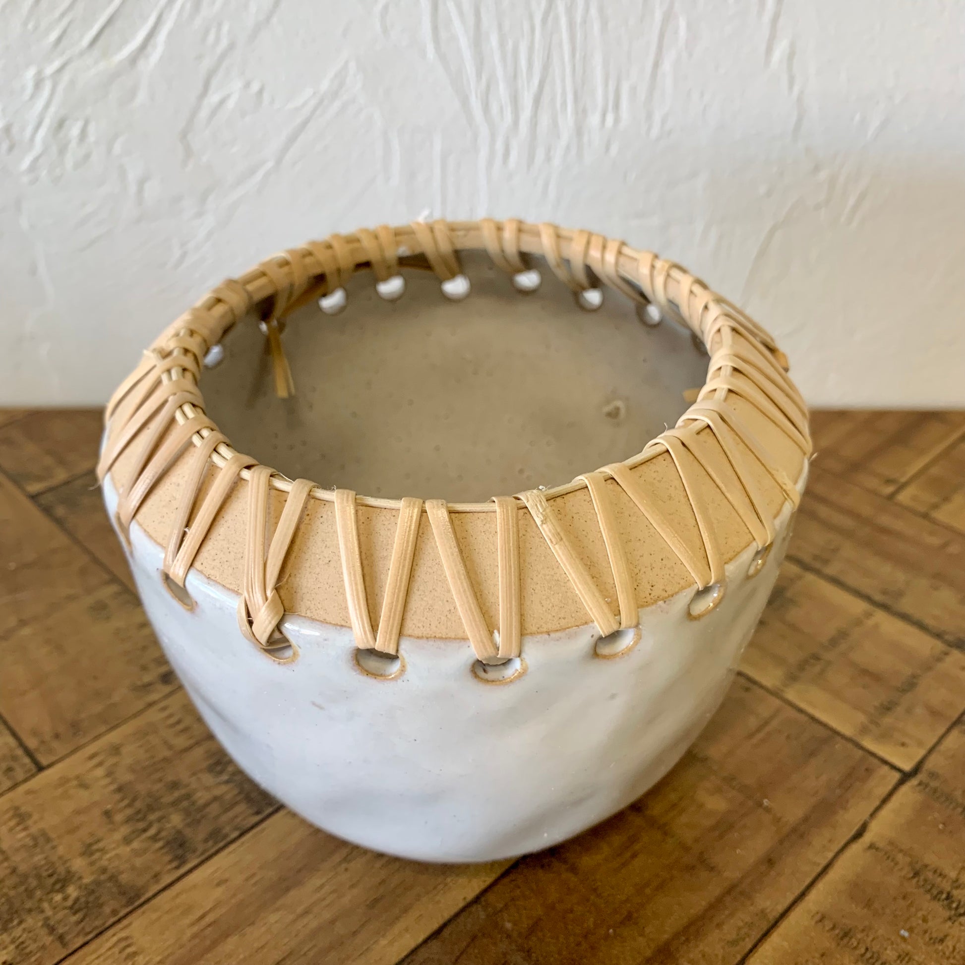 This pot is a beautiful way to display your favorite small plant. Pot holds a 3-4" nursery pot. Made out of stoneware, this pot has rattan stitching and a neutral cream colored base. This small planter looks great on table tops and shelves.