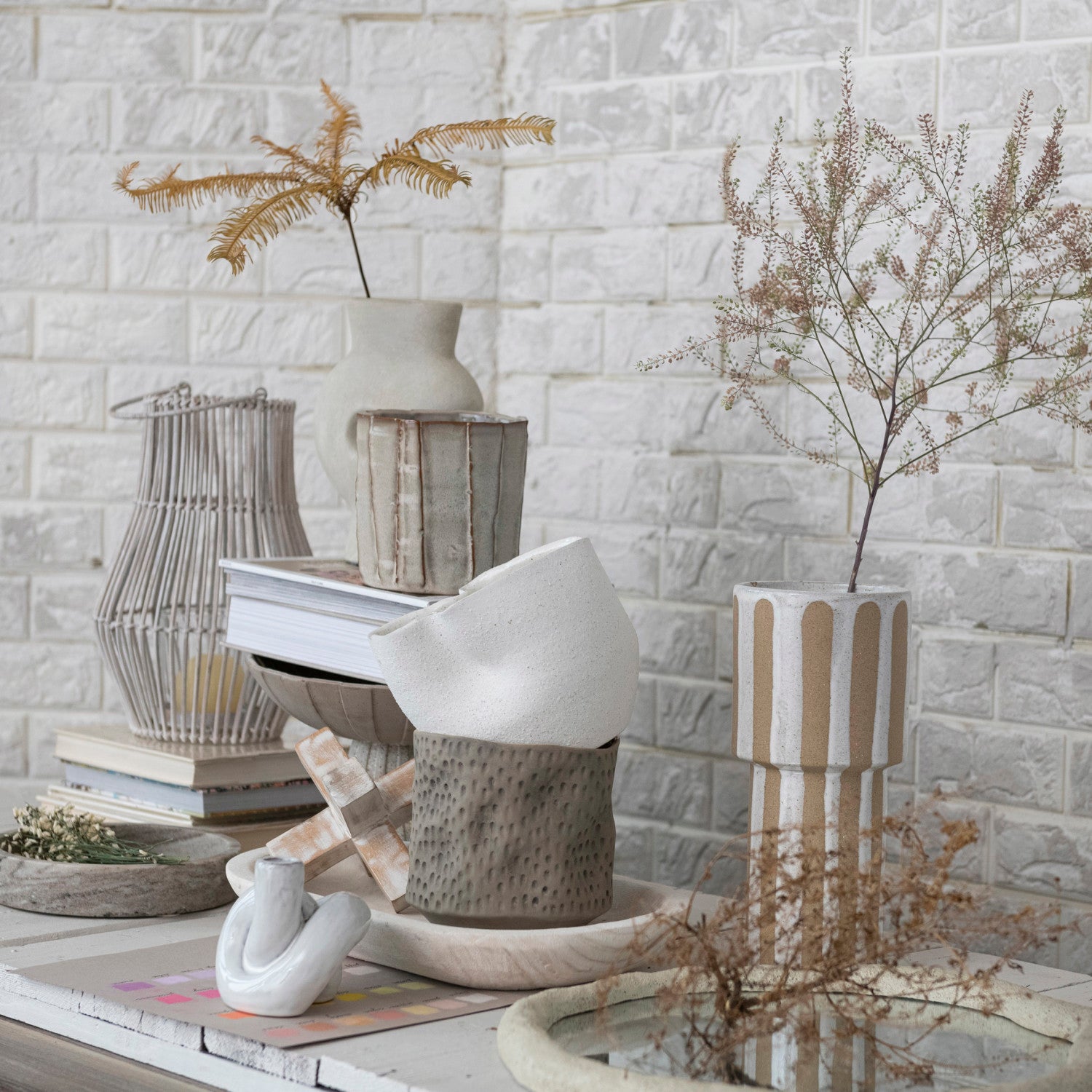 5" Round x 11-1/4" Tall Stoneware Vase w/ Wax Relief Stripes, Cream Color & Brown