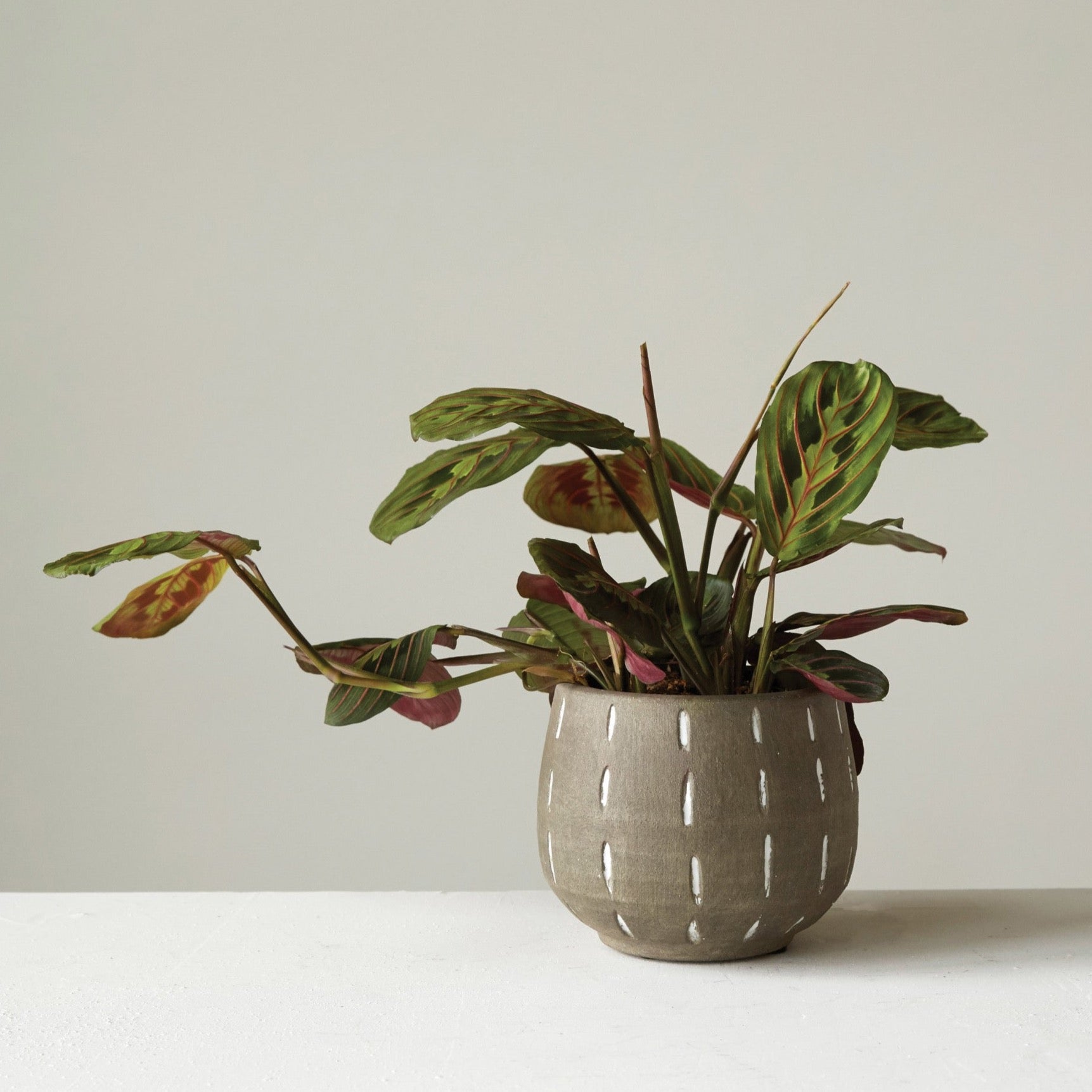 Gray 5" Round x 4-1/2"H Terra-cotta Planter, Glazed w/ Debossed Lines (Holds 4" Pot)