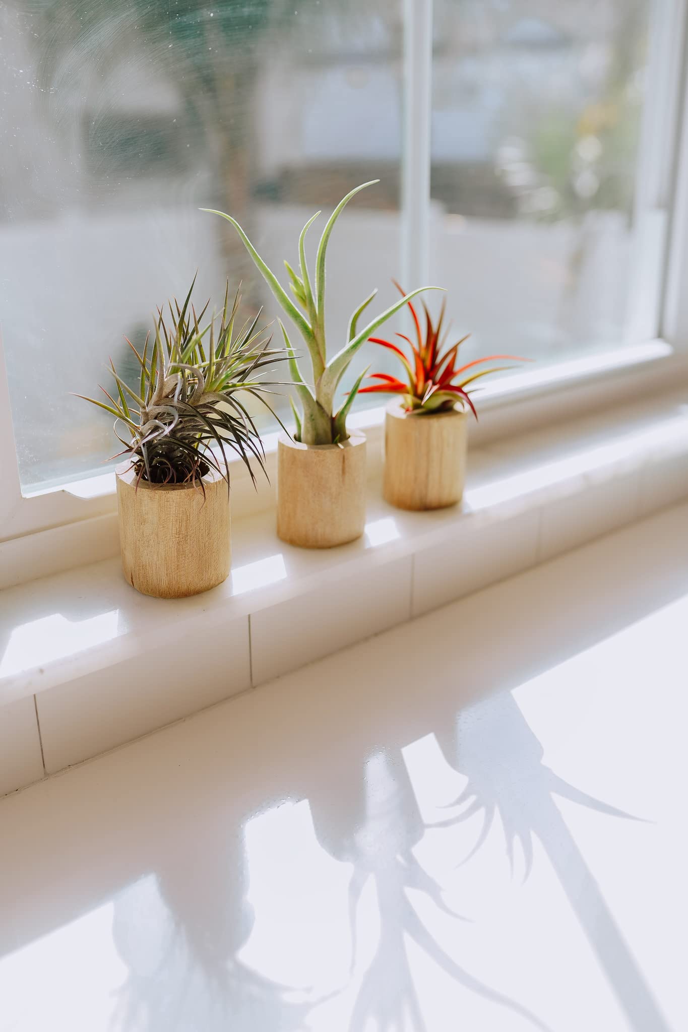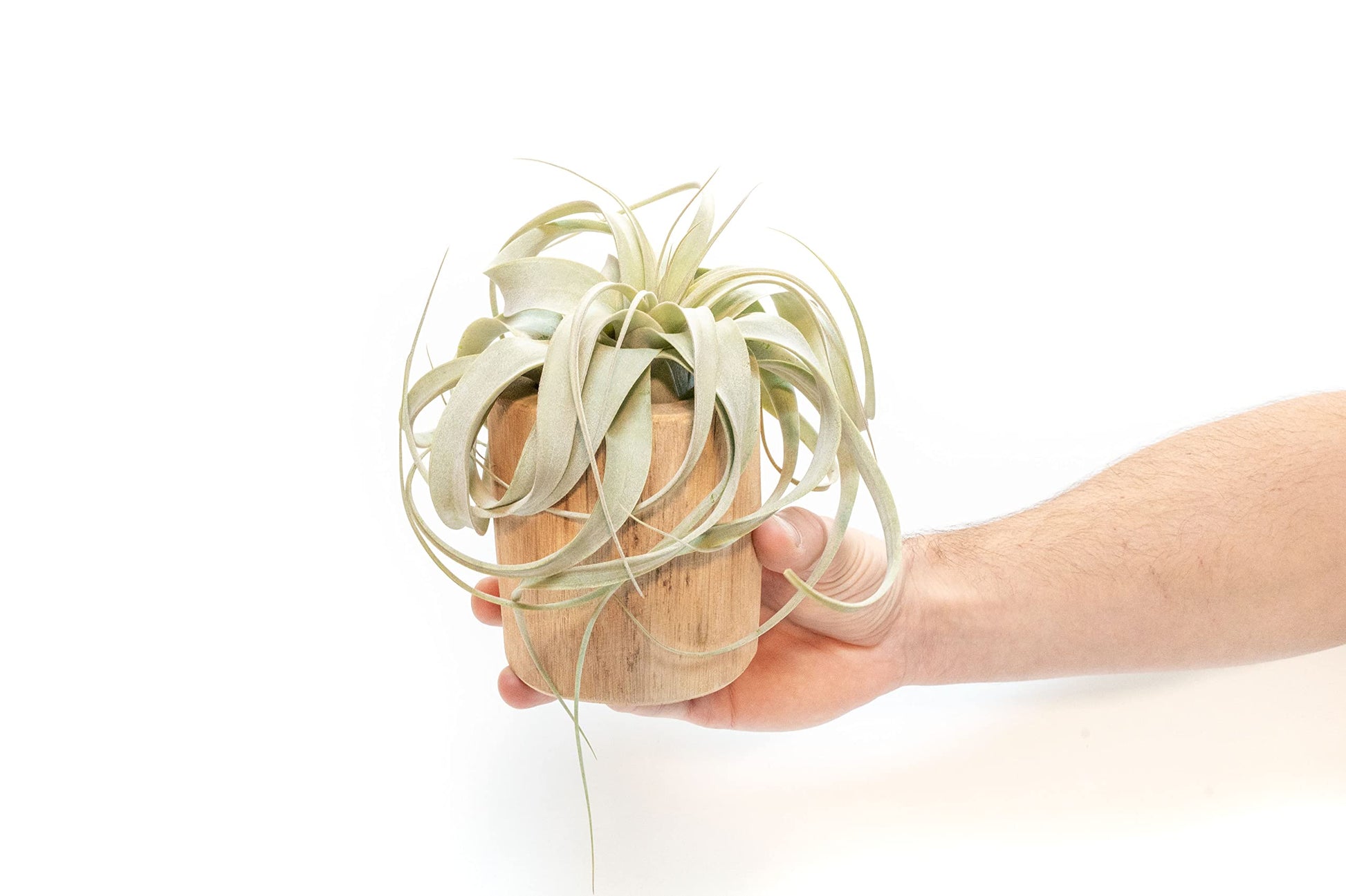 - ABOUT THIS DESIGN: Sizes; Driftwood Container - 3 inches wide, 5 inches tall / Plant - 4-5 inches wide, 3-4 inches tall. Our hand-carved driftwood containers are made from sun-bleached wood stumps and are a beautiful container for many of our medium to large-sized air plants. There are some cracks and imperfections in the wood as every piece is unique.
