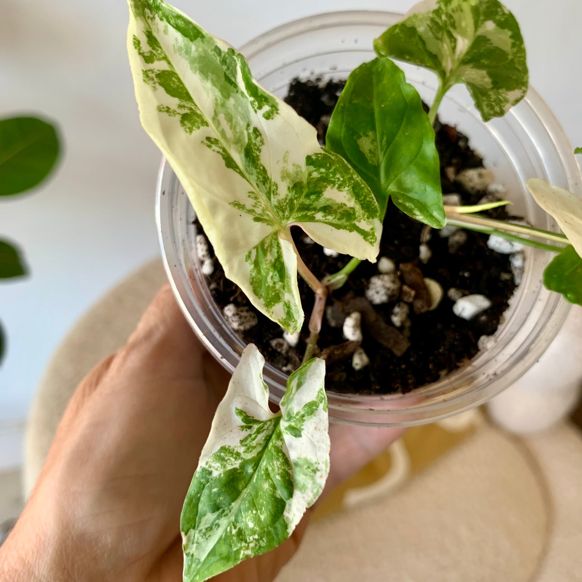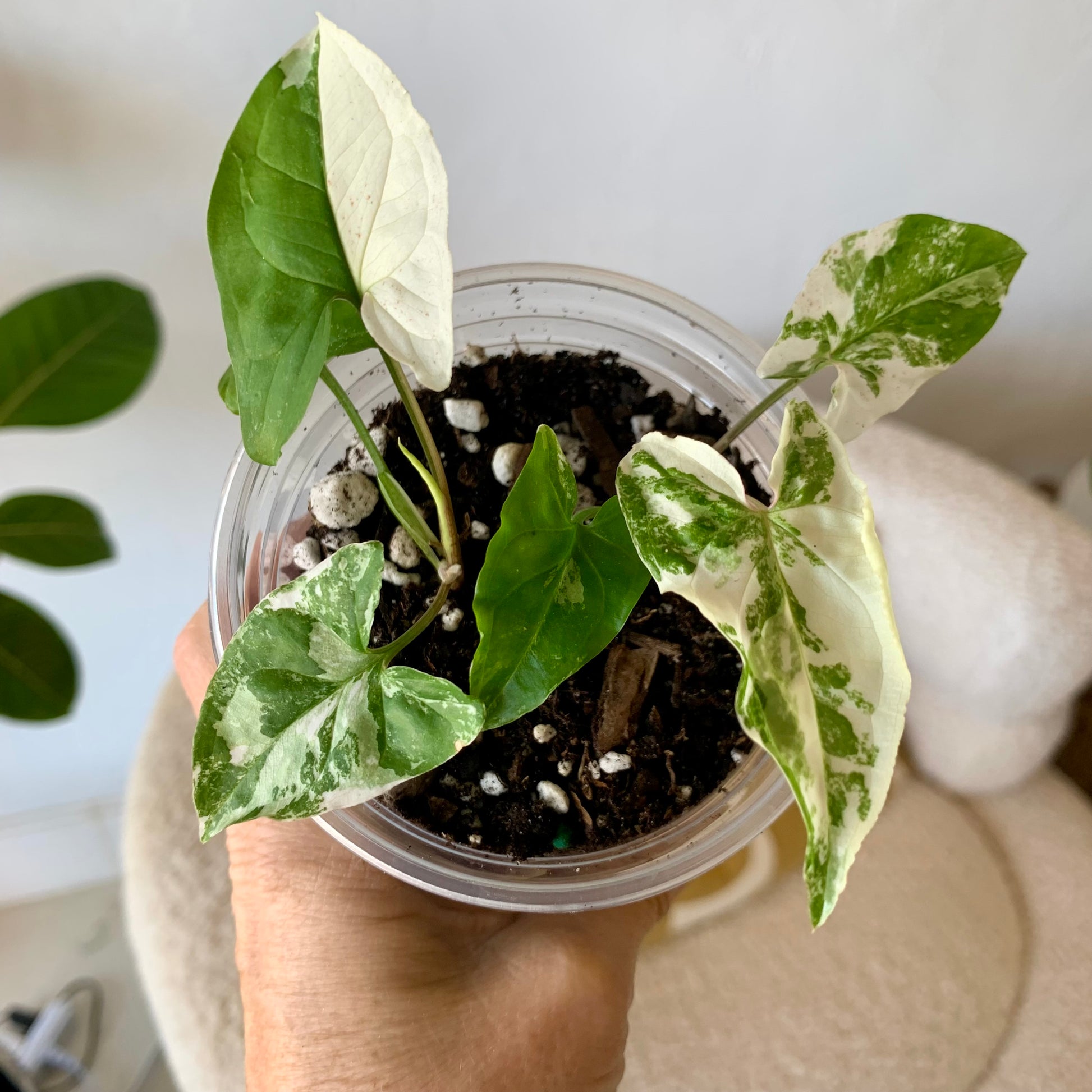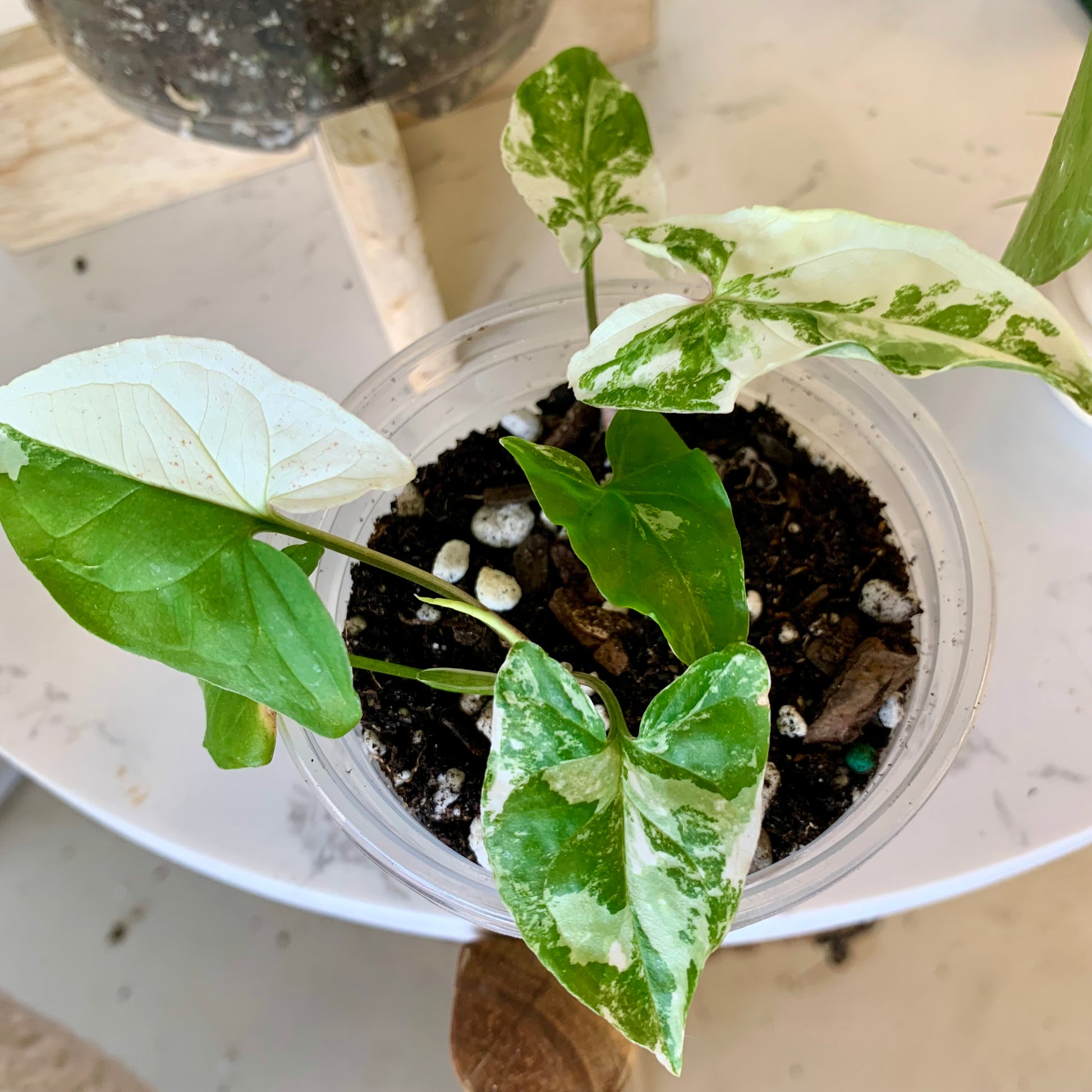 The Syngonium Podophyllum Albo-Variegatum is a desirable aroid with arrow-shaped leaves that are marbled and sectioned with shades of green and pure white patches. It's super easy to care for and if you give it a pole to climb the leaves will become much larger. The leaves have variable variegation, each new leaf is random in variegation ranging from slightly variegated to almost all white.