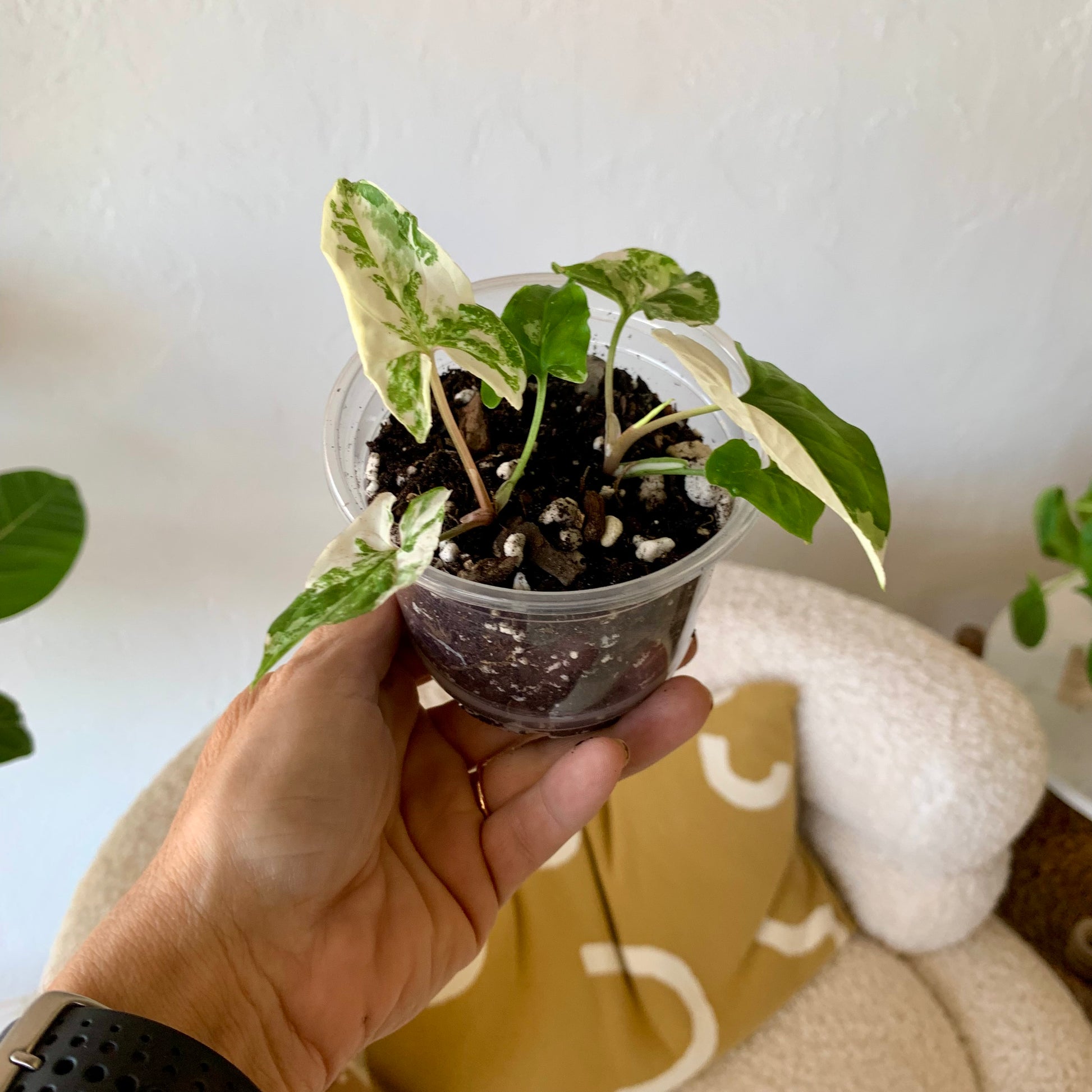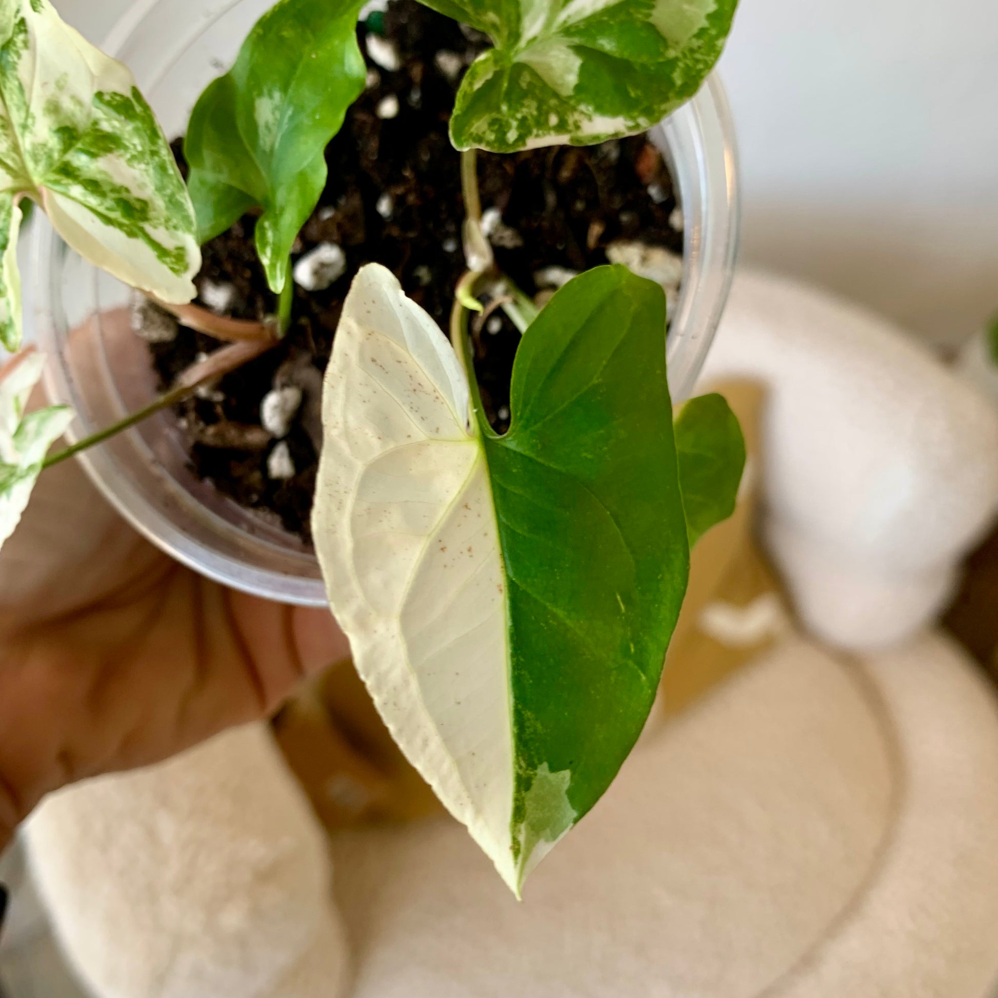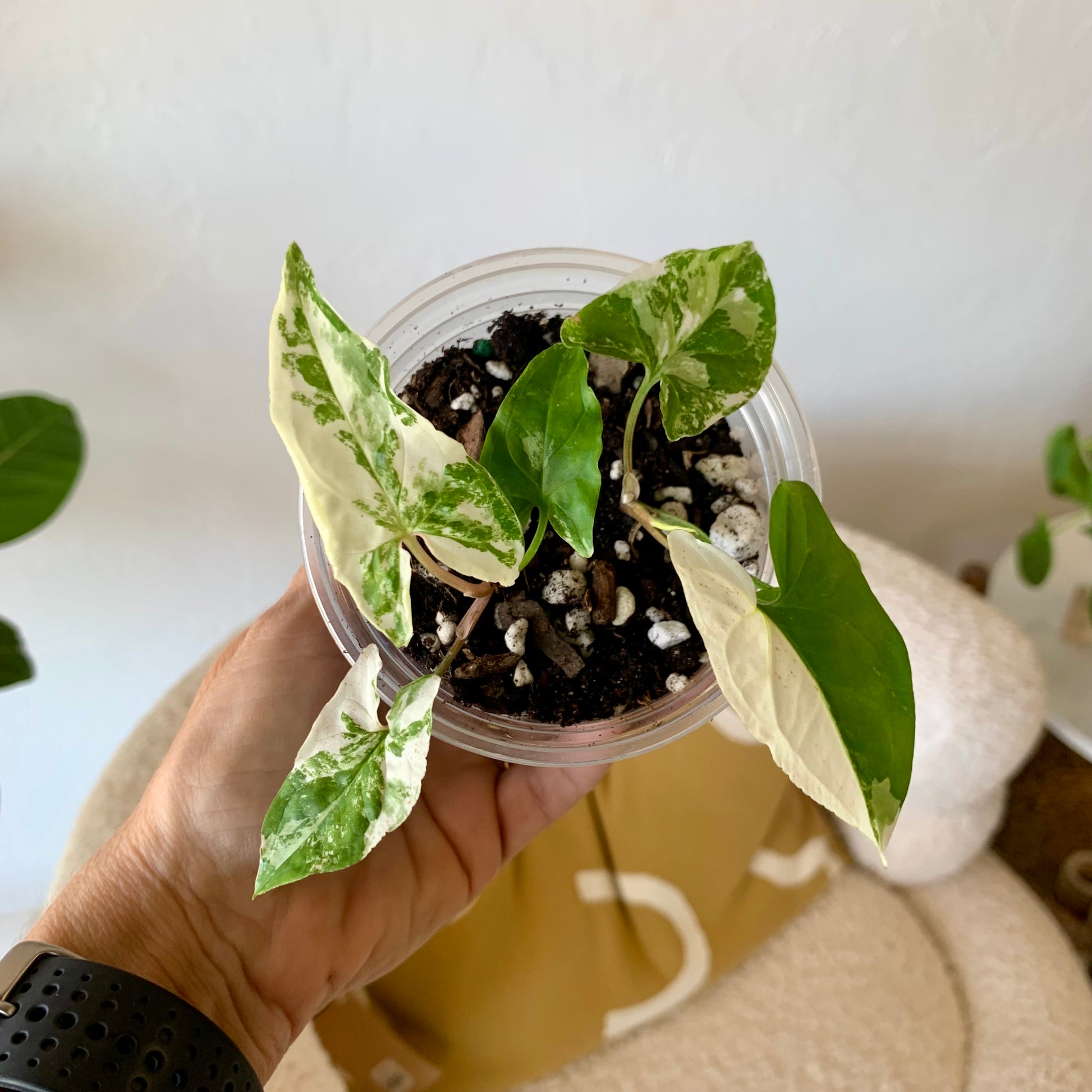 The Syngonium Podophyllum Albo-Variegatum is a desirable aroid with arrow-shaped leaves that are marbled and sectioned with shades of green and pure white patches. It's super easy to care for and if you give it a pole to climb the leaves will become much larger. The leaves have variable variegation, each new leaf is random in variegation ranging from slightly variegated to almost all white.