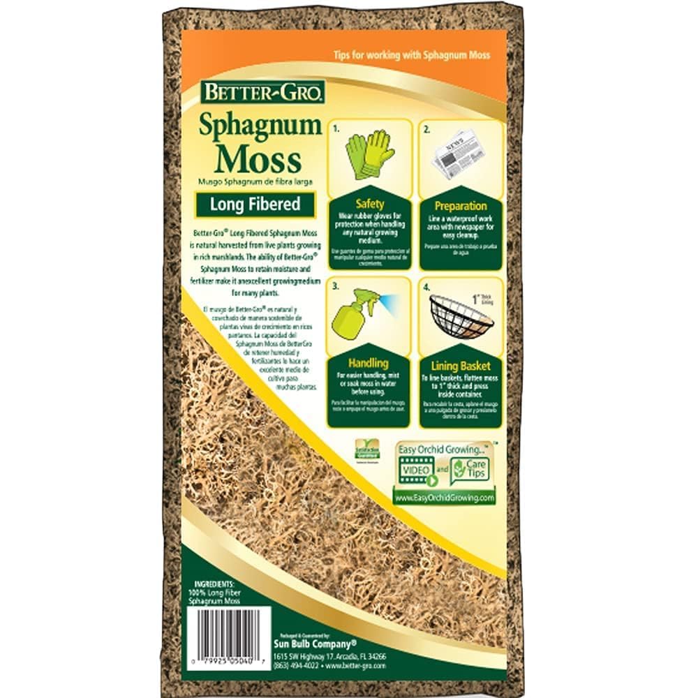 This Better-Gro Sphagnum Moss is an all-natural material harvested from live plants growing in rich marshlands. The ability of Better-Gro Sphagnum Moss to retain moisture and plant food makes it an excellent growing medium for many plants. Easy to use a medium that holds moisture and fertilizer for growing plants. Excellent for lining wire baskets, mounting staghorn or bromeliads, and lining and filling wire forms of topiary.