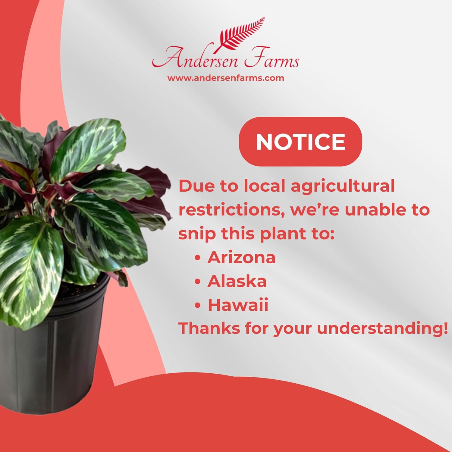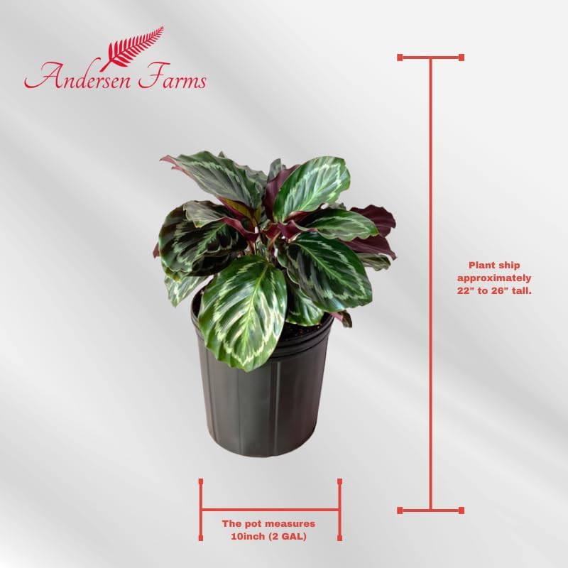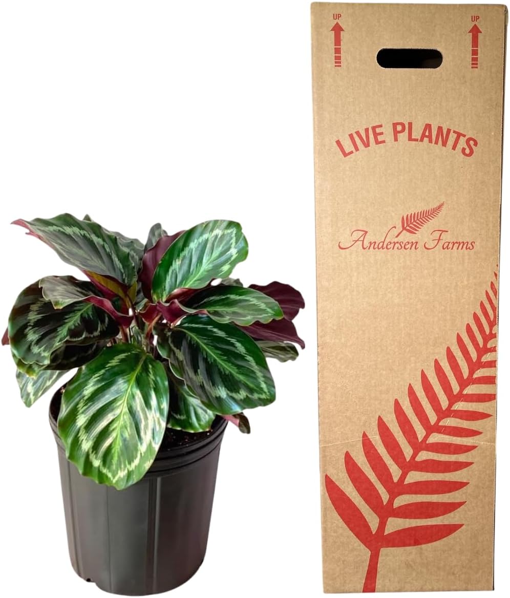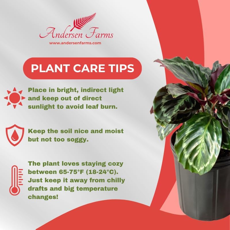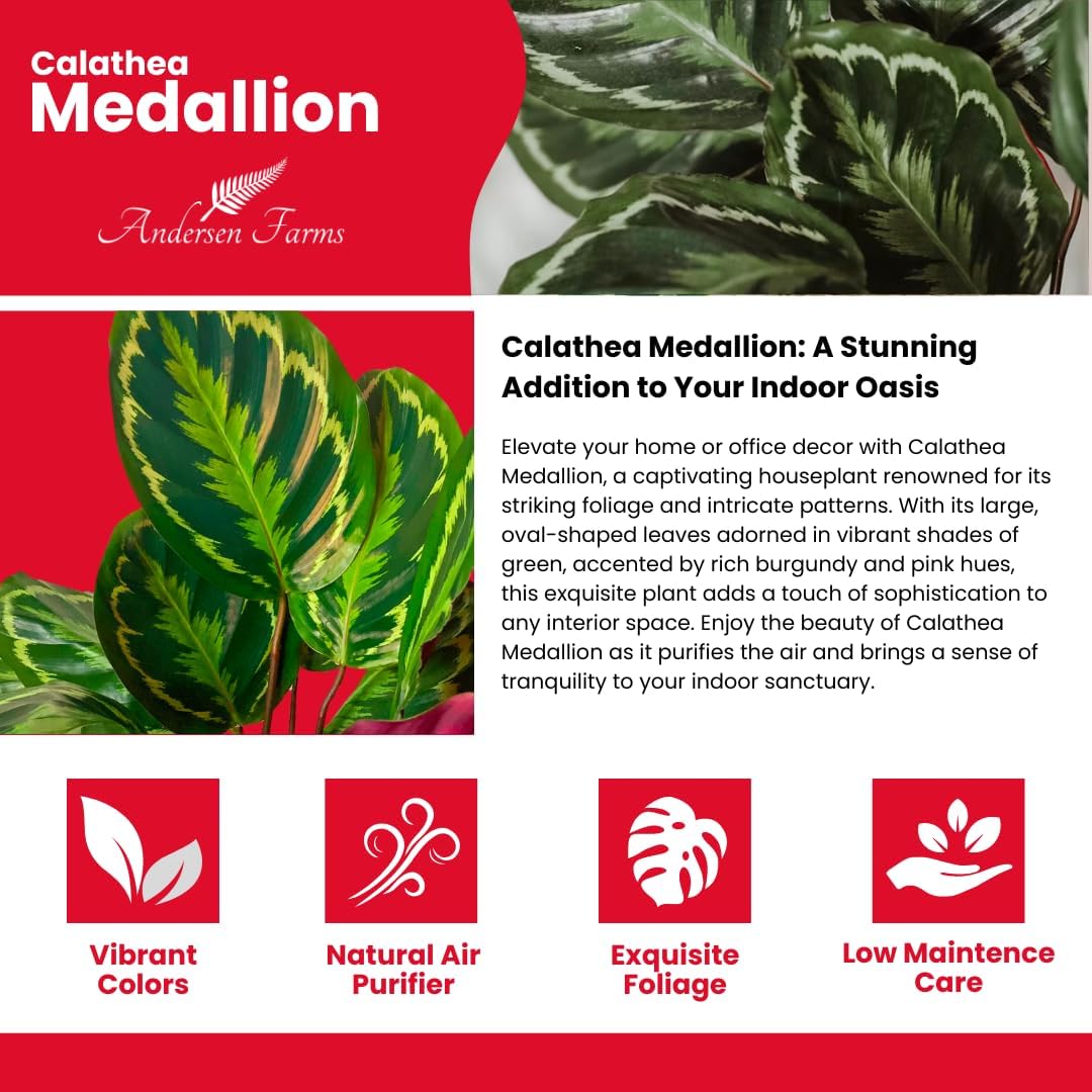 🌿 Striking Medallion Patterns The Calathea Medallion features stunning, large, oval-shaped leaves with intricate, medallion-like patterns that make this plant a true work of art. Its exotic appeal brings a regal touch to any space. ☀️ Bright, Indirect Light This plant thrives in bright, indirect light, making it perfect for rooms with plenty of natural light but no direct sun exposure. Ideal for areas like living rooms, bedrooms, or offices. 💧 Moderate Watering Needs The Calathea Medallion requires moderate watering. Allow the soil to partially dry out between waterings to avoid overwatering. This helps maintain a balanced care routine. 🐾 Pet-Friendly Safe for pets, the Calathea Medallion is non-toxic, allowing you to enjoy its beautiful foliage without worrying about your furry companions. 🌸 Low-Maintenance Elegance Not only is it visually captivating, but this plant is also easy to care for. With proper attention to light and water, the Calathea Medallion will flourish and elevate your home decor effortlessly.