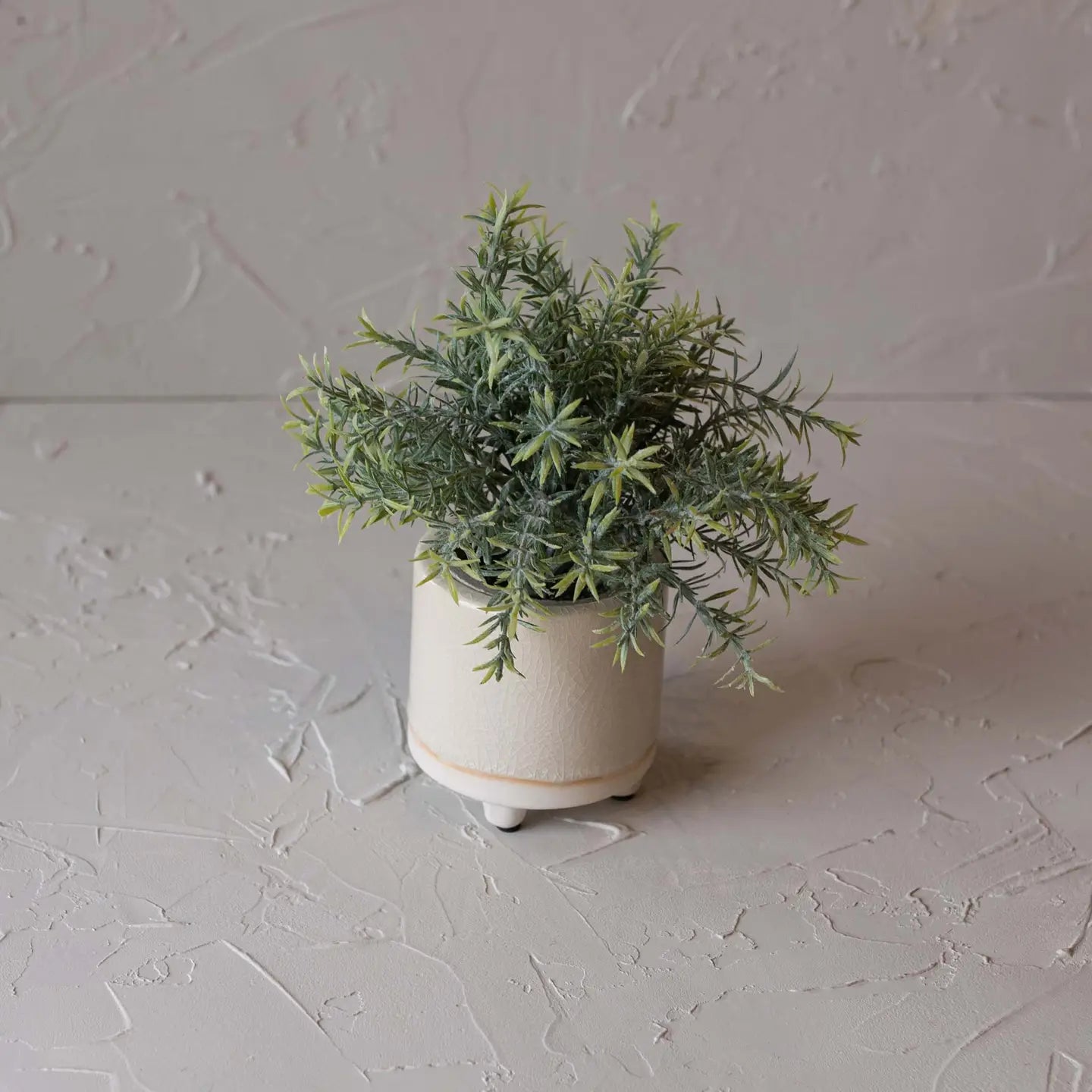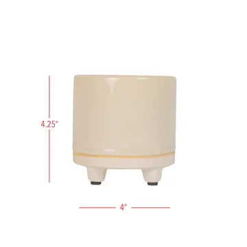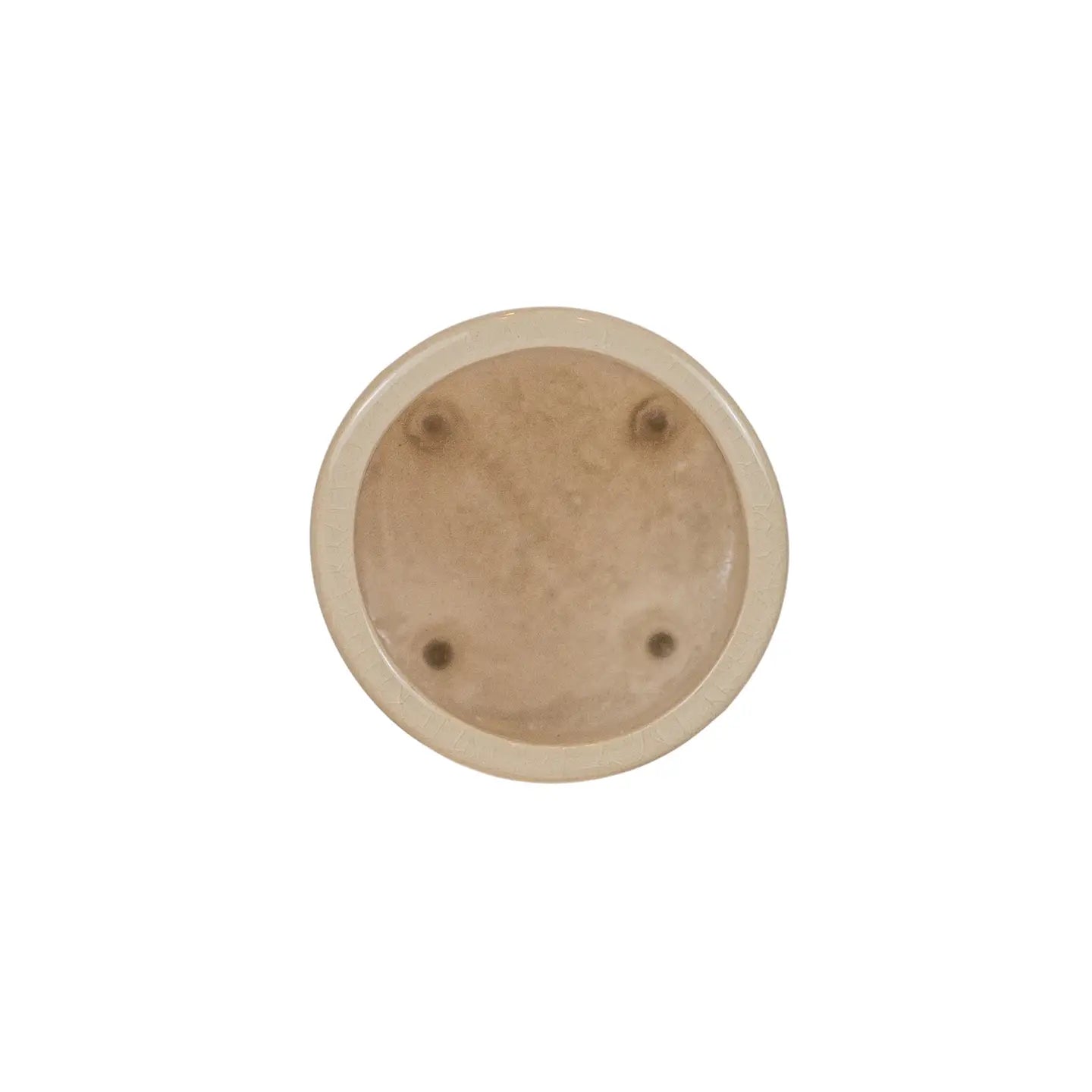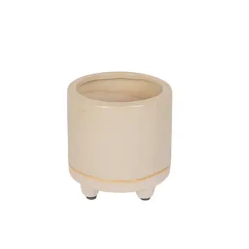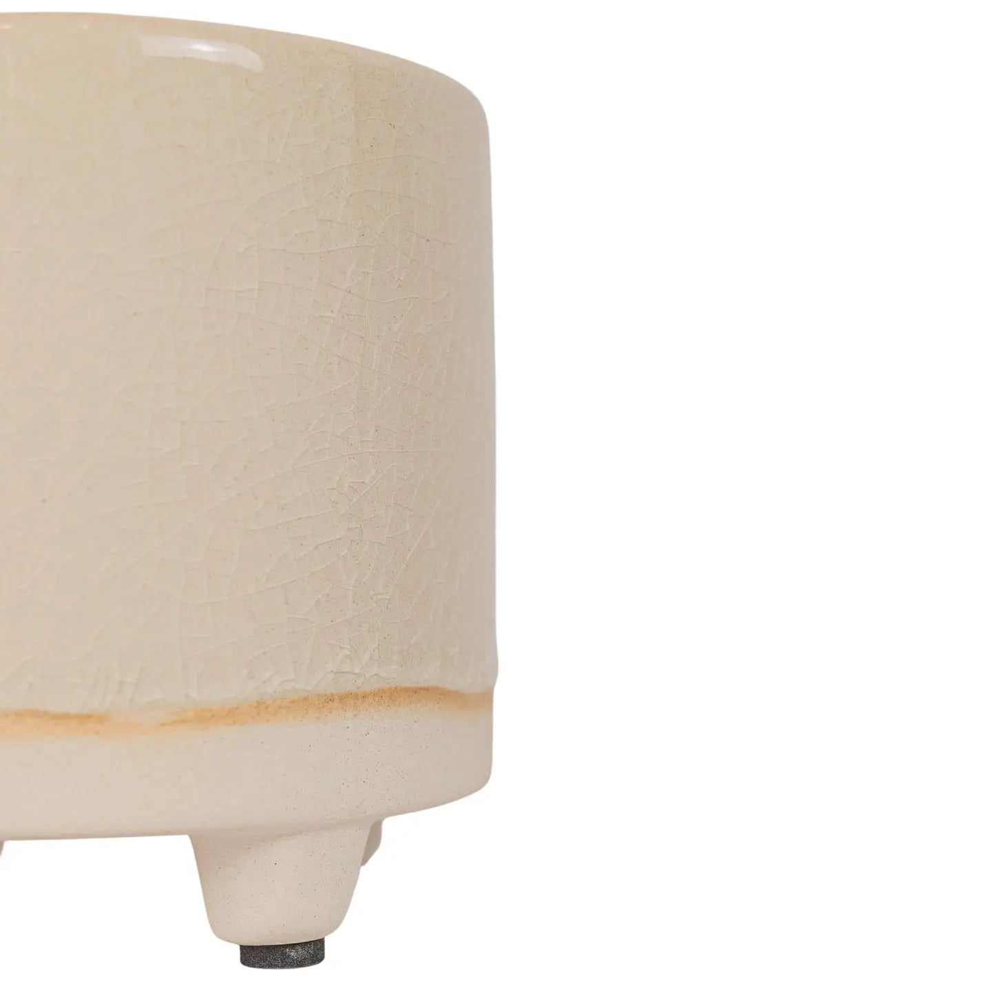 Add some charm to your home with this cream-colored footed planter. The glossy reactive crackle glaze is contrasted by the raw ceramic finish at the base, creating a textural and dimensional look. The soft beige tones offer warmth to your cozy room decor and create a neutral accent for a shelf or mantel.