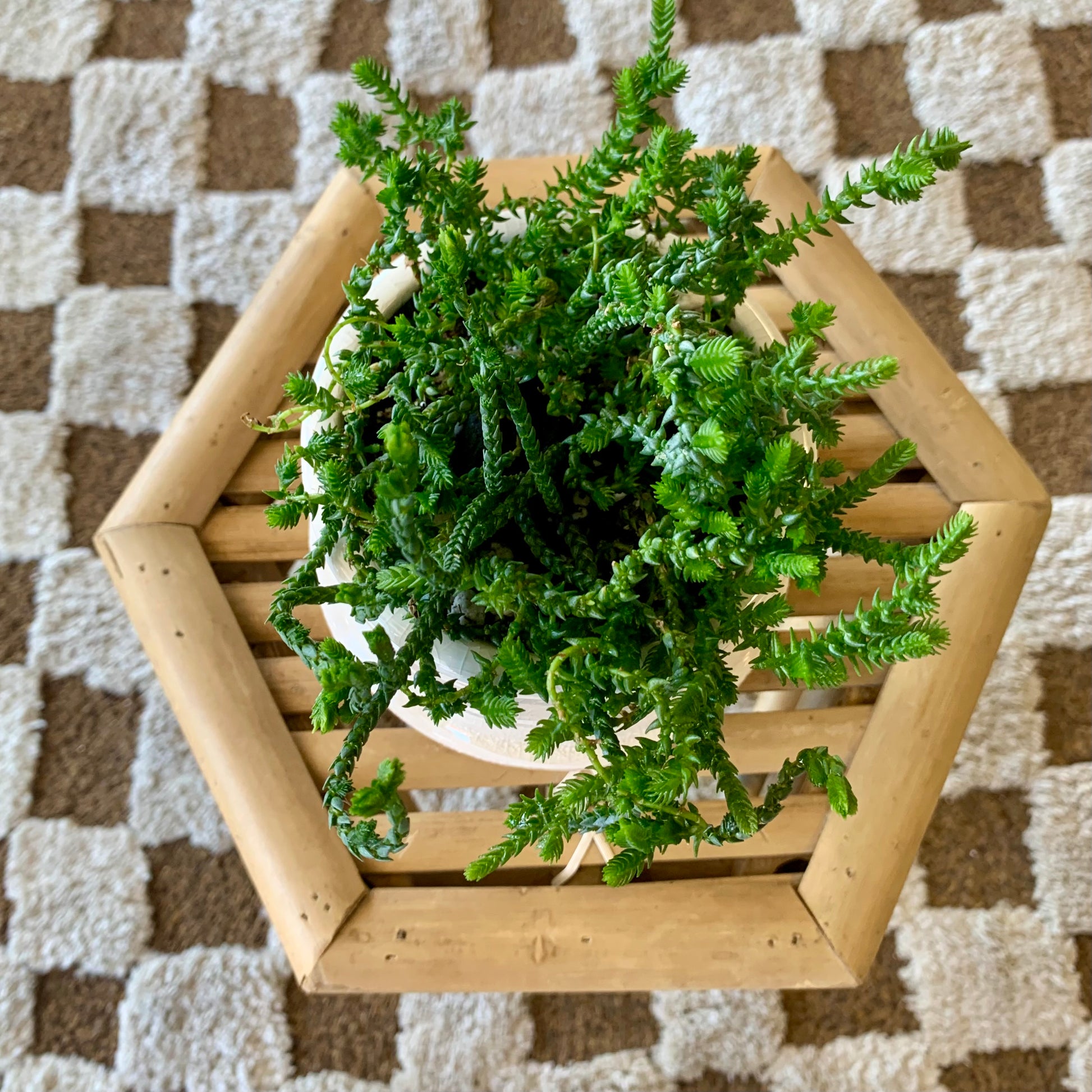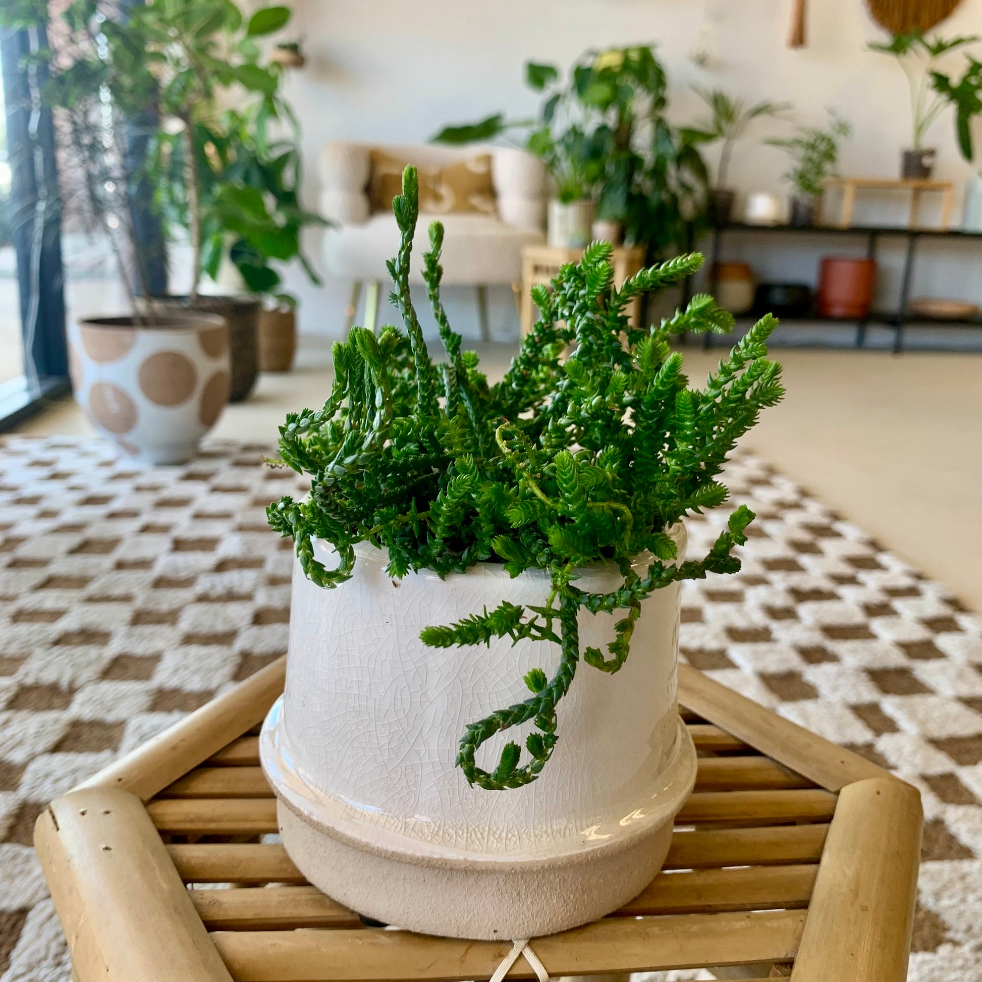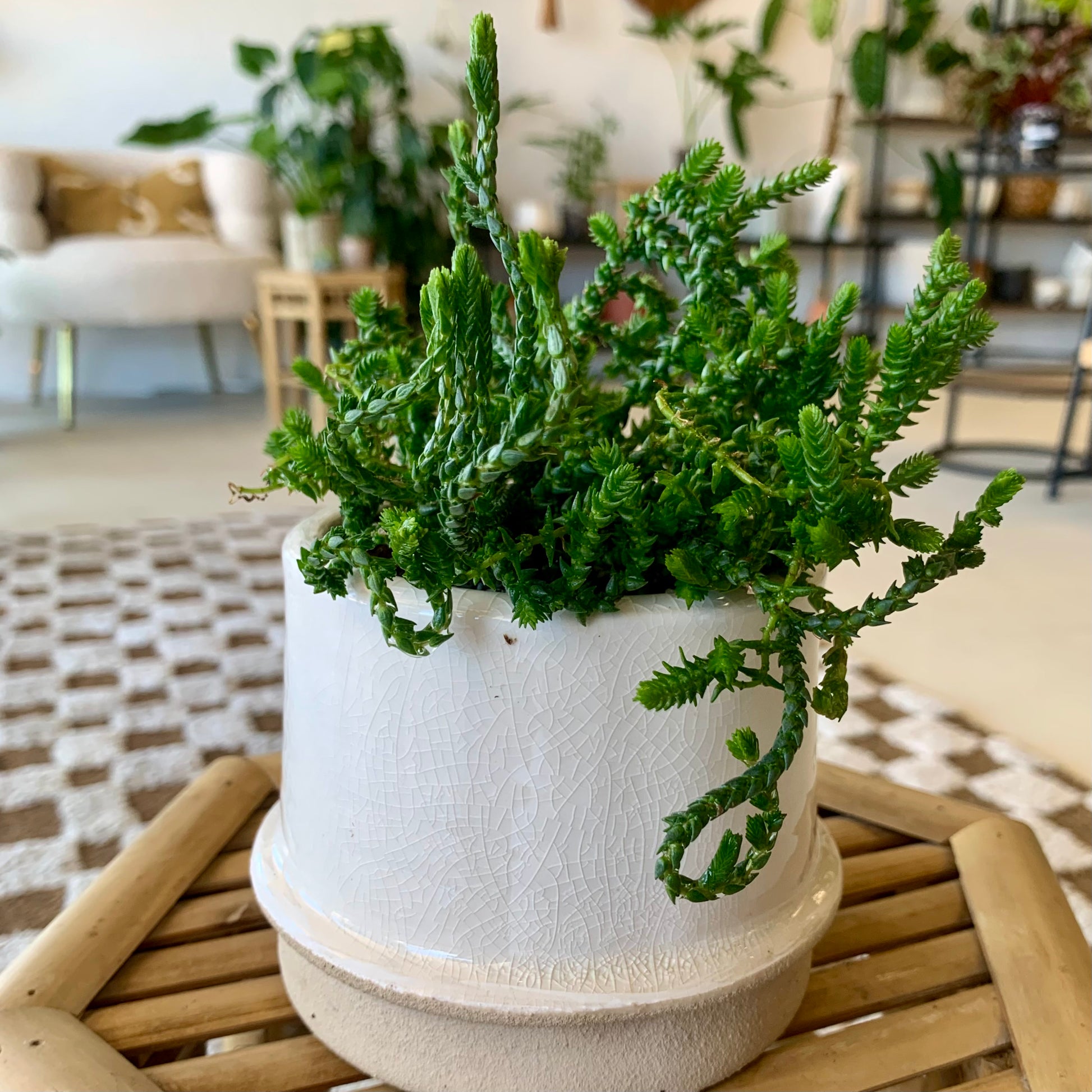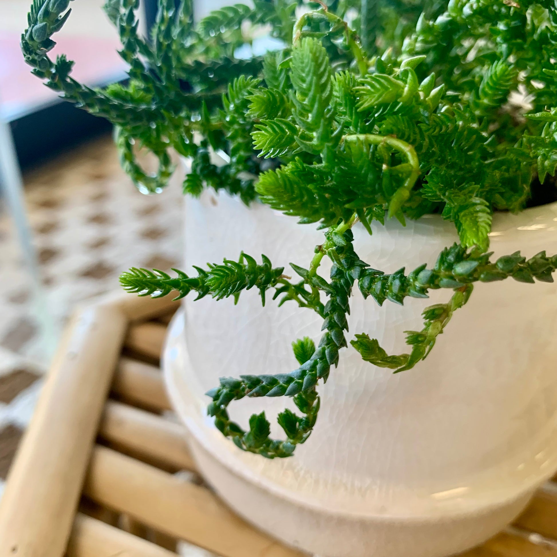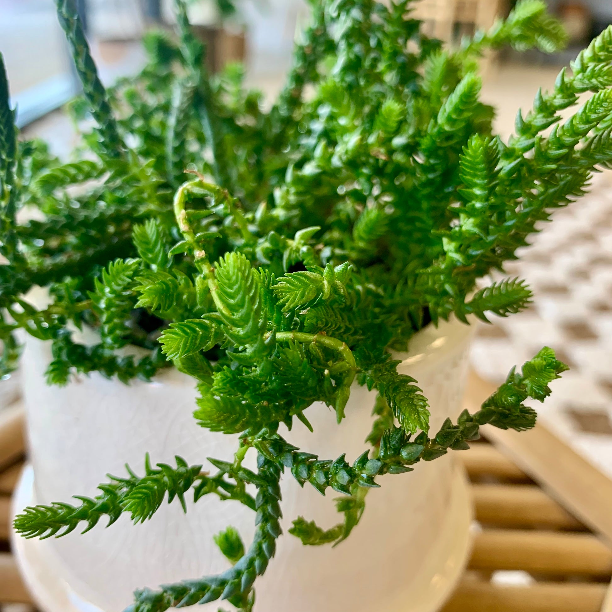 Crassula Muscosa is an interesting succulent that grows up to 12 inches tall with a spreading habit of branching stems with tightly overlapping, stacked, narrow, light green leaves that entirely hide the stems. The stems start erect but then trail over from the weight of the leaves.
