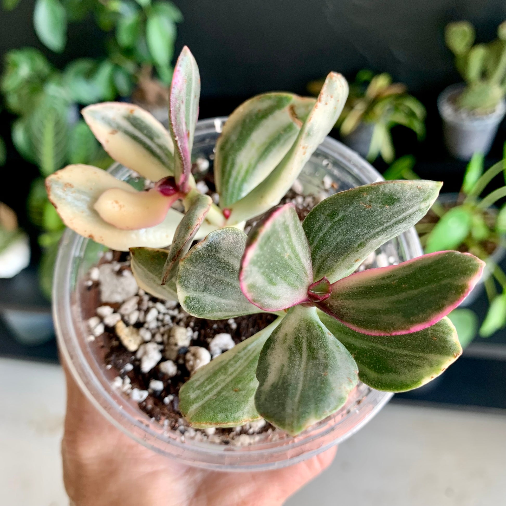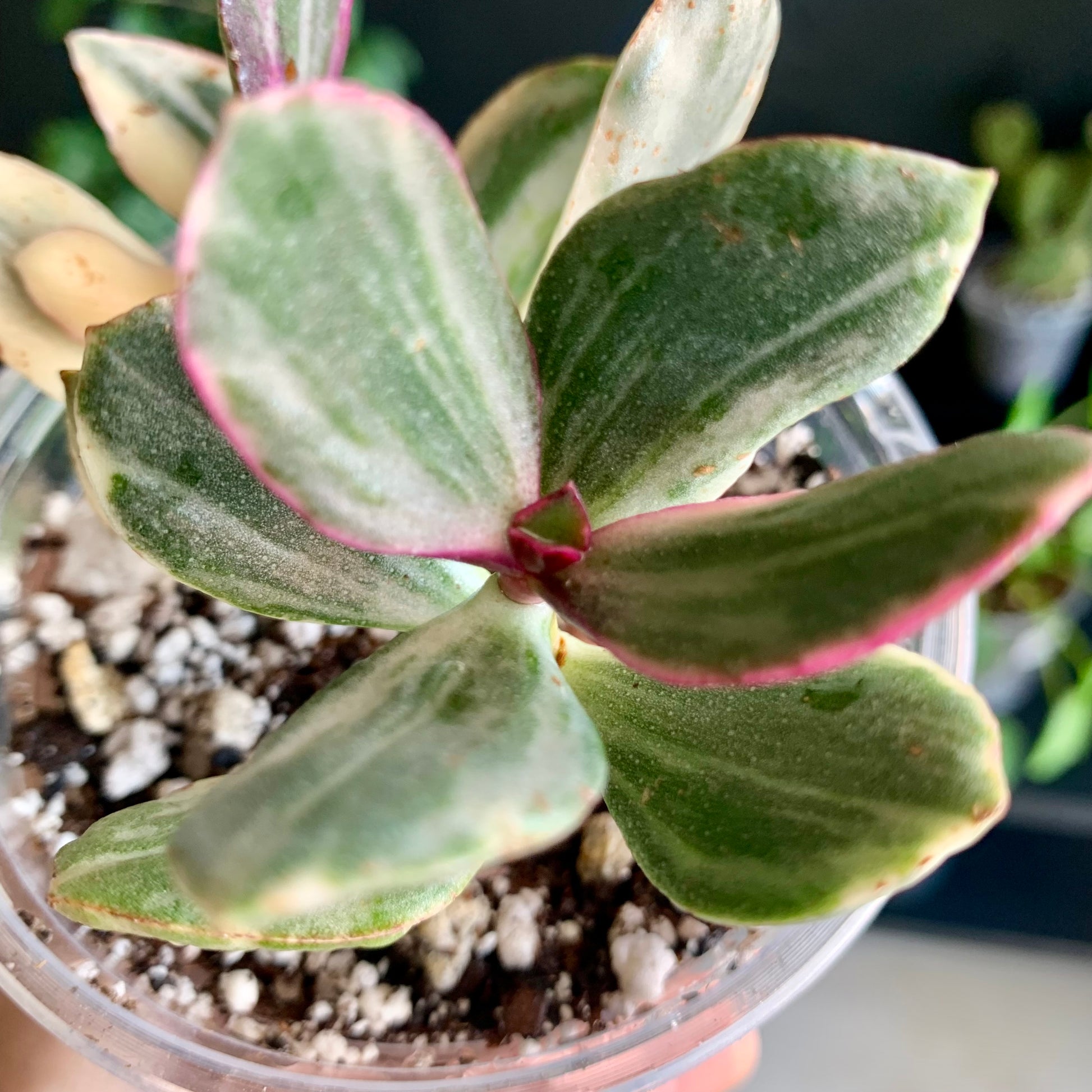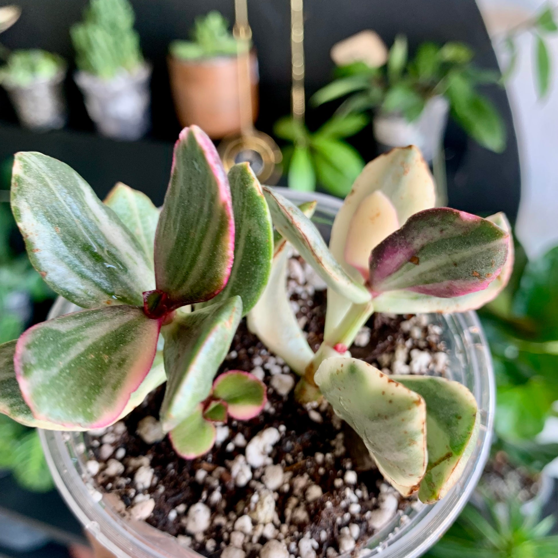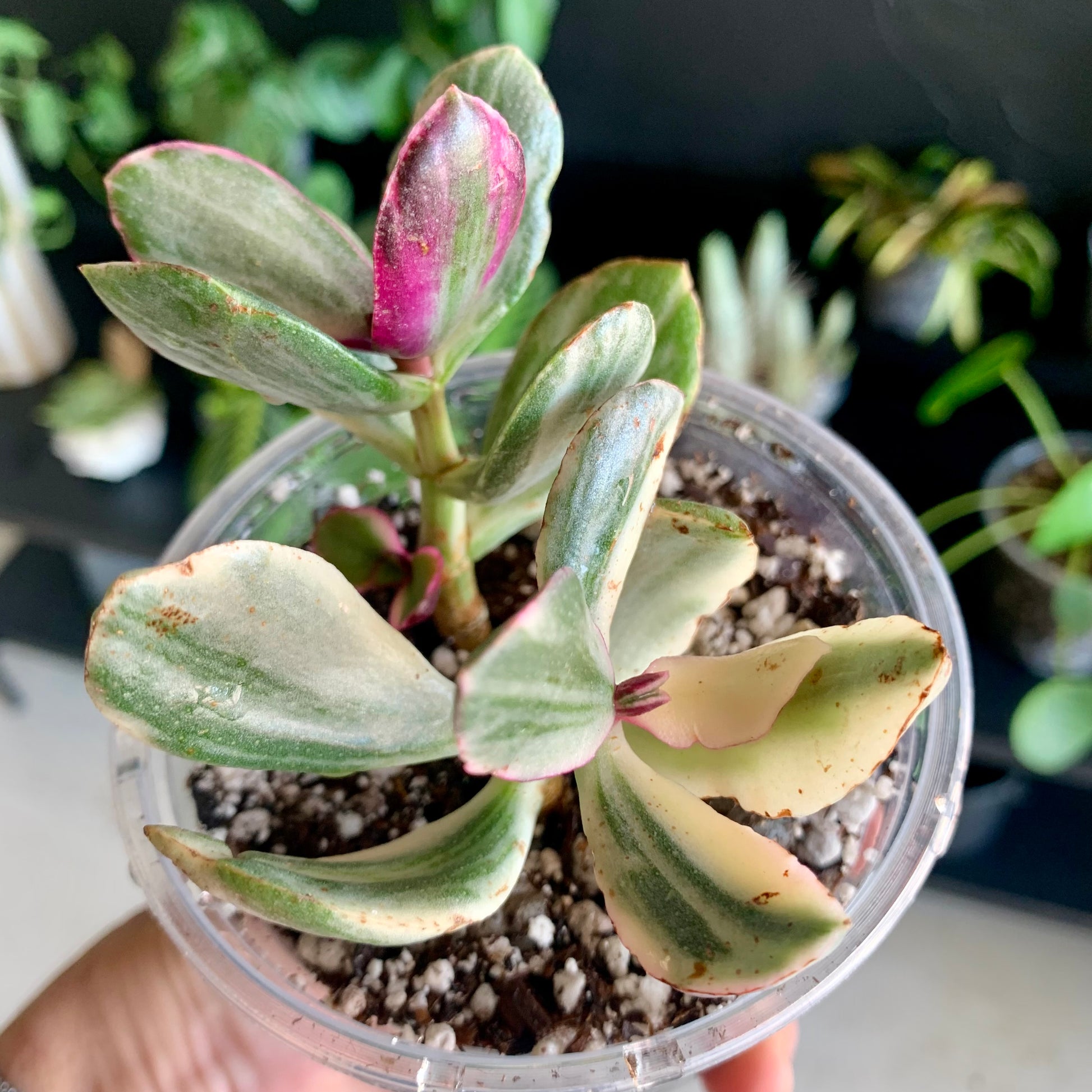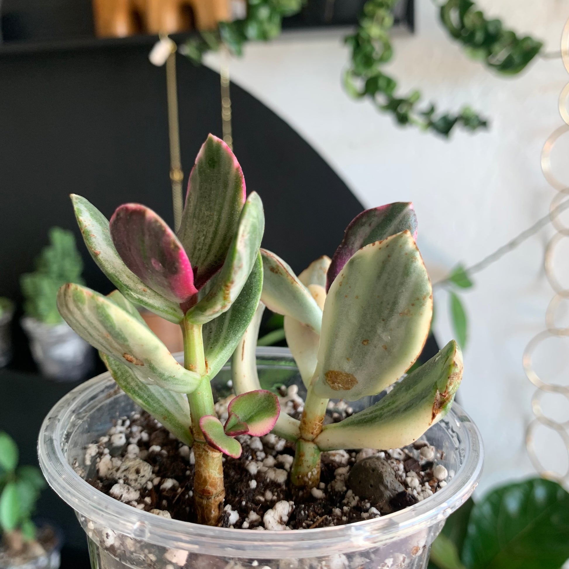 The Jade Plant Tricolor (Crassula Ovata Tricolor) a stunning succulent featuring green leaves with creamy-white or pale yellow markings that turn pink in the sunlight. With thick, fleshy leaves/