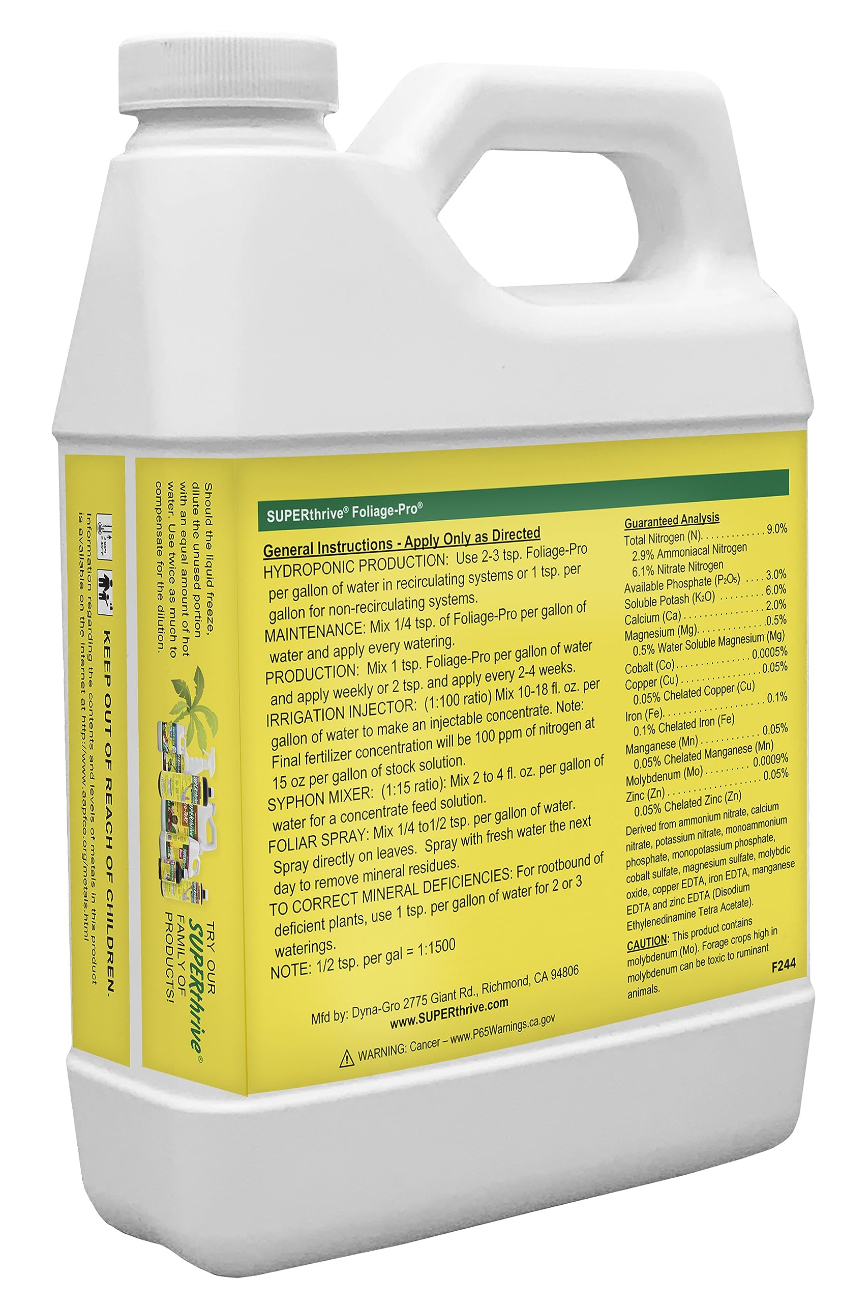 SUPERthrive Foliage-Pro 9-3-6 is a complete nutrition formula that has all 6 essential macronutrients and all 10 essential micronutrients required by plants for optimum growth in any medium. Great for semi-hydroponics and hydroponics.