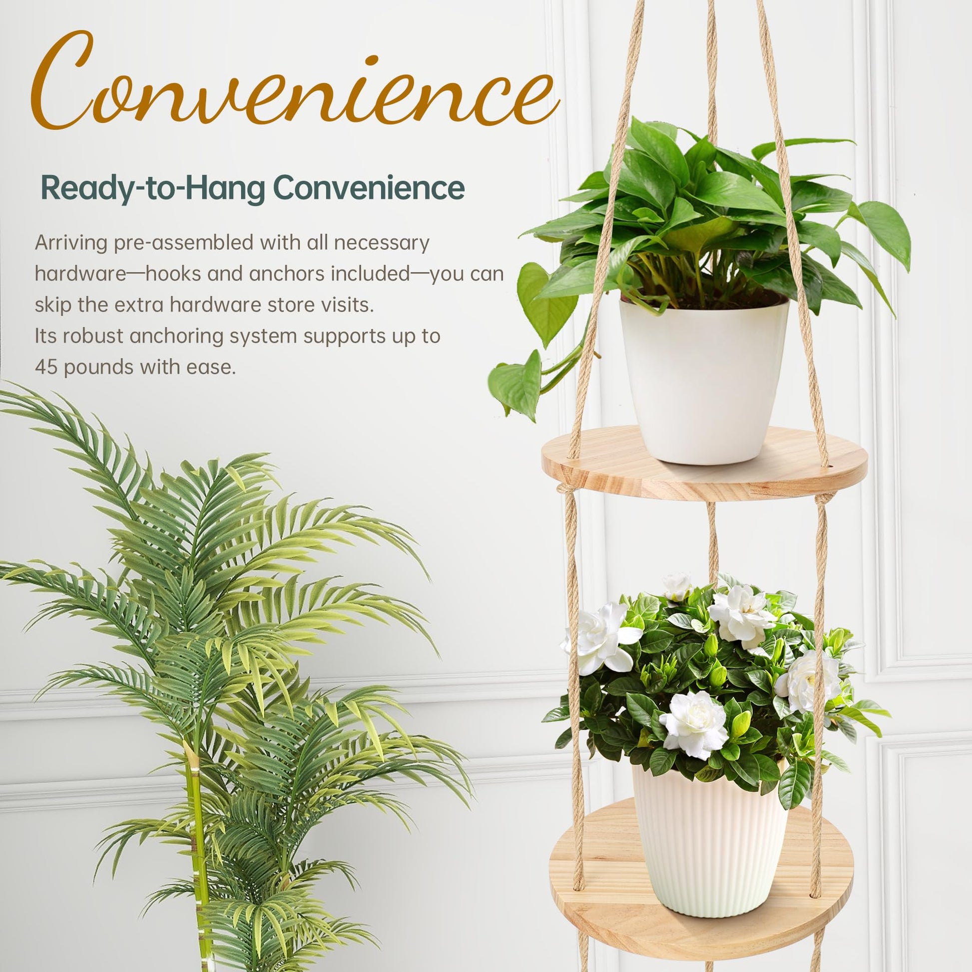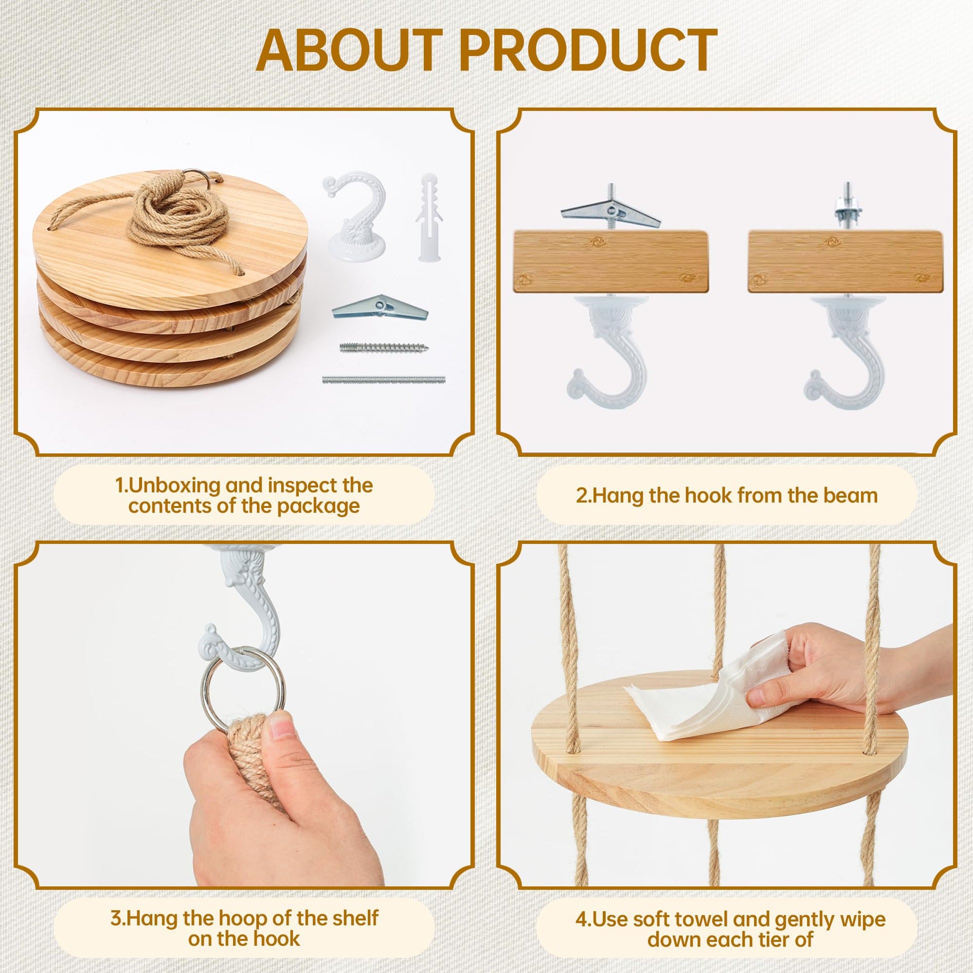 - 【 Premium Quality Materials】 Crafted from durable 4mm natrul jute rope and solid wood (11.8" diameter, 3/5"" thick), this shelf features a waterproof, natural varnish finish for easy maintenance. Its spacious tiers are perfect for displaying a variety of items , from potted plants and candles to picture frames and collectibles.