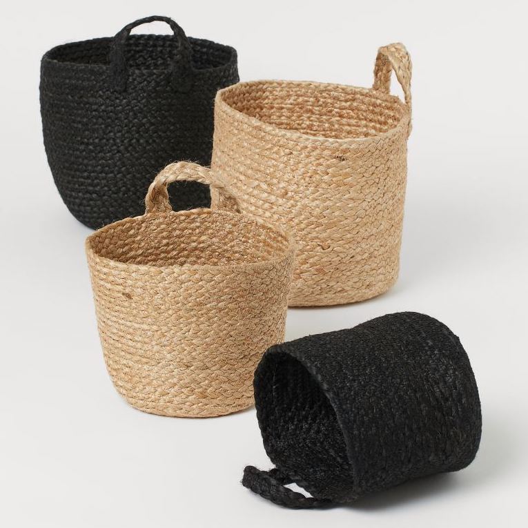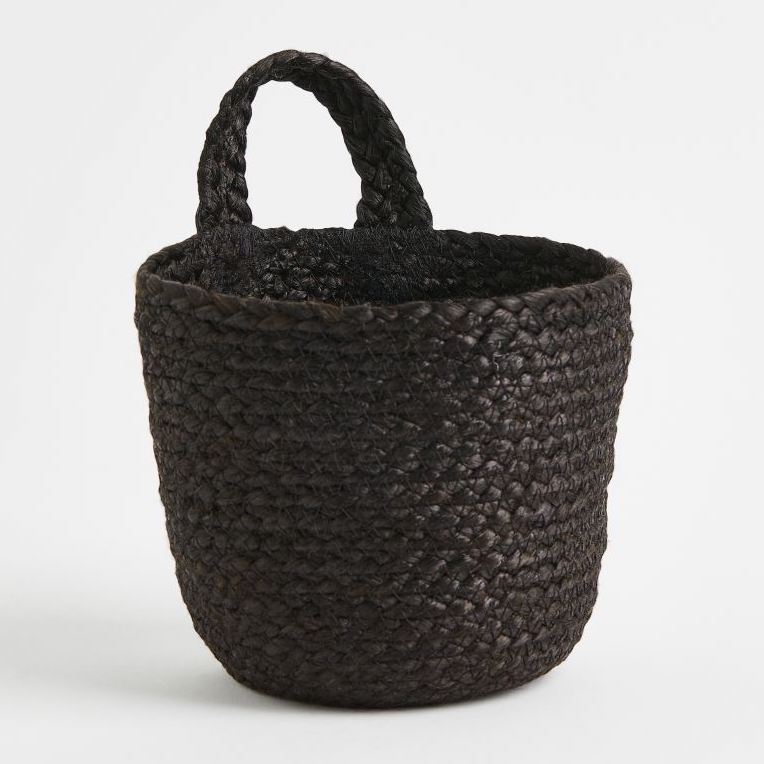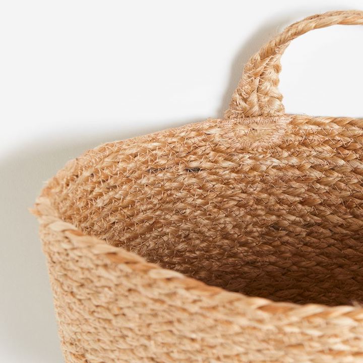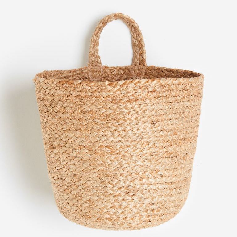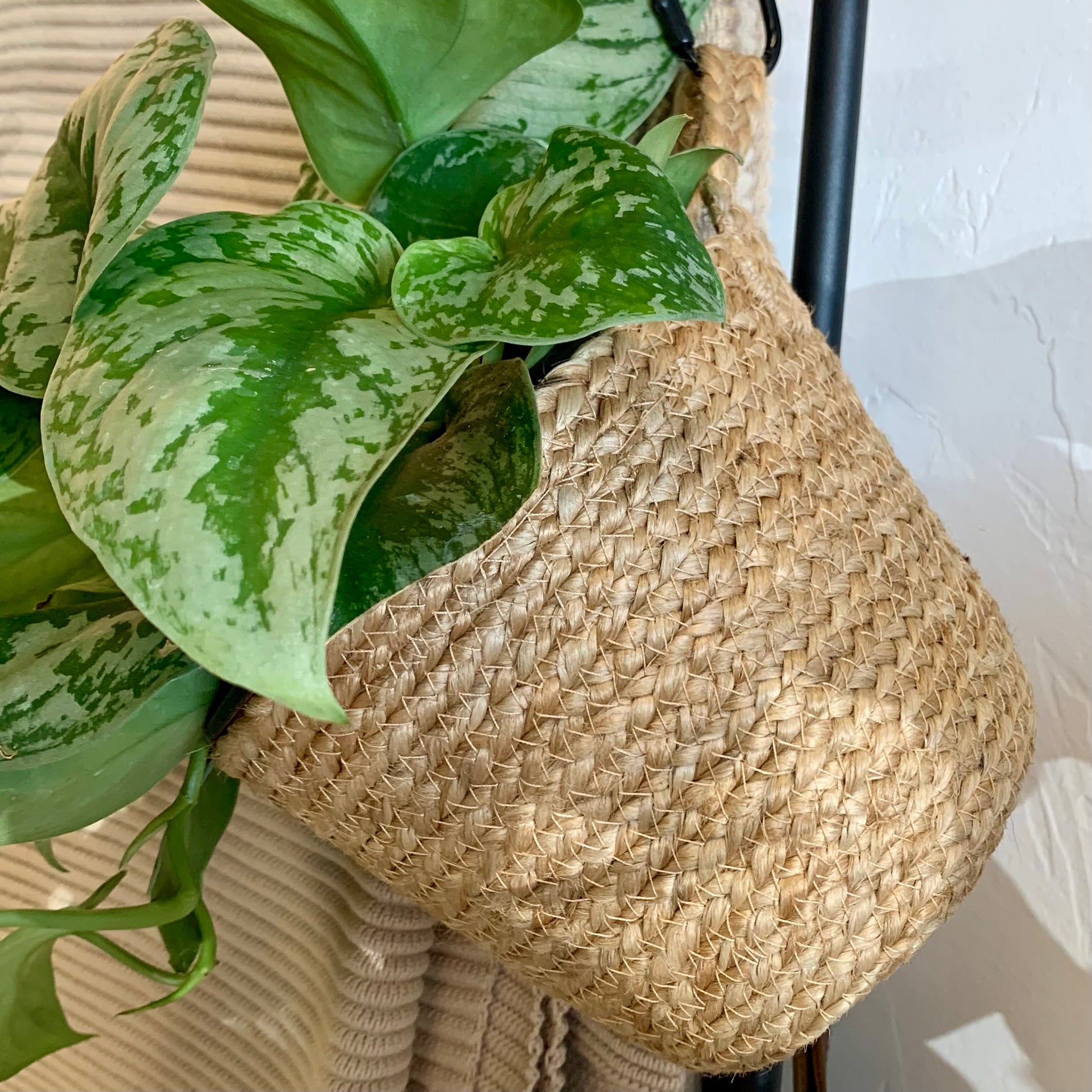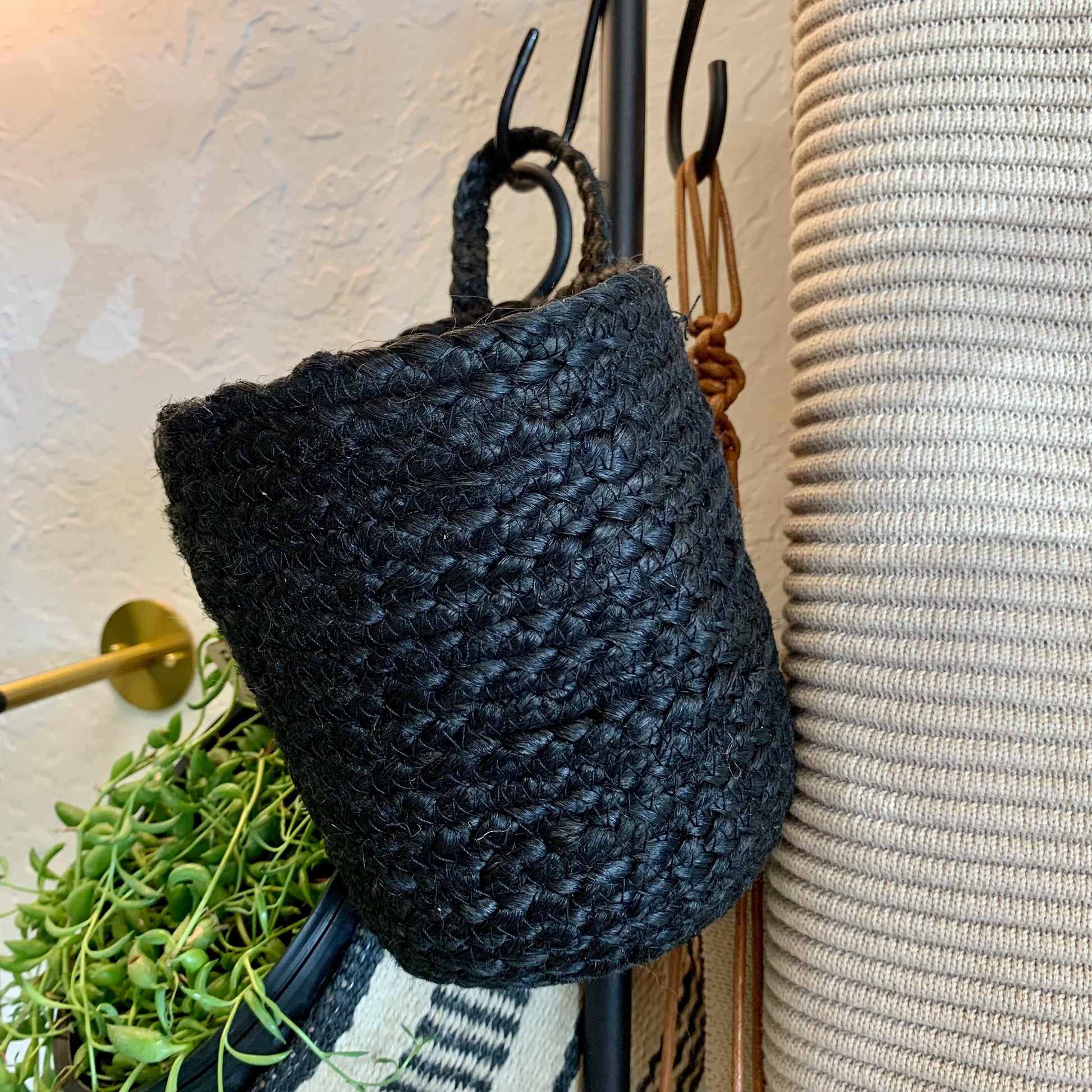 Handmade storage basket in braided jute to hang on a wall. Great for plants! Loop at top for hanging.