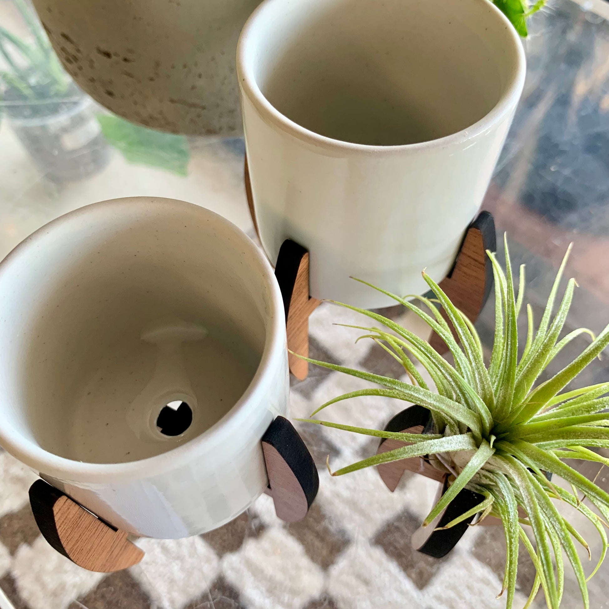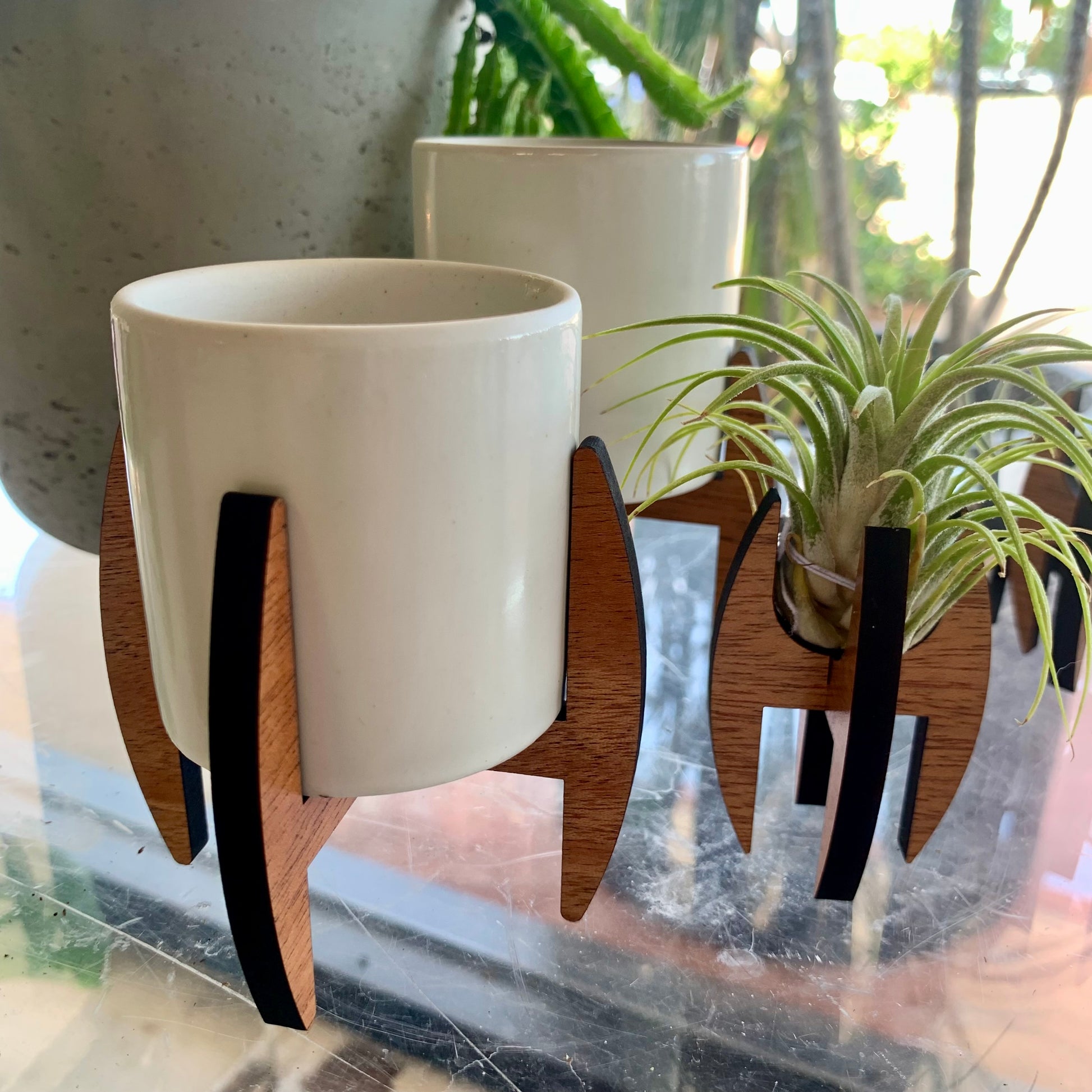 This charming and practical mini ceramic planter features a mid-century inspired design. The 2-inch plant pot is ideal for succulents, cacti, and air plants. The plant stand is crafted from beautiful mahogany wood and can be reversed to create two different heights and styles, adding a touch of mid-century modern flair to any space.