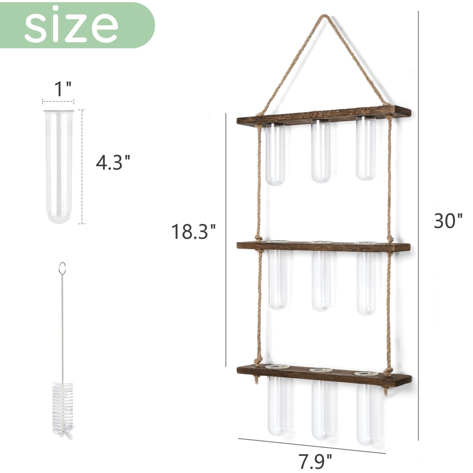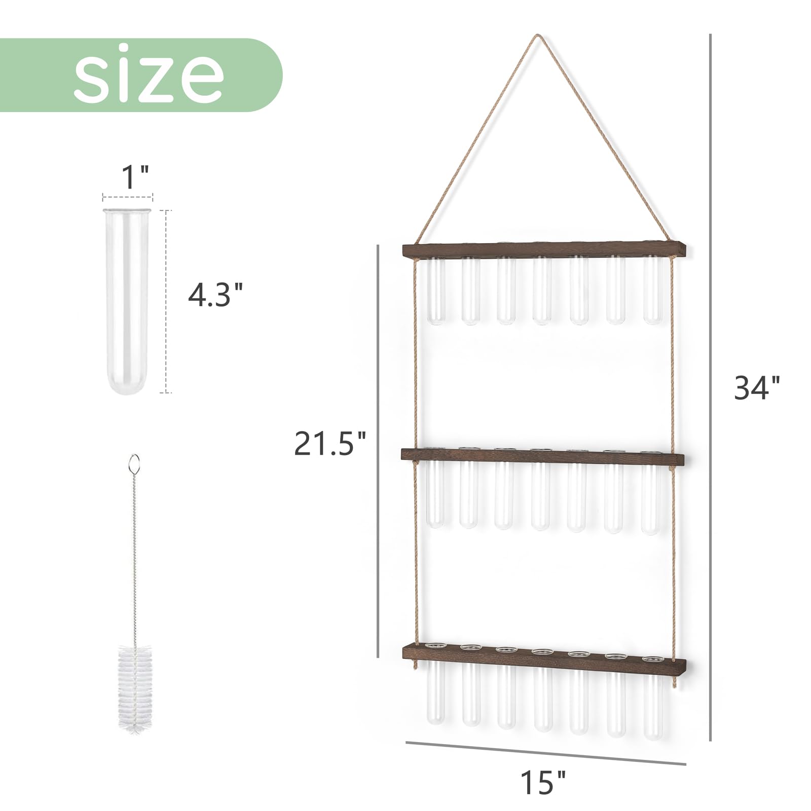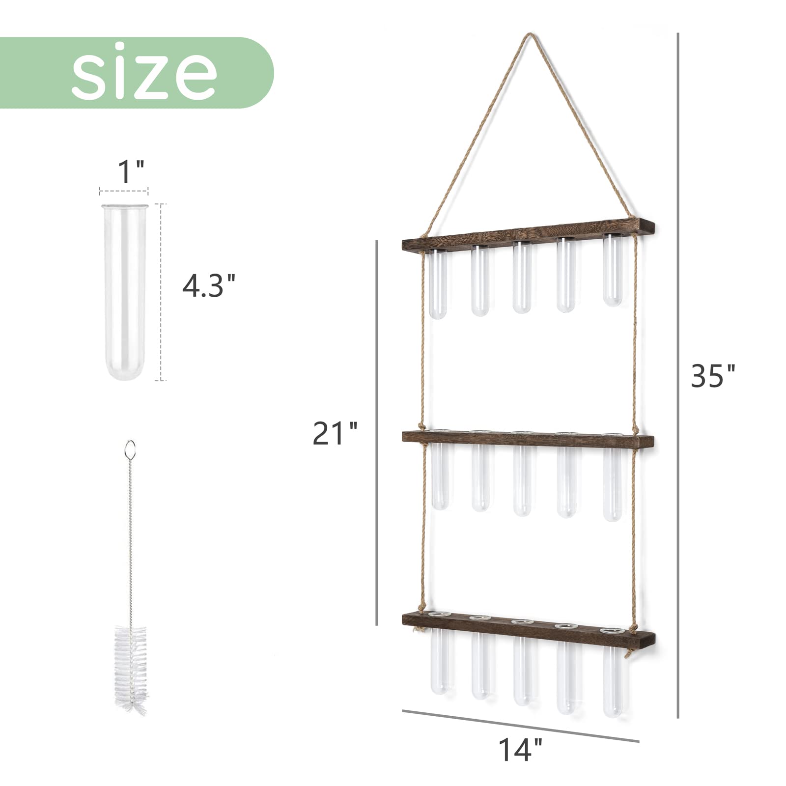 - Size: Wooden holder: 14.2'' L X 1.8'' W X 0.6'' H; the height between the two wooden holder is 9.7'', total height is 35'', Test tube: diameter is 1'', height is 4.3''. The test tube glass planter can be easily removed to change water or clean. Note: No plants or props included in this item!