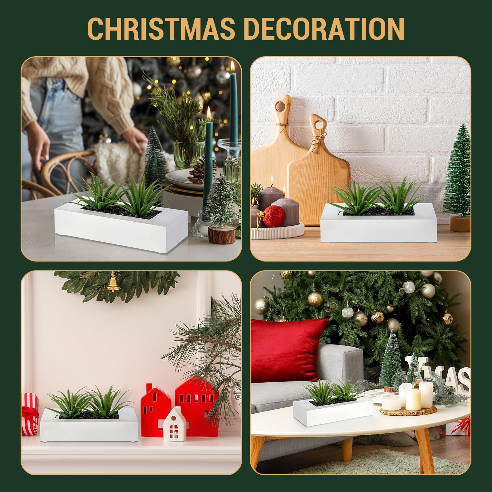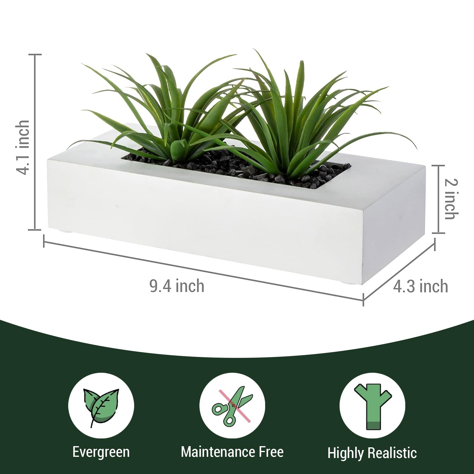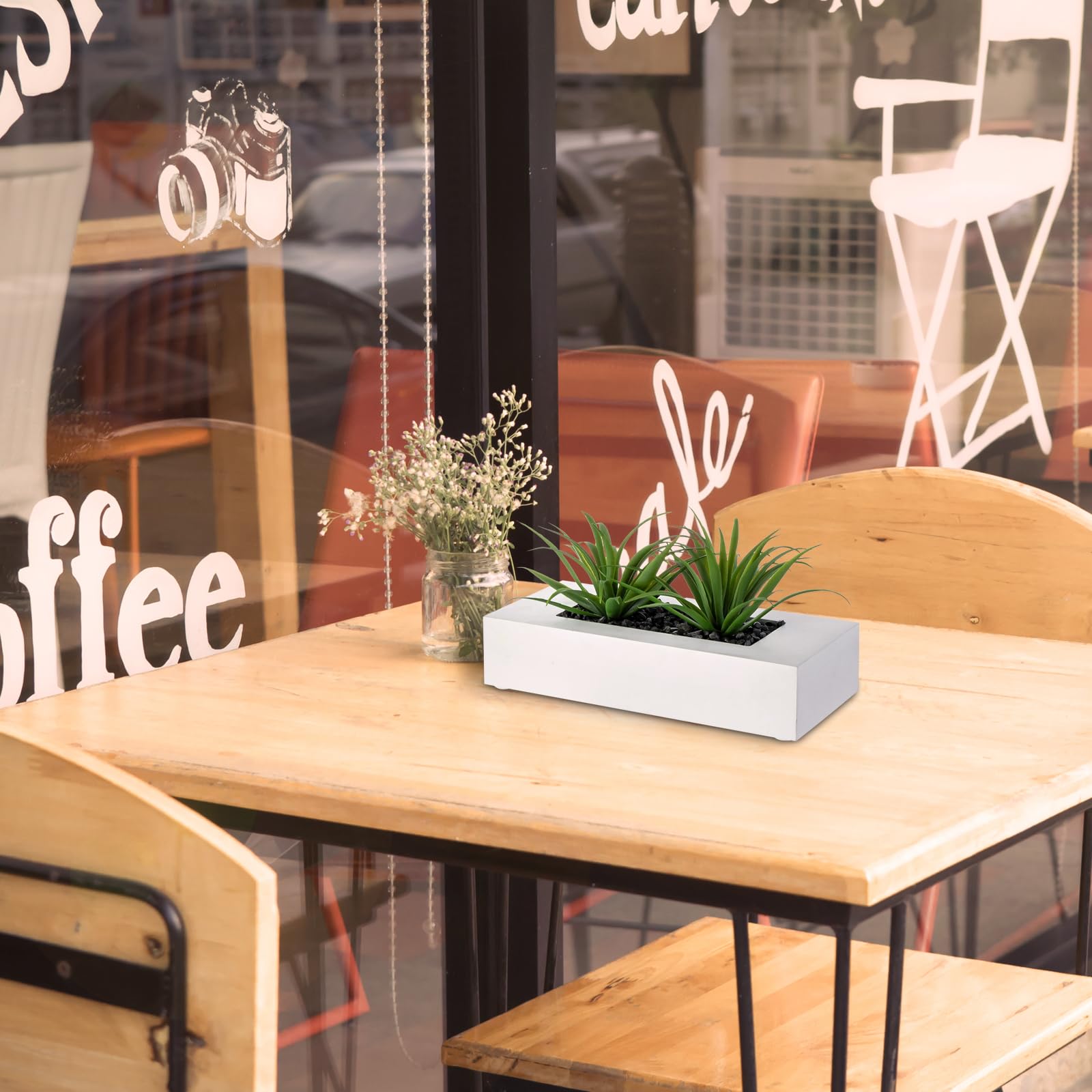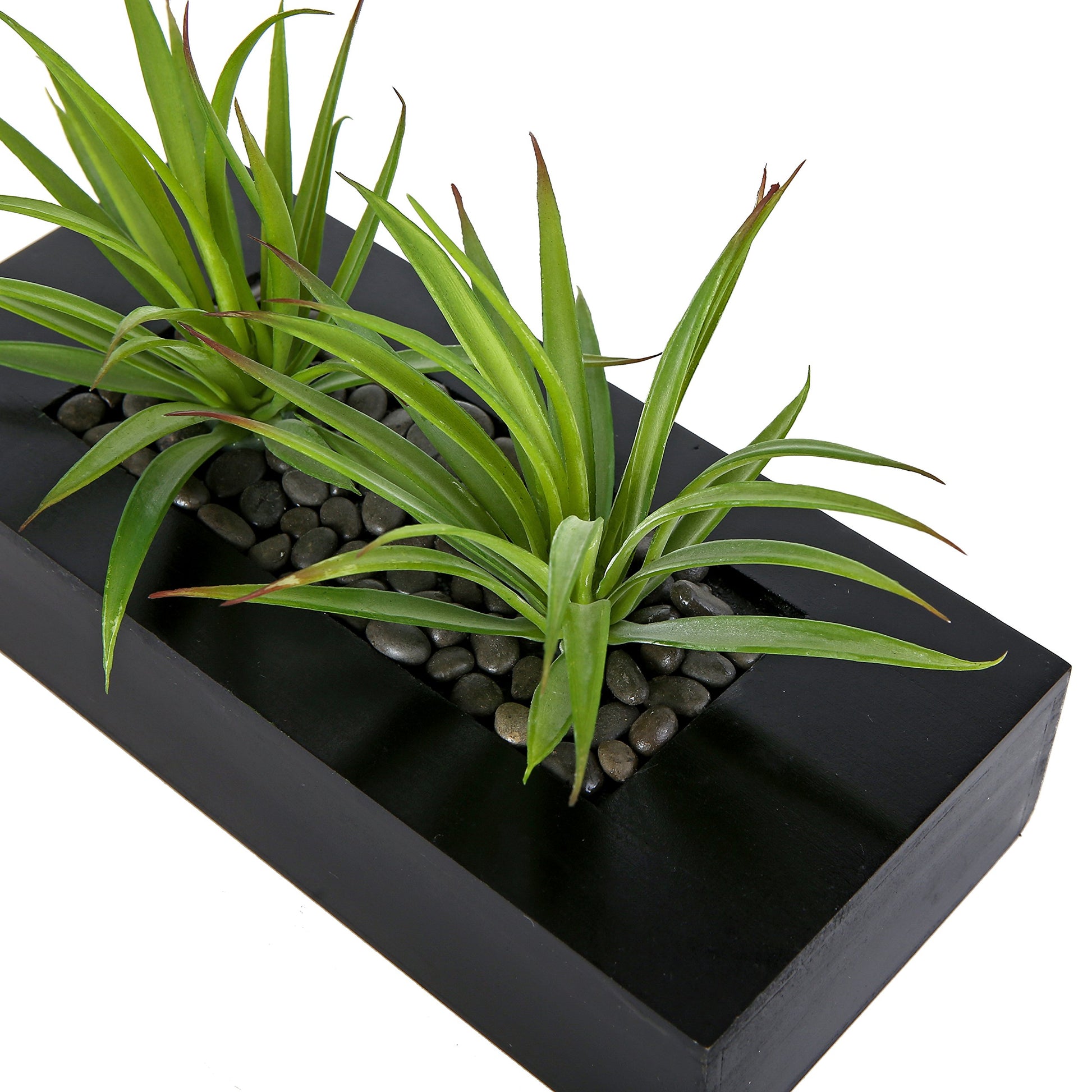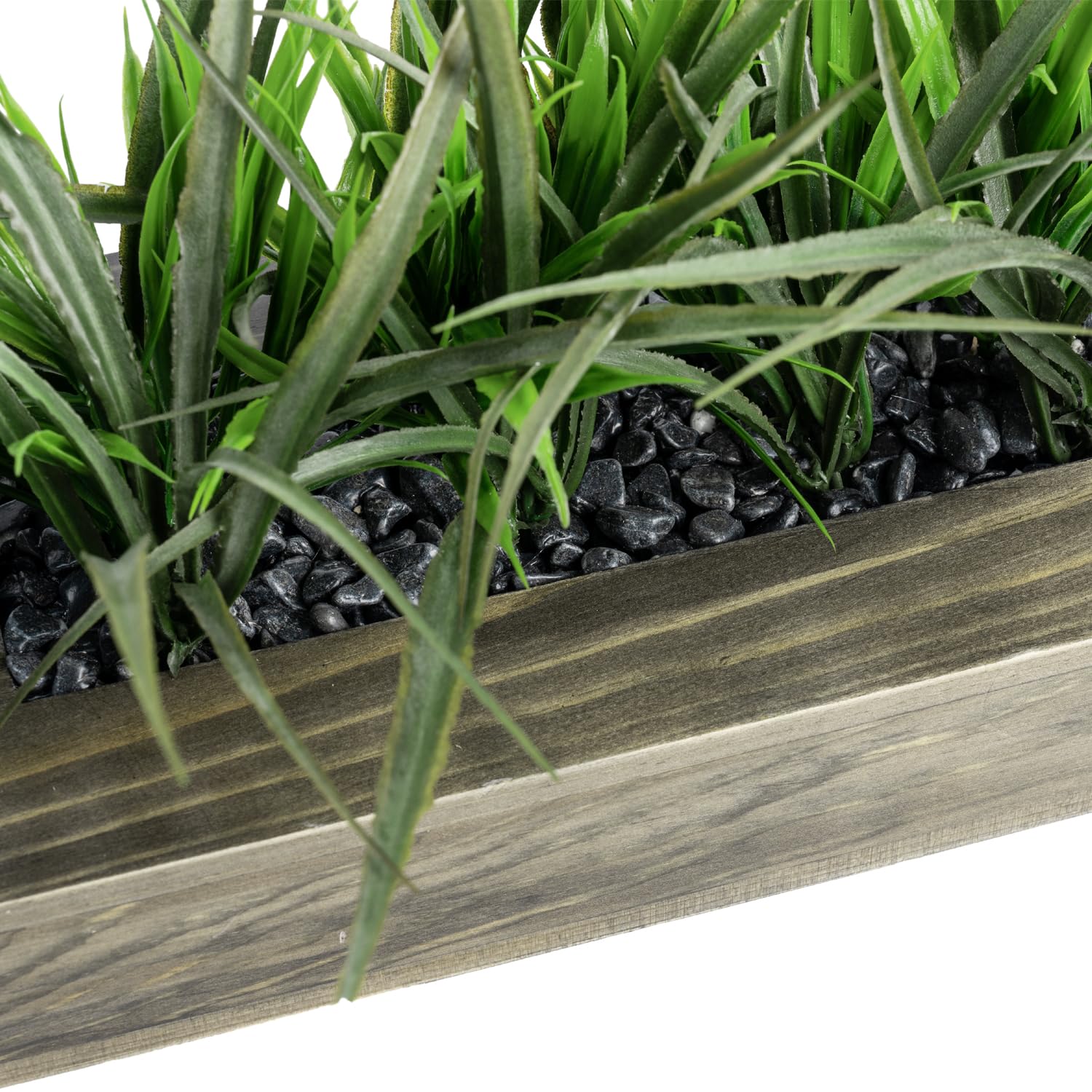 - Two sprouts of artificial green grass plants potted with small pebbles in a white wood planter box has a realistic look