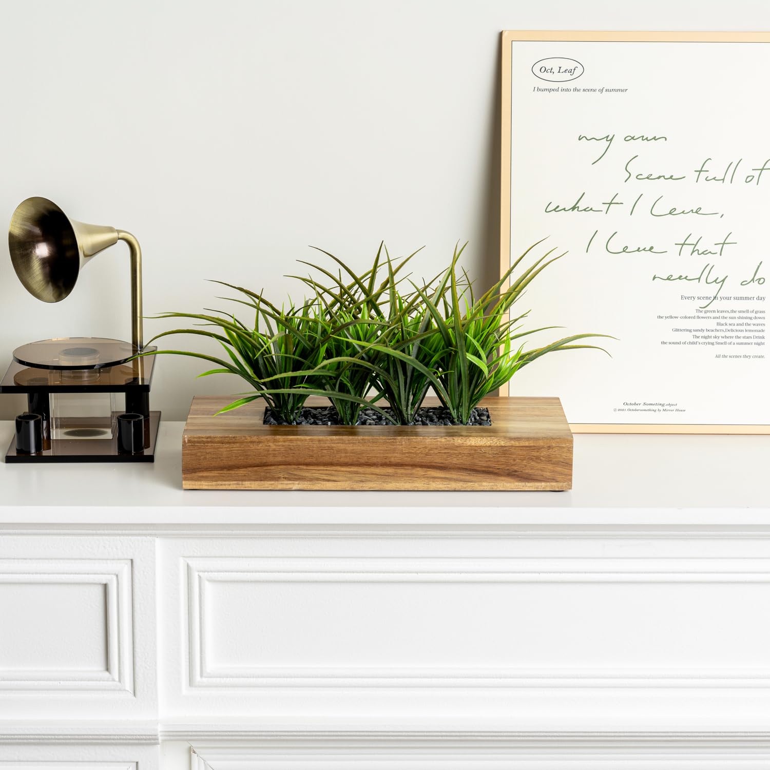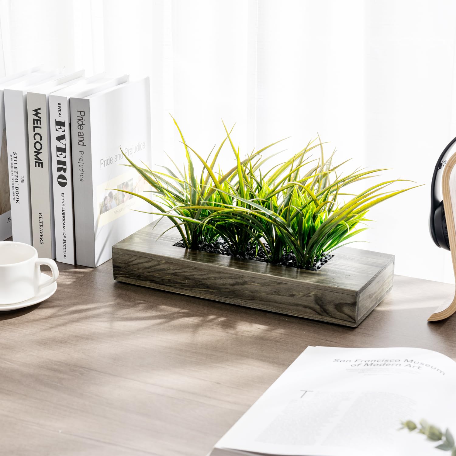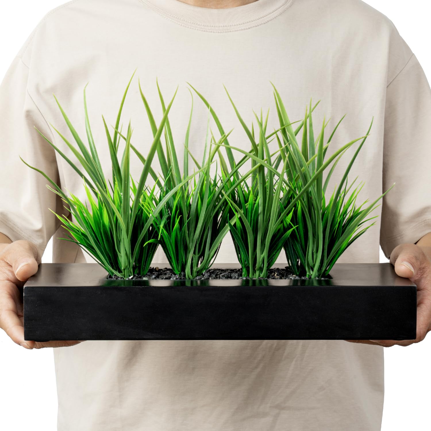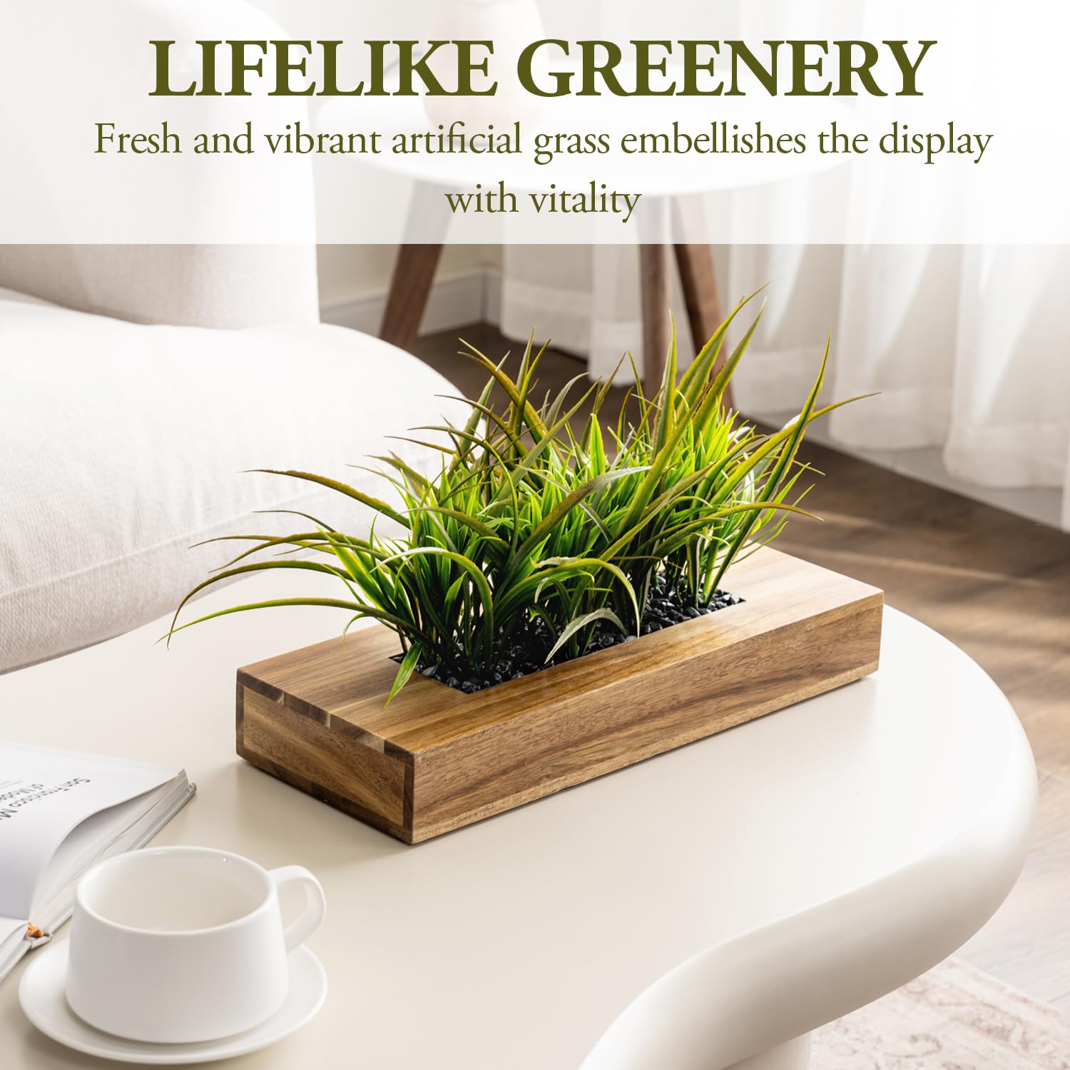 - artificial fake faux grass plants indoor in rectangular wood pots; home house bathroom coffee table shelf office desk decor decorations