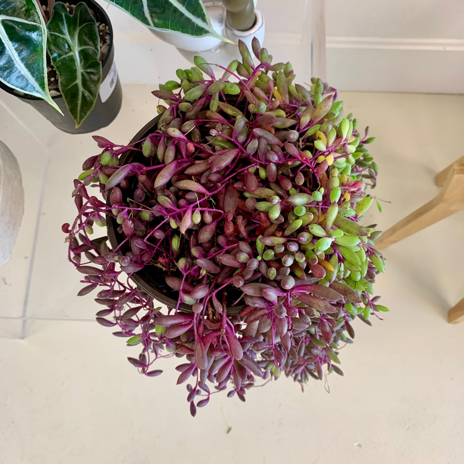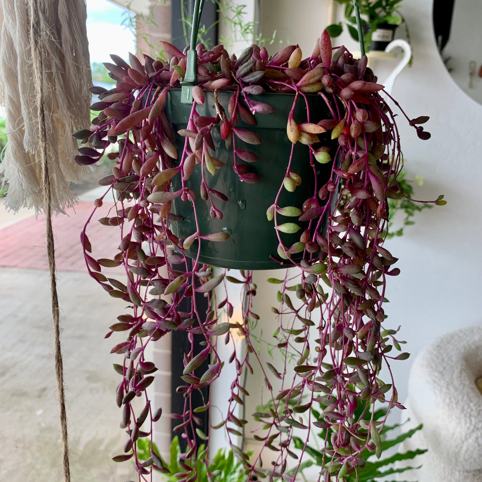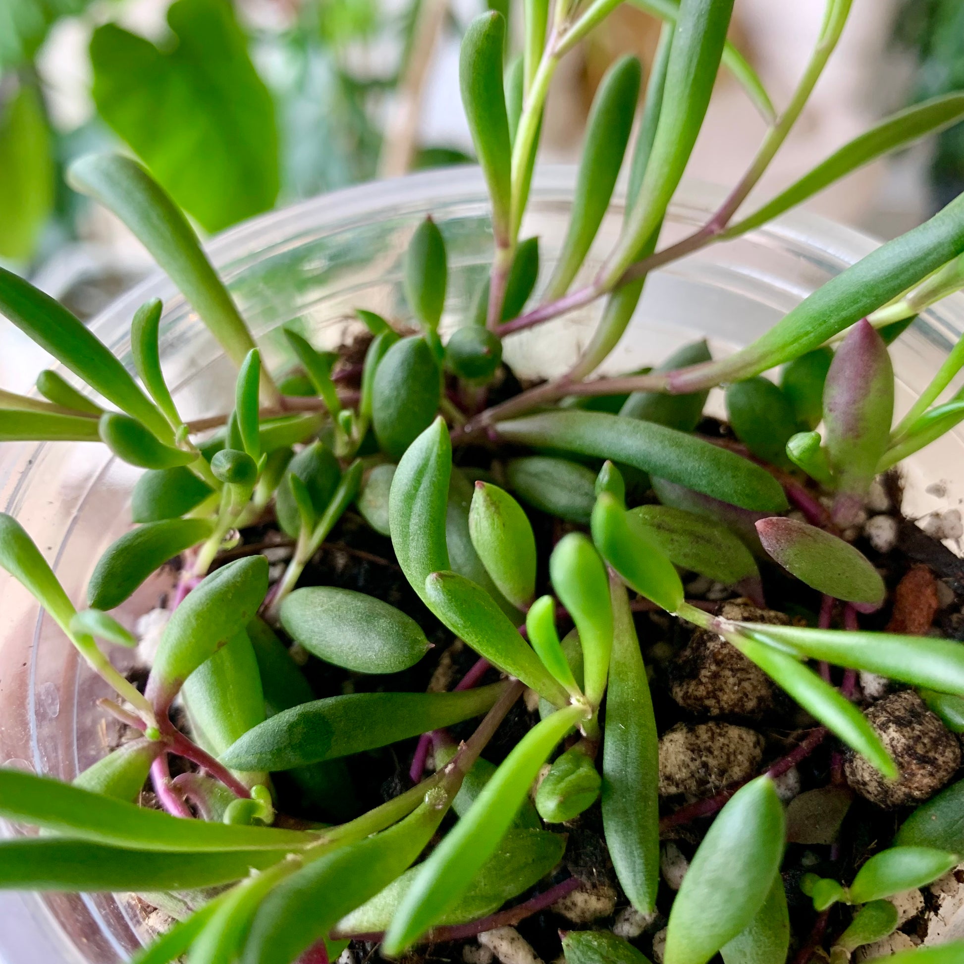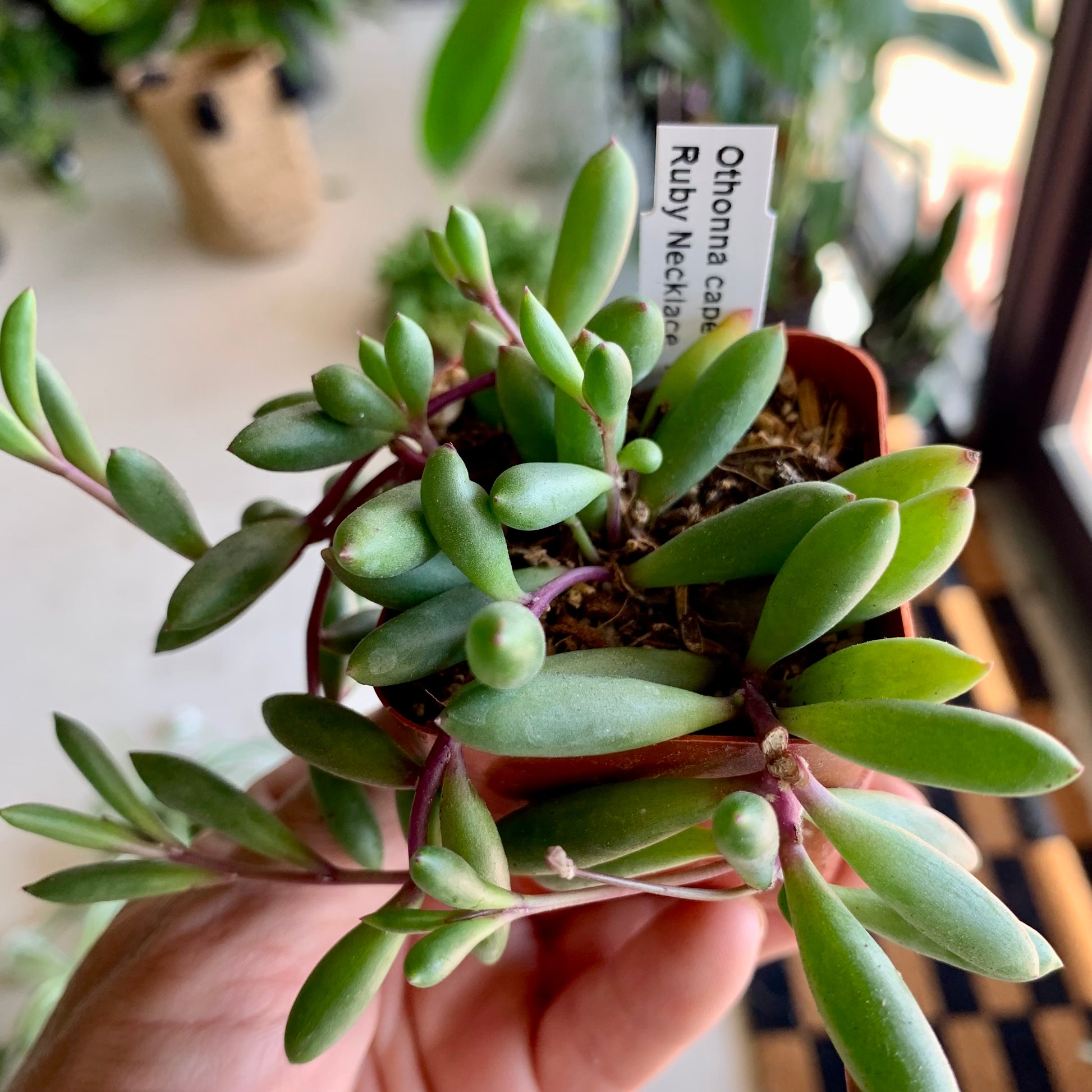 'Ruby Necklace' (Othonna capensis): An eye-catcher of a trailing variety with pudgy, bean-shaped leaves that hang on stems up to 2.0' long. The whole plant can flush a striking shade of magenta when moderately stressed by direct sun, drought, or cool temperatures (around 50F). It grows fine, white tufts of fuzz in the crevices between stems and leaves (don't worry, it's not mealybug!). It produces small, yellow, daisy-like blooms and re-roots easily from stem cuttings.