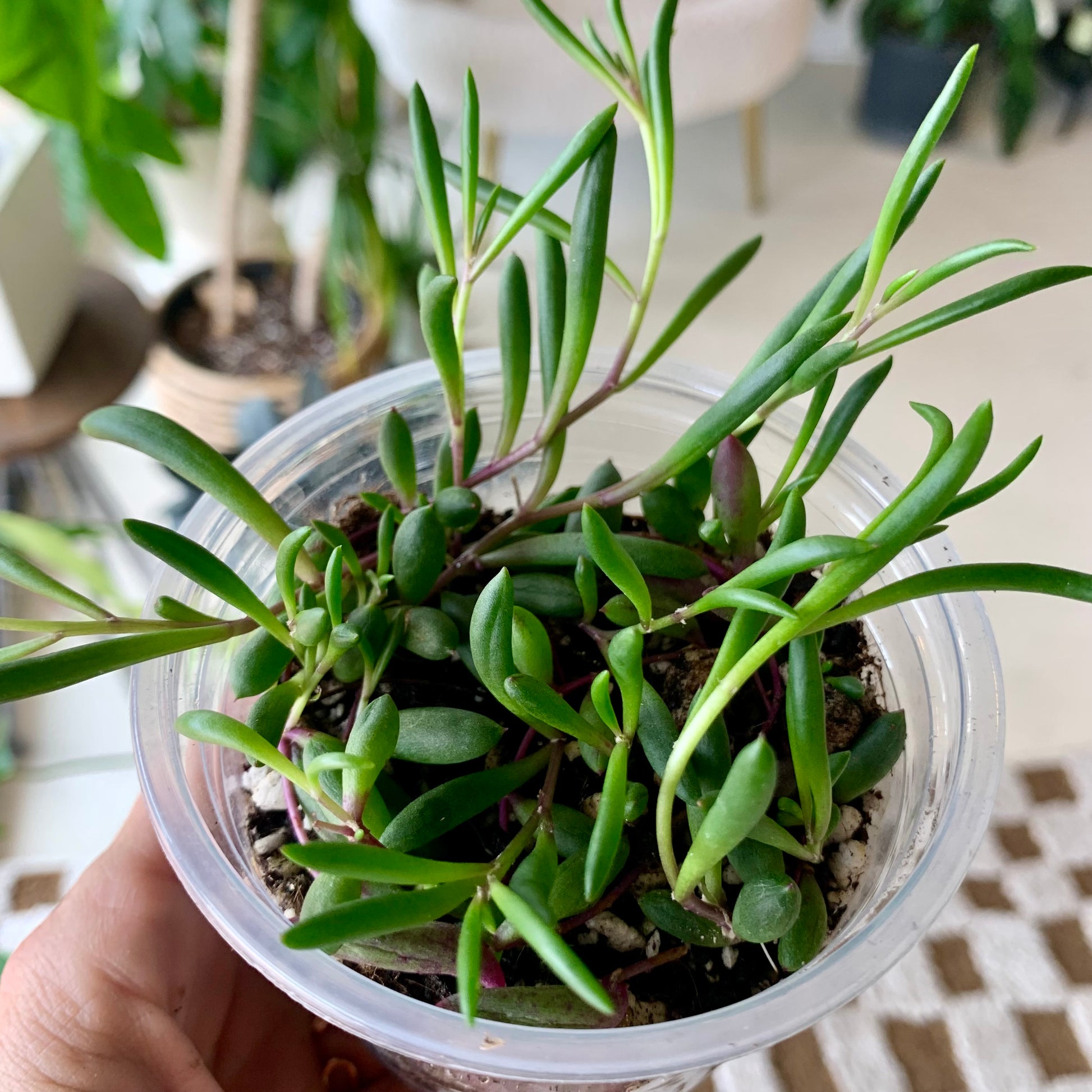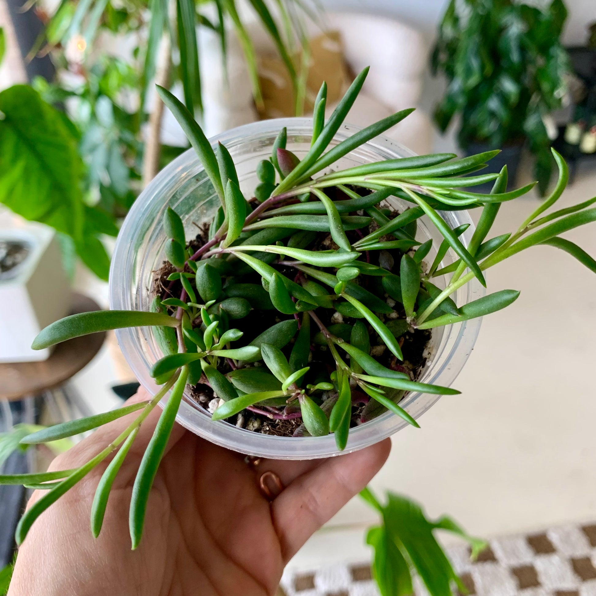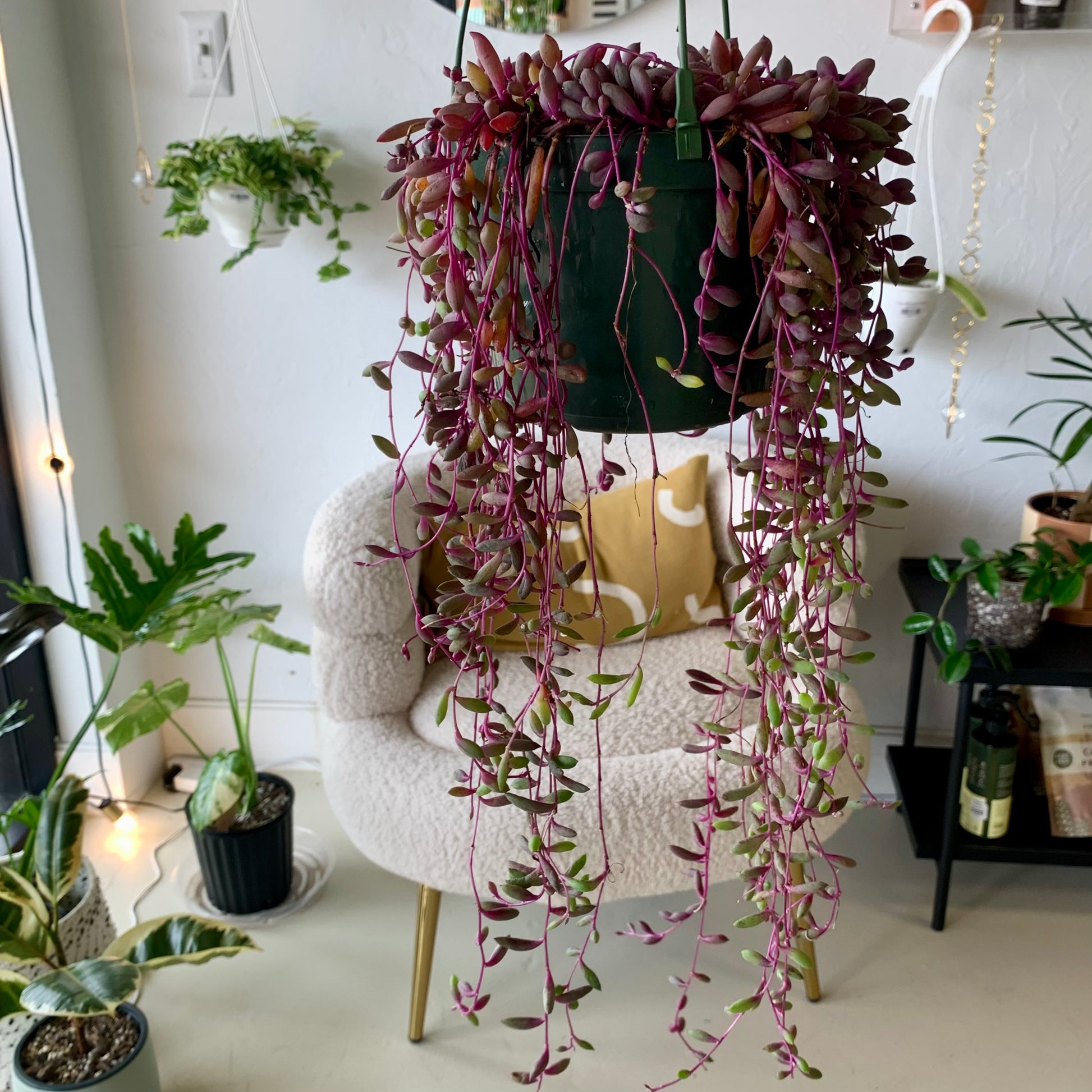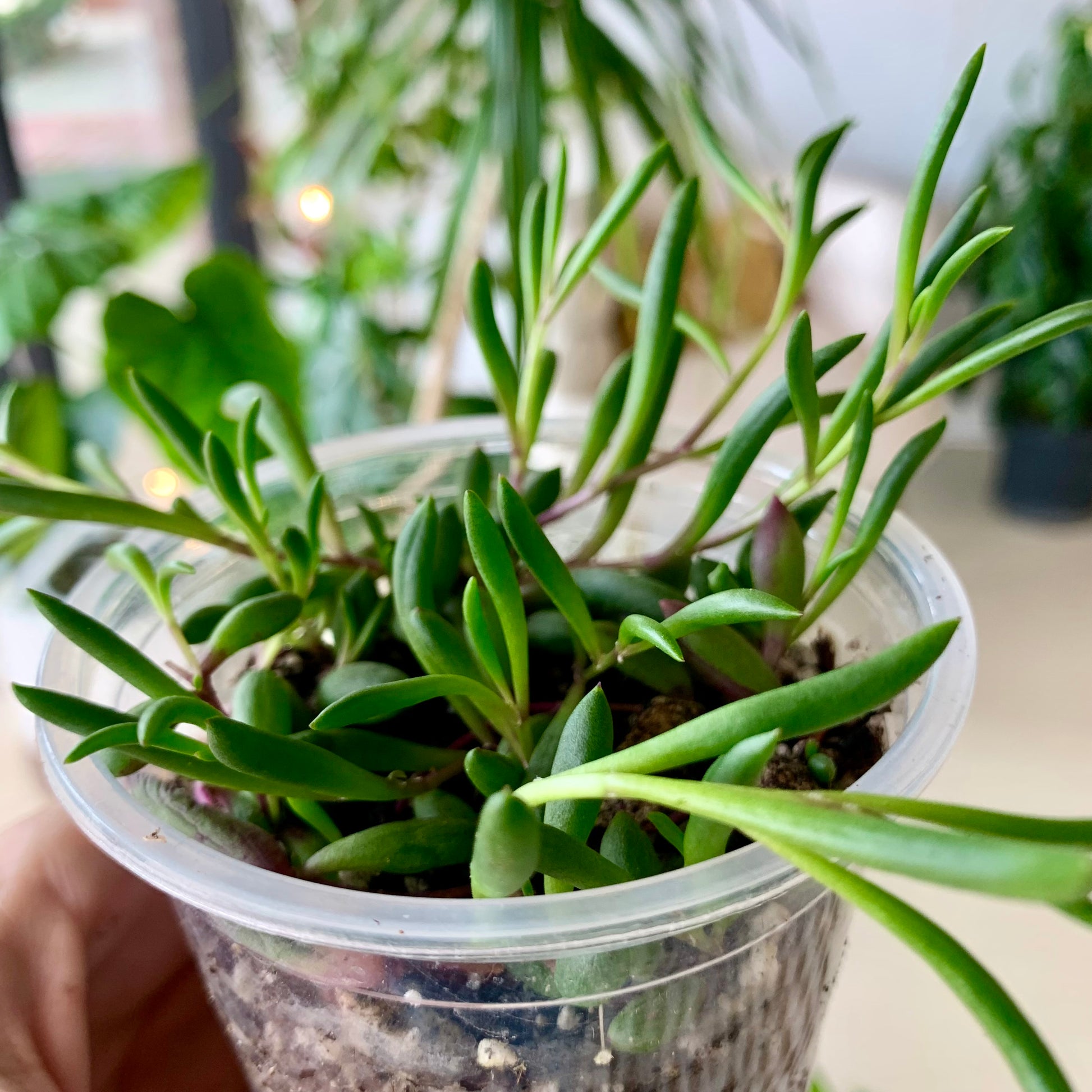 'Ruby Necklace' (Othonna capensis): An eye-catcher of a trailing variety with pudgy, bean-shaped leaves that hang on stems up to 2.0' long. The whole plant can flush a striking shade of magenta when moderately stressed by direct sun, drought, or cool temperatures (around 50F). It grows fine, white tufts of fuzz in the crevices between stems and leaves (don't worry, it's not mealybug!). It produces small, yellow, daisy-like blooms and re-roots easily from stem cuttings.