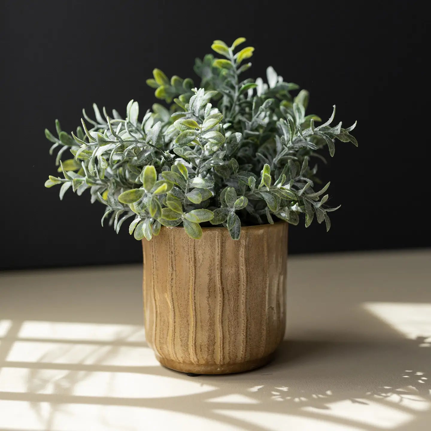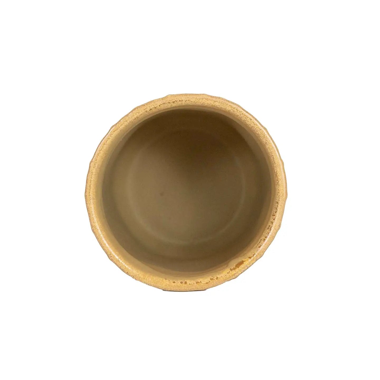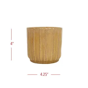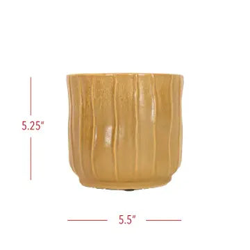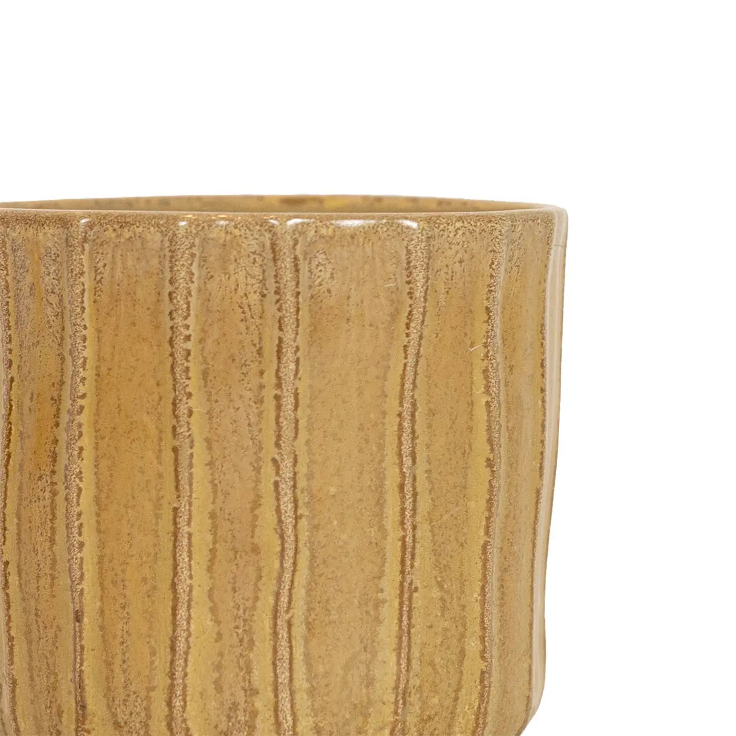 Rowena Wavy Ribbed Ceramic Planter - This beautiful ceramic pot will add the perfect earthy element to your decor. The rustic, ochre-brown reactive glaze enhances its artistic and organic ribbed texture. Its warm gold tone finish pairs well with natural accents and elevates other decor with a unique and dimensional aesthetic. Create a charming home for your favorite plant, or simply add to a shelf for an eye-catching accent.