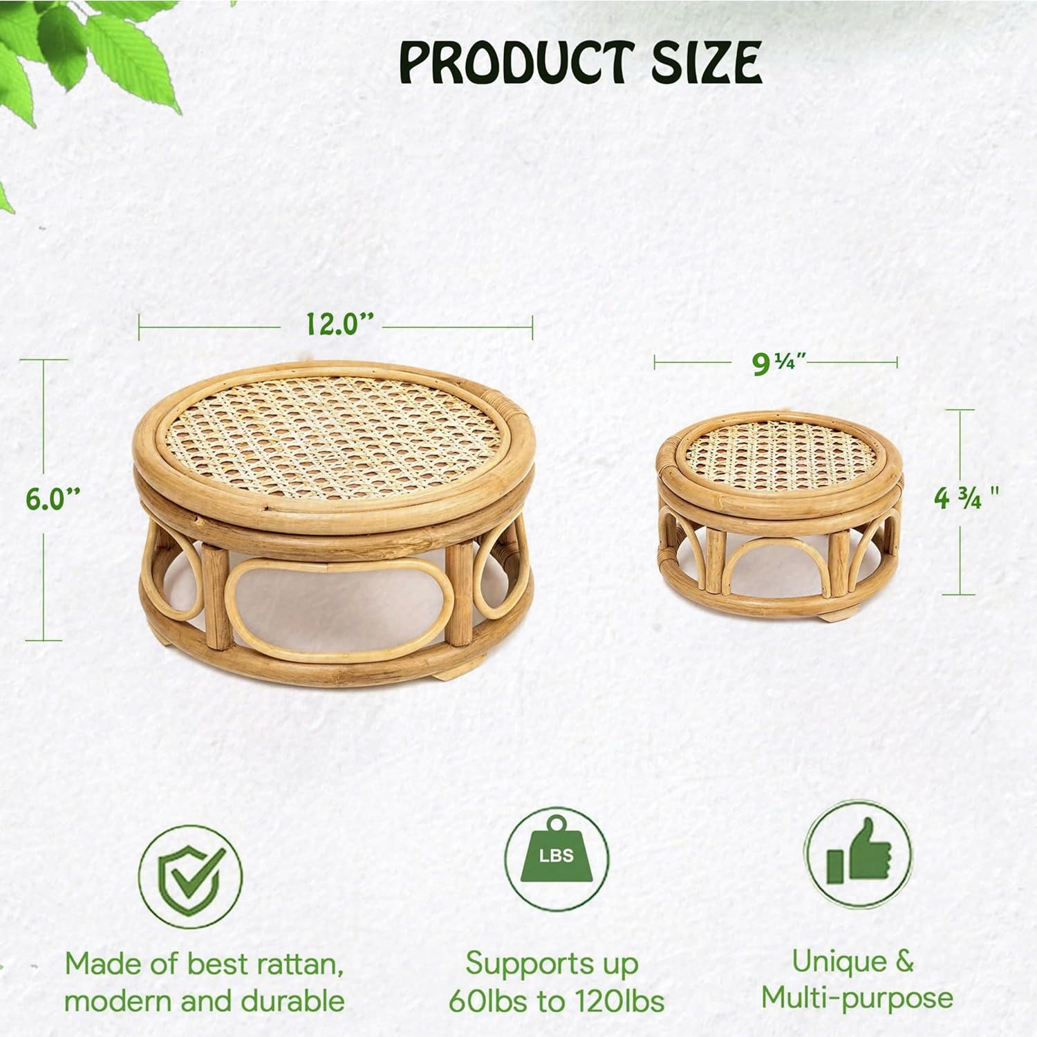 - 🎯 【COMPACT SIZE】: The small size rattan stool display stand is: 9½" × 4¾", and the large size of our stand is: 12.0" × 6.0". Perfect tabletop size for small spaces, featuring an elevated design that adds height to displayed items.