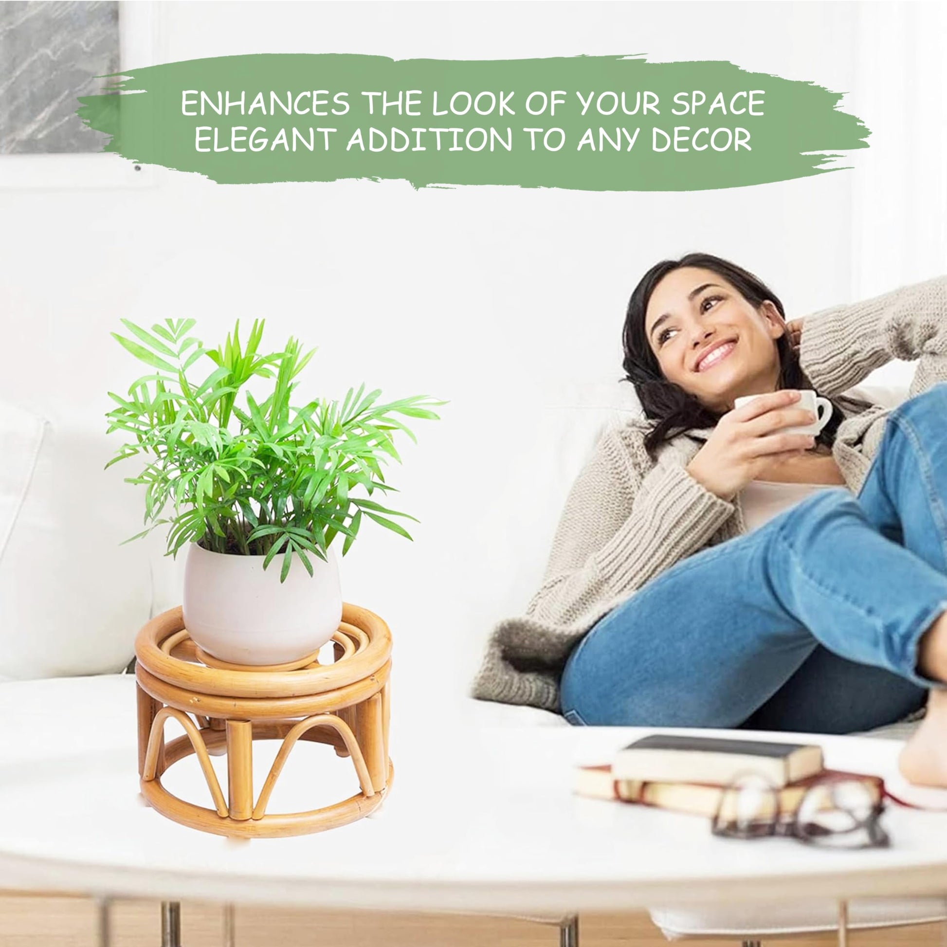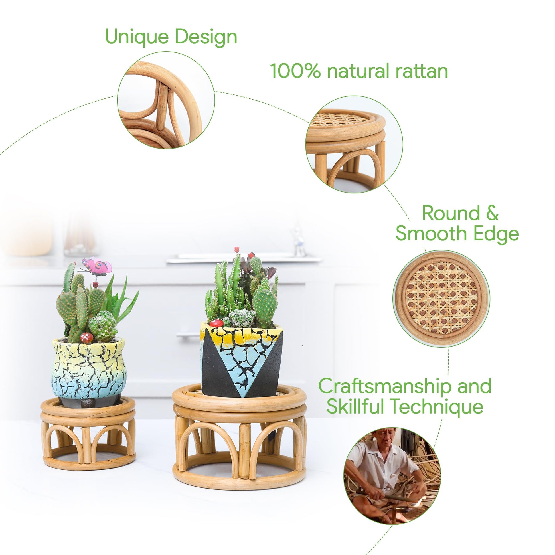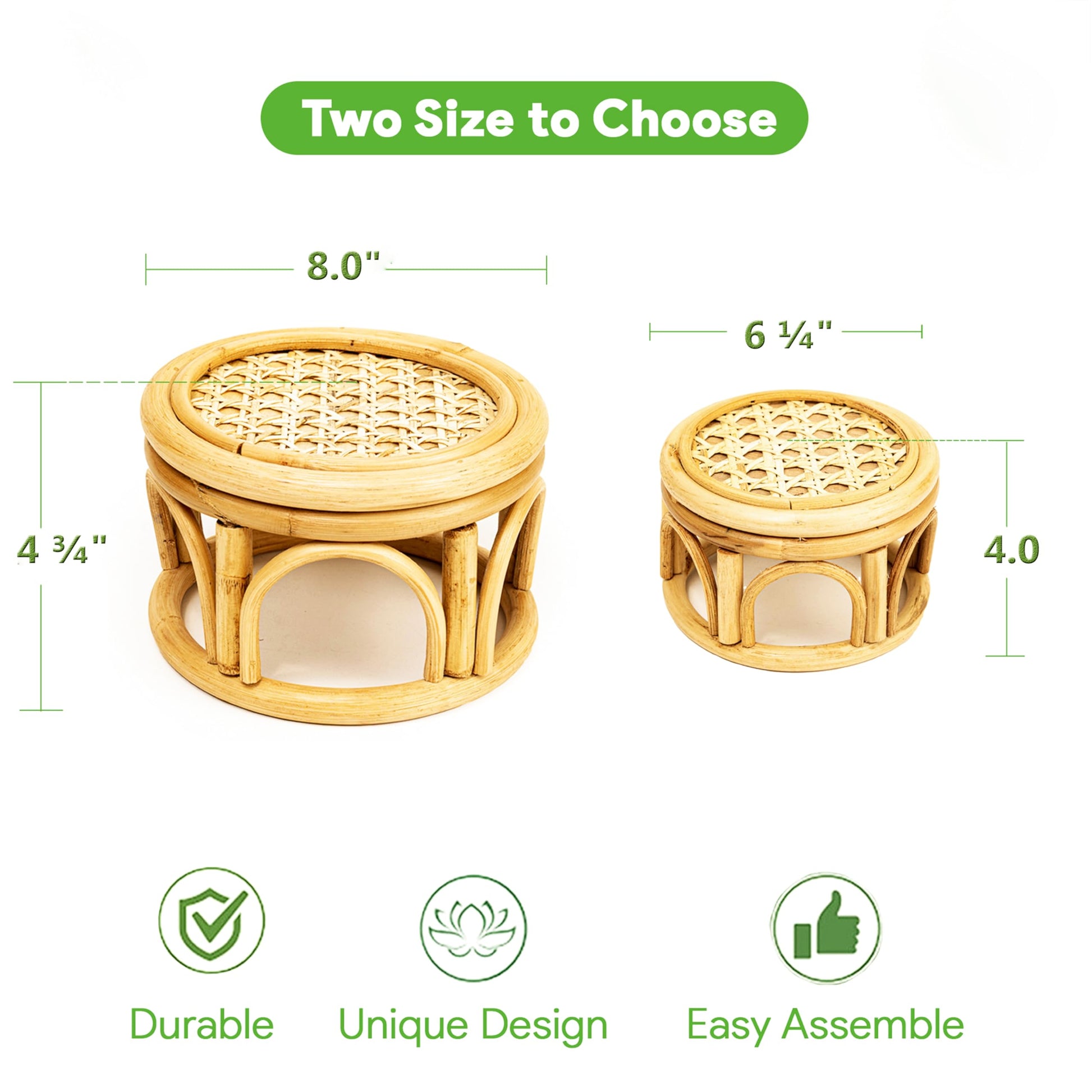 - ☘️ 【SUITABLE SIZE】: The mini size rattan stool display stand is: 6.0 × 4¼ inches, and the small size of our stand is: 8.0 × 4¾ inches. The wicker plant stand has sturdy and durable structure, its 5 thick stand points to firmly support the plant pot. Ideal for your flowerpots. Note: No flower pots !