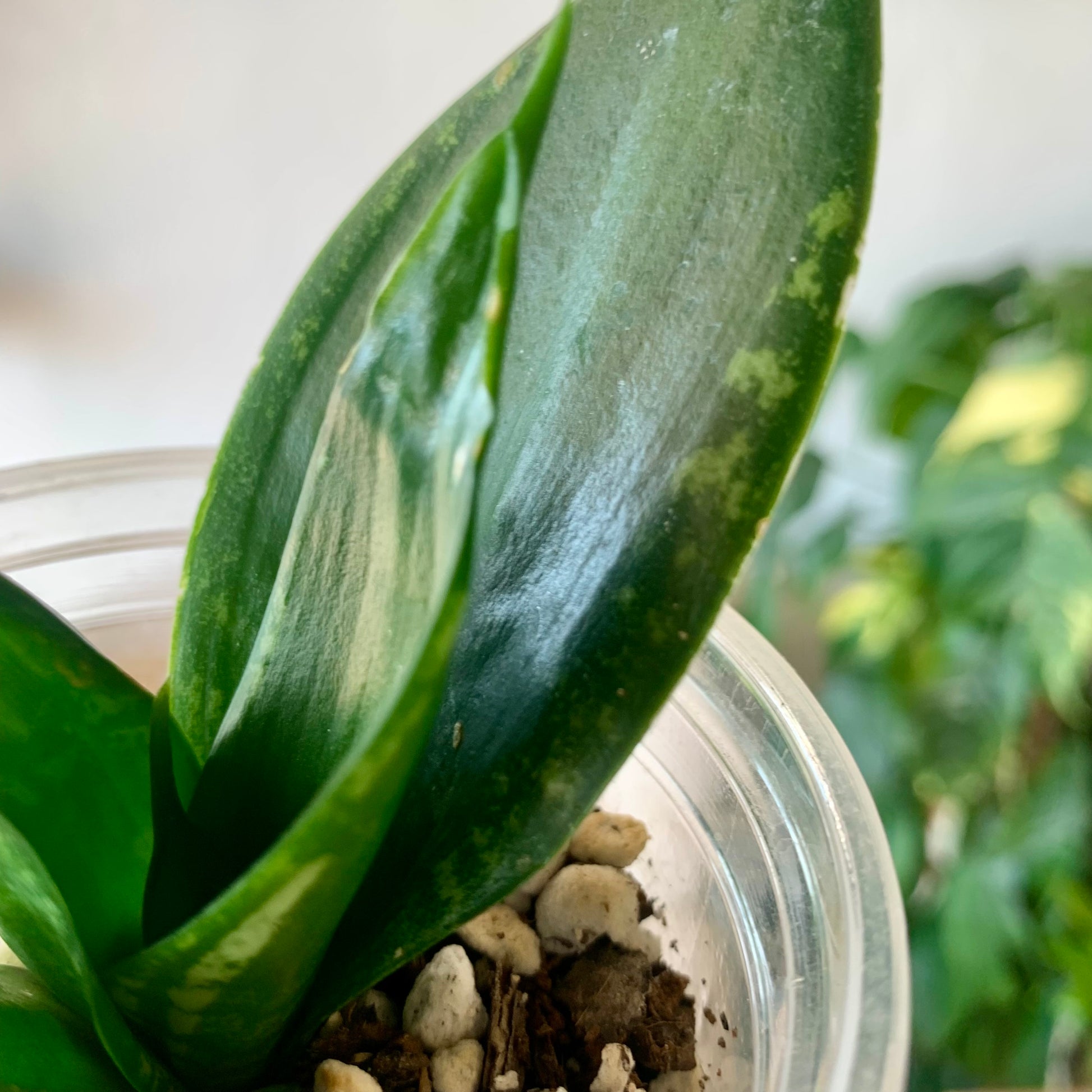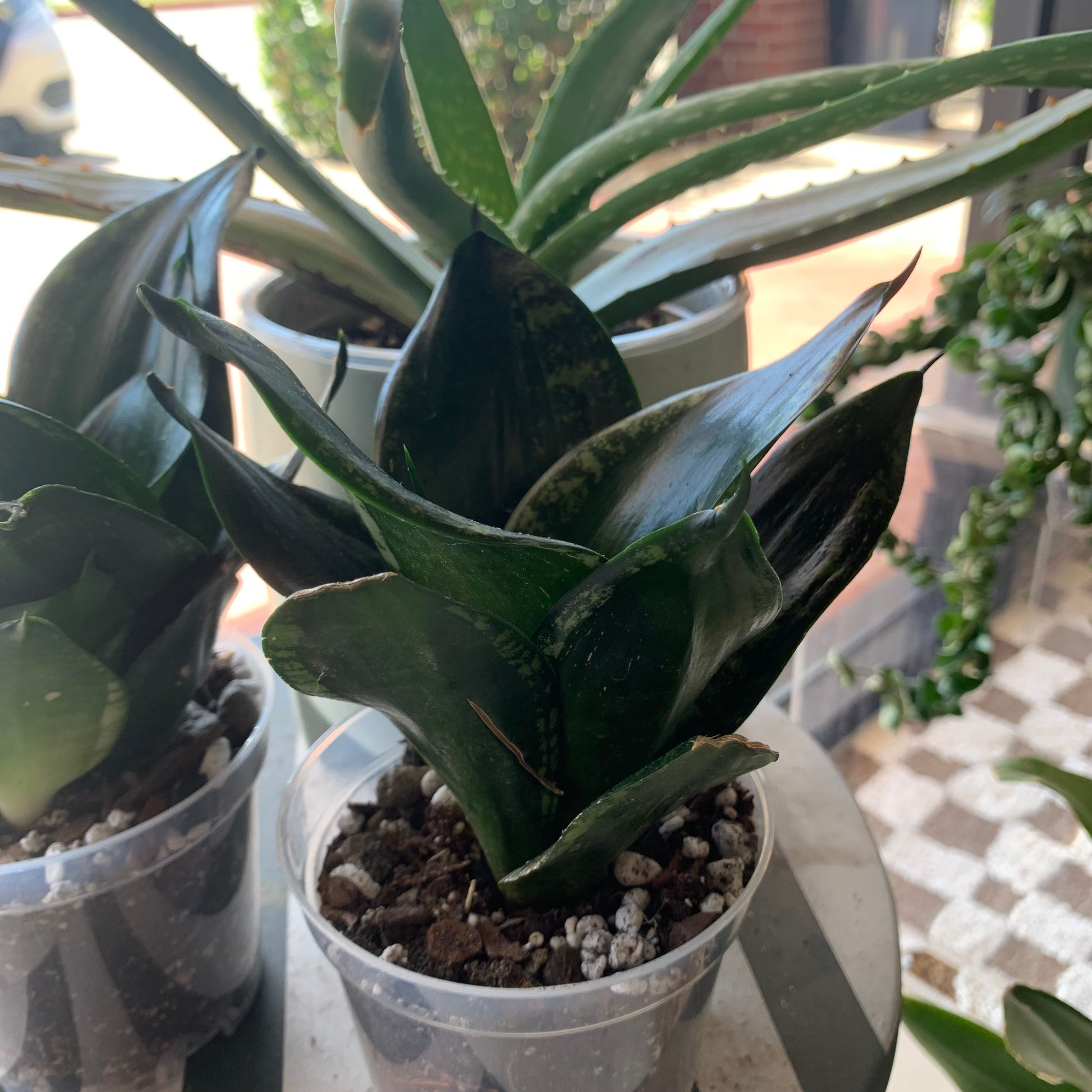 Scientific Name: Sansevieria trifasciata ‘Whitney’, common name Silver Flame snake plant.