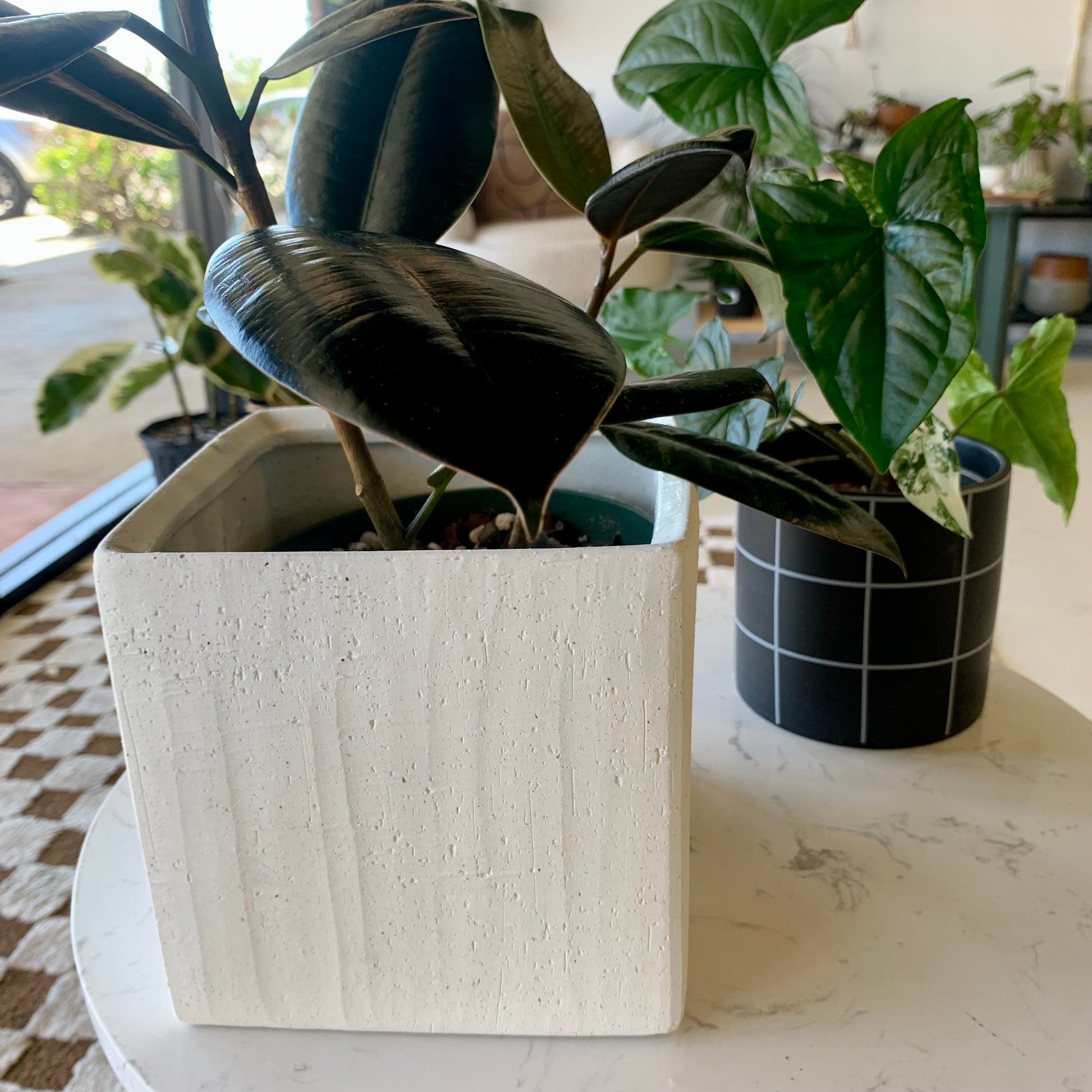 The perfect square planter with its unique texture from special clay and hand-scratching, making it an interesting yet neutral choice.