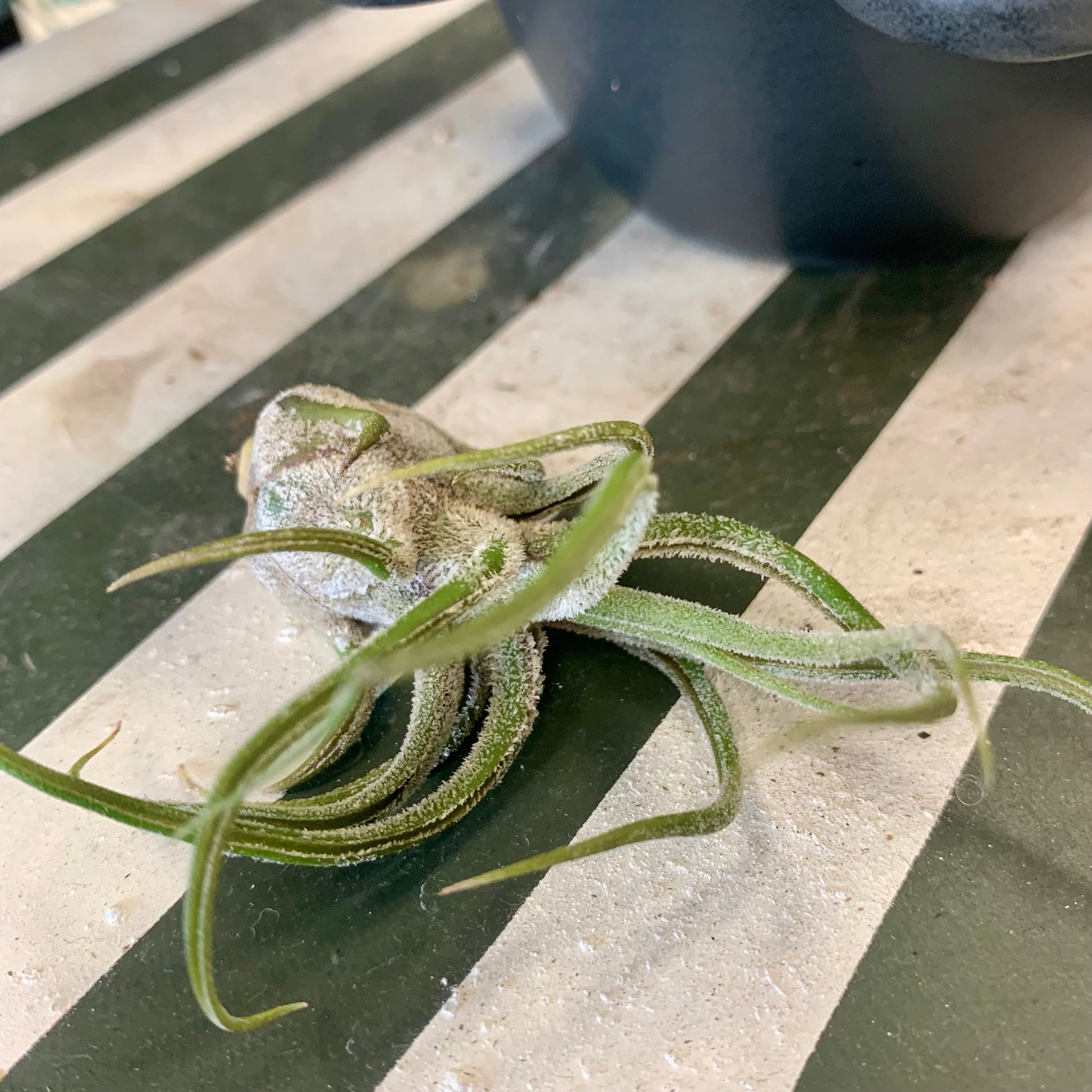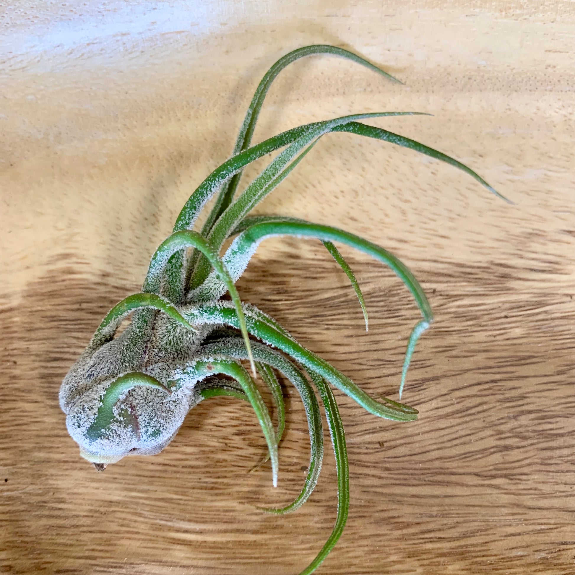 The Tillandsia Pruinosa Guatemala is a smaller air plant known for is its highly dense, fuzzy trichomes with legs that tend to spread out. This one can blush a beautiful deep reddish purple when grown in high light. Pruinosa Guatemala has an exotic nice shape and produces a bright pink flower.
